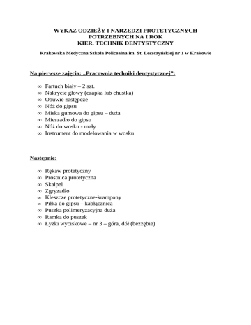WYKAZ ODZIEŻY I NARZĘDZI PROTETYCZNYCH POTRZEBNYCH NA I ROK KIER. TECHNIK DENTYSTYCZNY Krakowska Medyczna Szkoła Policealna im. St. Leszczyńskiej nr 1 w Krakowie Na pierwsze zajęcia: „Pracownia techniki dentystycznej”: • • • • • • • • Fartuch biały – 2 szt. Nakrycie głowy (czapka lub chustka) Obuwie zastępcze Nóż do gipsu Miska gumowa do gipsu – duża Mieszadło do gipsu Nóż do wosku - mały Instrument do modelowania w wosku Następnie: • • • • • • • • • Rękaw protetyczny Prostnica protetyczna Skalpel Zgryzadło Kleszcze protetyczne-krampony Piłka do gipsu – kabłącznica Puszka polimeryzacyjna duża Ramka do puszek Łyżki wyciskowe – nr 3 – góra, dół (bezzębie)