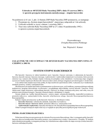 Uchwa³a nr 40/XXXII Rady Naczelnej ZHP z dnia 15 czerwca 2003 r. w sprawie przyjêcia instrumentu metodycznego stopnie harcerskie Na podstawie § 61 ust. 2, pkt. 2) Statutu ZHP Rada Naczelna ZHP postanawia, co nastêpuje: 1. Przyjmuje siê System stopni harcerskich, stanowi¹cy za³¹cznik nr 1 do uchwa³y. 2. Uchwa³a wchodzi w ¿ycie z dniem 1 wrzenia 2003 r. 3. Traci moc uchwa³a Rady Naczelnej ZHP nr 27 z dnia 10 padziernika 1992 r. w sprawie systemu stopni harcerskich. Przewodnicz¹cy Zwi¹zku Harcerstwa Polskiego hm. Wojciech J. Katner ZA£¥CZNIK NR 1 DO UCHWA£Y NR 40/XXXII RADY NACZELNEJ ZHP Z DNIA 15 CZERWCA 2003 R. SYSTEM STOPNI HARCERSKICH Dla harcerki i harcerza (w takim kontekcie nazw: harcerka i harcerz u¿ywamy w odniesieniu do harcerki i harcerza, harcerki starszej i harcerza starszego, wêdrowniczki i wêdrownika) stopieñ jest wyzwaniem, które pozwala zmierzyæ siê z samym sob¹. Kolejne stopnie wskazuj¹ im po¿¹dane cechy charakteru i wyznaczaj¹ etapy osi¹gniêæ ¿yciowych. Ka¿dy stopieñ jest dla harcerki i harcerza tak¿e celem, którego osi¹gniêcie jest dostrzegane w rodowisku. Czas zdobywania stopnia nazywamy prób¹, bo daje mo¿liwoæ sprawdzenia siebie, wykazania siê w konkretnym dzia³aniu postaw¹, wiedz¹ i umiejêtnociami. Dla dru¿ynowych stopnie harcerskie s¹ instrumentem wychowawczym, czyli rodkiem, za pomoc¹ którego realizuj¹ podstawowy program harcerskiego wychowania i uwzglêdniaj¹ indywidualny rozwój harcerki i harcerza. Przez zdobywanie stopni dru¿ynowi wprowadzaj¹ harcerki i harcerzy na drogê systematycznej pracy nad sob¹, ucz¹ ich pokonywania kolejnych progów i ³¹czenia w³asnych d¹¿eñ z dzia³aniem w zespole. System sk³ada siê z próby harcerki/harcerza i szeciu stopni: ochotniczki/m³odzika, tropicielki/wywiadowcy, pionierki/odkrywcy, samarytanki/æwika, harcerki orlej/harcerza orlego, harcerki Rzeczypospolitej/harcerza Rzeczypospolitej. Kolejne stopnie przeznaczone s¹ dla harcerek i harcerzy w okrelonym wieku: · harcerki i harcerze: ochotniczka-m³odzik, tropicielka-wywiadowca · harcerki starsze i harcerze starsi: pionierka-odkrywca, samarytanka-æwik · wêdrowniczki i wêdrownicy: harcerka orla-harcerz orli, harcerka Rzeczypospolitej-harcerz Rzeczypospolitej. Uk³ad wymagañ kolejnych stopni ró¿ni siê ze wzglêdu na specyfikê poszczególnych grup wiekowych. PRÓBA HARCERKI/HARCERZA Próba harcerki/harcerza przygotowuje do z³o¿enia Przyrzeczenia Harcerskiego. Idea i wymagania próby harcerki/ harcerza dotycz¹ kszta³towania harcerskiej postawy oraz podstawowej wiedzy o harcerstwie i Zwi¹zku. W ka¿dym indywidualnym przypadku wymagania powinny byæ sformu³owane odpowiednio do etapu rozwoju (wieku) harcerki i harcerza realizuj¹cych próbê. Próba harcerki/harcerza nie powinna trwaæ krócej ni¿ 3 miesi¹ce i d³u¿ej ni¿ 6 miesiêcy. W przypadku zuchów trzeciej gwiazdki nale¿y uwzglêdniæ przygotowanie, jakie otrzyma³y w gromadzie zuchowej i umo¿liwiæ im odbycie krótszej próby. IDEA STOPNIA Idea próby harcerza oraz idee poszczególnych stopni okrelaj¹ postawê, do jakiej harcerka i harcerz powinni d¹¿yæ, zdobywaj¹c dany stopieñ. Postawa ta jest zawsze zgodna z Przyrzeczeniem i Prawem Harcerskim: Próba harcerki/harcerza Stara siê zas³u¿yæ na miano harcerki/harcerza. Chce poznaæ harcerstwo i dostosowaæ siê do jego wymagañ, okrelonych w prawie i Przyrzeczeniu Harcerskim. Chce uczestniczyæ w ¿yciu zastêpu (patrolu) i dru¿yny. Ochotniczka-m³odzik Poznaje smak harcerskiej przygody. W swoim postêpowaniu kieruje siê Prawem Harcerskim. Pamiêta o codziennym dobrym uczynku. Chêtnie zdobywa nowe wiadomoci i umiejêtnoci przydatne w zastêpie, dru¿ynie, domu i szkole. Jest zaradna /zaradny, dzielna / dzielny i pogodna/ pogodny. Tropicielka-wywiadowca: Przestrzega Prawa i Przyrzeczenia Harcerskiego w codziennym ¿yciu. Zdobywa harcersk¹ wiedzê i doskonali umiejêtnoci z ró¿nych dziedzin. Tropi sytuacje, w których mo¿e byæ po¿yteczna/ po¿yteczny. Æwiczy swoj¹ spostrzegawczoæ i sprawnoæ. Aktywnie uczestniczy w zadaniach zastêpu i dru¿yny. Pionierka-odkrywca Ocenia siebie i swoje postêpowanie odwo³uj¹c siê do Prawa Harcerskiego. Potrafi radziæ sobie w ró¿nych sytuacjach. Mo¿na na niej/nim polegaæ. Jest uczynna/ uczynny, odwa¿na/ odwa¿ny, samodzielna / samodzielny. Wywi¹zuje siê z obowi¹zków, wynikaj¹cych z miejsca w dru¿ynie. Samarytanka-æwik Poszukuje wzorów do naladowania zgodnych z harcerskimi wartociami. Szuka sytuacji, w których mo¿e pomóc zgodnie z wyra¿on¹ w Przyrzeczeniu szczer¹ wol¹. Pracuje nad swoim charakterem. Poszukuje swoich zainteresowañ i pasji. Rozwija je zdobywaj¹c wiedzê i umiejêtnoci w wybranych dziedzinach. Wspó³tworzy ¿ycie dru¿yny. Harcerka orla-harcerz orli Kieruj¹c siê Prawem Harcerskim buduje swój w³asny system wartoci. Sama/ sam wyznacza swoje cele. Wybiera swoj¹ drogê ¿yciow¹. D¹¿y do mistrzostwa w wybranych dziedzinach. Podejmuje wyzwania. Znajduje pole sta³ej s³u¿by. Harcerz Rzeczypospolitej-harcerka Rzeczypospolitej Ma w³asny system wartoci wynikaj¹cy z Prawa Harcerskiego. Kieruje siê nim we wszystkich aspektach swojego ¿ycia. Potrafi godziæ pe³nione przeze siebie role, np. w rodzinie, w szkole, w pracy, w dzia³alnoci spo³ecznej. Osi¹ga mistrzostwo w wybranych dziedzinach aktywnoci. Jest wiadom¹ obywatelk¹/wiadomym obywatelem RP. Swoim ¿yciem daje wiadectwo o harcerstwie. ZASADY I TRYB ZDOBYWANIA STOPNI HARCERSKICH 1. 2. 3. 4. 5. Harcerka i harcerz zdobywaj¹ stopnie indywidualnie. Zdobywanie stopni rozpoczyna siê po z³o¿eniu Przyrzeczenia Harcerskiego. Harcerka i harcerz przystêpuj¹ do zdobywania stopni odpowiednich do etapu swojego rozwoju. Zadania na stopnie ochotniczki/m³odzika, tropicielki/wywiadowcy harcerki i harcerze realizuj¹ g³ównie przez aktywny udzia³ w ¿yciu dru¿yny. Nad ich zdobywaniem czuwaj¹ opiekunowie, którymi s¹ zgodnie ze zwyczajem rodowiska, n