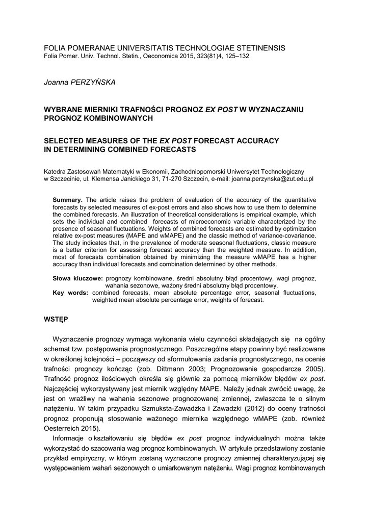 FOLIA POMERANAE UNIVERSITATIS TECHNOLOGIAE STETINENSIS Folia Pomer. Univ. Technol. Stetin., Oeconomica 2015, 323(81)4, 125–132 Joanna PERZYŃSKA WYBRANE MIERNIKI TRAFNOŚCI PROGNOZ EX POST W WYZNACZANIU PROGNOZ KOMBINOWANYCH SELECTED MEASURES OF THE EX POST FORECAST ACCURACY IN DETERMINING COMBINED FORECASTS Katedra Zastosowań Matematyki w Ekonomii, Zachodniopomorski Uniwersytet Technologiczny w Szczecinie, ul. Klemensa Janickiego 31, 71-270 Szczecin, e-mail: [email protected] Summary. The article raises the problem of evaluation of the accuracy of the quantitative forecasts by selected measures of ex-post errors and also shows how to use them to determine the combined forecasts. An illustration of theoretical considerations is empirical example, which sets the individual and combined forecasts of microeconomic variable characterized by the presence of seasonal fluctuations. Weights of combined forecasts are estimated by optimization relative ex-post measures (MAPE and wMAPE) and the classic method of variance-covariance. The study indicates that, in the prevalence of moderate seasonal fluctuations, classic measure is a better criterion for assessing forecast accuracy than the weighted measure. In addition, most of forecasts combination obtained by minimizing the measure wMAPE has a higher accuracy than individual forecasts and combination determined by other methods. Słowa kluczowe: prognozy kombinowane, średni absolutny błąd procentowy, wagi prognoz, wahania sezonowe, ważony średni absolutny błąd procentowy. Key words: combined forecasts, mean absolute percentage error, seasonal fluctuations, weighted mean absolute percentage error, weights of forecast. WSTĘP Wyznaczenie prognozy wymaga wykonania wielu czynności składających się na ogólny schemat tzw. postępowania prognostycznego. Poszczególne etapy powinny być realizowane w określonej kolejności – począwszy od sformułowania zadania prognostycznego, na ocenie trafności prognozy kończąc (zob. Dittmann 2003; Prognozowanie gospodarcze 2005). Trafność prognoz ilościowych określa się głównie za pomocą mierników błędów ex post. Najczęściej wykorzystywany jest miernik względny MAPE. Należy jednak zwrócić uwagę, że jest on wrażliwy na wahania sezonowe prognozowanej zmiennej, zwłaszcza te o silnym natężeniu. W takim przypadku Szmuksta-Zawadzka i Zawadzki (2012) do oceny trafności prognoz proponują stosowanie ważonego miernika względnego wMAPE (zob. również Oesterreich 2015). Informacje o kształtowaniu się błędów ex post prognoz indywidualnych można także wykorzystać do szacowania wag prognoz kombinowanych. W artykule przedstawiony zostanie przykład empiryczny, w którym zostaną wyznaczone prognozy zmiennej charakteryzującej się występowaniem wahań sezonowych o umiarkowanym natężeniu. Wagi prognoz kombinowanych J. Perzyńska 126 oszacowane zostaną metodą optymalizacji obu mierników względnych oraz klasyczną metodą wariancji–kowariancji. W toku badań zweryfikowana zostanie hipoteza mówiąca o tym, że prognozy otrzymane w wyniku optymalizacji miernika wMAPE charakteryzują się większą trafnością niż prognozy indywidualne oraz prognozy kombinowane, wyznaczane za pomocą pozostałych metod. METODY Po przeprowadzeniu pomiaru rzeczywistej wartości prognozowanej zmiennej wyznacza się zrealizowany błąd prognozy (błąd ex post), a jego wartość oblicza się dla każdego okresu / / momentu t na podstawie wzoru: et = y t − ft (1) gdzie: y t – realizacja prognozowanej zmiennej Y w okresie / momencie t (t = n + 1, n + 2, ..., n + j), ft – wartość prognozy zmiennej Y na okres / moment t. Na podstawie błędów prognoz ex post, oszacowanych dla kolejnych okresów, wyznacza się błędy średnie, charakteryzujące przedział empirycznej weryfikacji prognoz za pomocą jednej liczby (zob. Zeliaś 1997; Załuska 2000; Kwiatkowska-Ciotucha i Załuska 2002; Dittman 2003). Najczęściej stosowaną syntetyczną miarą jakości prognoz ex post jest miernik względny: 1 n + j y t − ft ⋅ 100% MAPE = ∑ (2) j t =n +1 y t Jest to tzw. średni absolutny błąd procentowy (mean absolute percentage error). Informuje on, o ile procent średnio prognozy odchylają się od rzeczywistych wartości prognozowanej zmiennej. Cechuje go łatwość zrozumienia i interpretacji uzyskanych wyników oraz duża przydatność decyzyjna (Armstrong i Collopy 1992). Miernik ten jest jednak wrażliwy na małe wartości prognozowanej zmiennej, przy takim samym module wartości zrealizowanego błędu ex post, występującego w liczniku wzoru (2), wyżej ocenia prognozy przeszacowane niż niedoszacowane. Aby uniknąć tego problemu w przypadku prognozowanej zmiennej z wahaniami sezonowymi, Szmuksta-Zawadzka i Zawadzki (2012) proponują stosowanie ważonego miernika względnego: n+ j n+ j (3) wMAPE = ∑ y t − ft ∑ y t ⋅ 100% t =n +1 t = n +1 Oba mierniki względne można również wykorzystać do oceny trafności prognoz kombinowanych, a także do wyznaczenia ich wag. Prognoza kombinowana ma postać średniej ważonej: m fcT = ∑ λ i fiT i =1 gdzie: i = 1, 2, ..., m (m ≥ 2), m – liczba prognoz składowych prognozy kombinowanej, fiT – i-ta prognoza indywidualna zmiennej Y na okres / moment T (T > n), λi – waga i-tej prognozy indywidualnej (0 ≤ λi ≤ 1). (4) Wybrane mierniki trafności prognoz 127 Klasyczna metoda szacowania wag prognozy (4) – metoda wariancji-kowariancji (VC), zaproponowana przez Batesa i Grangera (1969), a uogólniona przez Grangera i Newbolda (1974), polega na minimalizacji wariancji błędu prognozy kombinowanej (4). Szacując macierz wariancji–kowariancji Σ na próbie, otrzymujemy estymator wektora współczynników kombinacji o postaci: Σˆ −1i (5) λˆ = i ' Σˆ −1i gdzie: Σˆ ij = T −1 ∑ eit e jt (6) t =T −k λ = [λ 1 λ 2 K λ m ]' , i = [1 1 K 1] , ' j = 1, 2, ..., m, eiT – błąd ex post prognozy fiT. Kaźmierska-Zatoń i 
