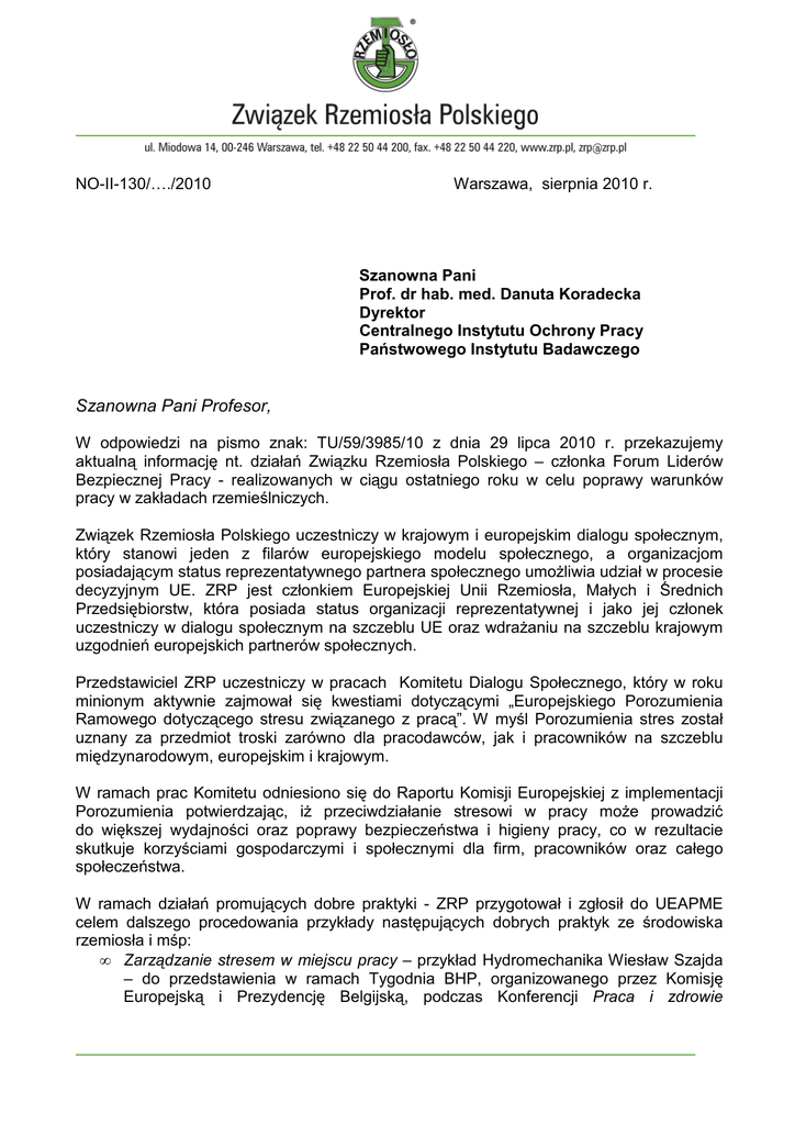 NO-II-130/…./2010 Warszawa, sierpnia 2010 r. Szanowna Pani Prof. dr hab. med. Danuta Koradecka Dyrektor Centralnego Instytutu Ochrony Pracy Państwowego Instytutu Badawczego Szanowna Pani Profesor, W odpowiedzi na pismo znak: TU/59/3985/10 z dnia 29 lipca 2010 r. przekazujemy aktualną informację nt. działań Związku Rzemiosła Polskiego – członka Forum Liderów Bezpiecznej Pracy - realizowanych w ciągu ostatniego roku w celu poprawy warunków pracy w zakładach rzemieślniczych. Związek Rzemiosła Polskiego uczestniczy w krajowym i europejskim dialogu społecznym, który stanowi jeden z filarów europejskiego modelu społecznego, a organizacjom posiadającym status reprezentatywnego partnera społecznego umoŜliwia udział w procesie decyzyjnym UE. ZRP jest członkiem Europejskiej Unii Rzemiosła, Małych i Średnich Przedsiębiorstw, która posiada status organizacji reprezentatywnej i jako jej członek uczestniczy w dialogu społecznym na szczeblu UE oraz wdraŜaniu na szczeblu krajowym uzgodnień europejskich partnerów społecznych. Przedstawiciel ZRP uczestniczy w pracach Komitetu Dialogu Społecznego, który w roku minionym aktywnie zajmował się kwestiami dotyczącymi „Europejskiego Porozumienia Ramowego dotyczącego stresu związanego z pracą”. W myśl Porozumienia stres został uznany za przedmiot troski zarówno dla pracodawców, jak i pracowników na szczeblu międzynarodowym, europejskim i krajowym. W ramach prac Komitetu odniesiono się do Raportu Komisji Europejskiej z implementacji Porozumienia potwierdzając, iŜ przeciwdziałanie stresowi w pracy moŜe prowadzić do większej wydajności oraz poprawy bezpieczeństwa i higieny pracy, co w rezultacie skutkuje korzyściami gospodarczymi i społecznymi dla firm, pracowników oraz całego społeczeństwa. W ramach działań promujących dobre praktyki - ZRP przygotował i zgłosił do UEAPME celem dalszego procedowania przykłady następujących dobrych praktyk ze środowiska rzemiosła i mśp: • Zarządzanie stresem w miejscu pracy – przykład Hydromechanika Wiesław Szajda – do przedstawienia w ramach Tygodnia BHP, organizowanego przez Komisję Europejską i Prezydencję Belgijską, podczas Konferencji Praca i zdrowie psychiczne - Właściwe zarządzanie ryzykiem psychofizycznym w miejscu pracy, w warunkach procesów restrukturyzacyjnych, Bruksela, 22-24 listopada 2010 r. • Dodatkowo przykład ten będzie prezentowany podczas spotkania organizowanego przez Avignon Academy i UEAPME w ramach projektu „BHP w kontekście kryzysu i restrukturyzacji”, Rzym 15-17 września 2010. Związek Rzemiosła Polskiego prowadzi działania związane z udziałem przedstawiciela organizacji rzemiosła w przygotowywanej przez EUROGIP konferencji na temat „Zapobieganie zagroŜeniom podczas pracy w małych i średnich przedsiębiorstw: jakie działania w Europie?”, która odbędzie się w dniu 14 października 2010 r. w ParyŜu. Europejska Agencja Bezpieczeństwa i Zdrowia w Pracy monitoruje, gromadzi i analizuje wyniki badań naukowych, informacji statystycznych i środków zapobiegawczych. Wspiera równieŜ wymianę i udostępnianie informacji W ramach programu konferencji zaprezentowane zostaną przykłady działań podejmowanych w Europie w celu zapobiegania zagroŜeniom podczas pracy w małych i średnich przedsiębiorstw. Przedstawiciel ZRP przedstawi doświadczenia ze współpracy organizacji rzemiosła z instytucjami zajmującymi się warunkami pracy w Polsce. Celem jest zaprezentowanie wypracowanych form współdziałania tych instytucji na rzecz poprawy bezpieczeństwa i higieny pracy i w tym kontekście zostaje eksponowana współpraca z Centralnym Instytutem Ochrony Pracy oraz Forum Liderów Bezpiecznej Pracy. ZRP reprezentując pracodawców, właścicieli małych zakładów rzemieślniczych, prowadzi wraz z terenowymi organizacjami – izbami i cechami, działalność promującą zagadnienia bhp w swoim środowisku. Ze względu na wielobranŜowość środowiska (ponad 110 zawodów) jest bardzo trudno obiektywnie ocenić i skwantyfikować skuteczność tych działań. Zakłady rzemieślnicze funkcjonują w bardzo róŜnych warunkach, a za ich stan odpowiadają sami pracodawcy. Rolą organizacji rzemiosła jest tworzenie róŜnych pomostów współpracy oraz podejmowanie działań mających na celu nie tylko dostarczenie potrzebnych informacji z zakresu bezpiecznej i higienicznej pracy, ale takŜe uwraŜliwianie pracodawców rzemieślników na kwestie związane z zabezpieczeniem oraz poprawą warunków pracy. Stan warunków pracy nie we wszystkich zakładach rzemieślniczych jest satysfakcjonujący. Jest to często efekt powierzchownej wiedzy z zakresu prawa pracy oraz przepisów bhp wśród pracodawców i pracowników. Będąc świadomymi tej sytuacji promujemy zmiany postaw i poprawę stanu wiedzy w tej dziedzinie pośród pracowników młodocianych, pracodawców-rzemieślników i organizacji rzemiosła, które zobowiązane są – zgodnie z przepisami ustawowymi i statutowymi - do realizacji działalności doradczej i informacyjnej związanej z wykonywaniem rzemiosła. Zadanie to realizowane jest głównie w formach organizowania szkoleń oraz doradztwa dla pracodawców, najczęściej przy współpracy z Państwową Inspekcją Pracy, ale nie tylko. Wybrane działania ZRP z tego obszaru to: 1) Organizowane co roku przez izby i cechy szkolenia bhp dla rzemieślników oraz zatrudnionych w tych zakładach pracowników. Tego typu działalność prowadzona jest na terenie wszystkich 27 zrzeszonych izb rzemieślniczych , a rozmiary tej działalności w skali roku determinowane są regionalnymi potrzebami. 2) Promowanie i współorganizowanie konkursu Państwowej Inspekcji Pracy pn. „Pracodawca organizator pracy bezpiecznej” - Związek Rzemiosła oraz izby i cechy ideę konkursu upowszechniają w środowisku małych i średnich firm rzemieślniczych. Dotychczas 44 pracodawców reprezentujących rzemiosło