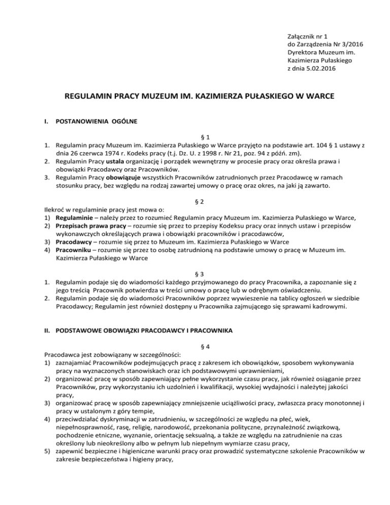 Załącznik nr 1 do Zarządzenia Nr 3/2016 Dyrektora Muzeum im. Kazimierza Pułaskiego z dnia 5.02.2016 REGULAMIN PRACY MUZEUM IM. KAZIMIERZA PUŁASKIEGO W WARCE I. POSTANOWIENIA OGÓLNE §1 1. Regulamin pracy Muzeum im. Kazimierza Pułaskiego w Warce przyjęto na podstawie art. 104 § 1 ustawy z dnia 26 czerwca 1974 r. Kodeks pracy (t.j. Dz. U. z 1998 r. Nr 21, poz. 94 z późń. zm). 2. Regulamin Pracy ustala organizację i porządek wewnętrzny w procesie pracy oraz określa prawa i obowiązki Pracodawcy oraz Pracowników. 3. Regulamin Pracy obowiązuje wszystkich Pracowników zatrudnionych przez Pracodawcę w ramach stosunku pracy, bez względu na rodzaj zawartej umowy o pracę oraz okres, na jaki ją zawarto. §2 Ilekroć w regulaminie pracy jest mowa o: 1) Regulaminie – należy przez to rozumieć Regulamin pracy Muzeum im. Kazimierza Pułaskiego w Warce, 2) Przepisach prawa pracy – rozumie się przez to przepisy Kodeksu pracy oraz innych ustaw i przepisów wykonawczych określających prawa i obowiązki pracowników i pracodawców, 3) Pracodawcy – rozumie się przez to Muzeum im. Kazimierza Pułaskiego w Warce 4) Pracowniku – rozumie się przez to osobę zatrudnioną na podstawie umowy o pracę w Muzeum im. Kazimierza Pułaskiego w Warce §3 1. Regulamin podaje się do wiadomości każdego przyjmowanego do pracy Pracownika, a zapoznanie się z jego treścią Pracownik potwierdza w treści umowy o pracę lub w odrębnym oświadczeniu. 2. Regulamin podaje się do wiadomości Pracowników poprzez wywieszenie na tablicy ogłoszeń w siedzibie Pracodawcy; Regulamin jest również dostępny u Pracownika zajmującego się sprawami kadrowymi. II. PODSTAWOWE OBOWIĄZKI PRACODAWCY I PRACOWNIKA §4 Pracodawca jest zobowiązany w szczególności: 1) zaznajamiać Pracowników podejmujących pracę z zakresem ich obowiązków, sposobem wykonywania pracy na wyznaczonych stanowiskach oraz ich podstawowymi uprawnieniami, 2) organizować pracę w sposób zapewniający pełne wykorzystanie czasu pracy, jak również osiąganie przez Pracowników, przy wykorzystaniu ich uzdolnień i kwalifikacji, wysokiej wydajności i należytej jakości pracy, 3) organizować pracę w sposób zapewniający zmniejszenie uciążliwości pracy, zwłaszcza pracy monotonnej i pracy w ustalonym z góry tempie, 4) przeciwdziałać dyskryminacji w zatrudnieniu, w szczególności ze względu na płeć, wiek, niepełnosprawność, rasę, religię, narodowość, przekonania polityczne, przynależność związkową, pochodzenie etniczne, wyznanie, orientację seksualną, a także ze względu na zatrudnienie na czas określony lub nieokreślony albo w pełnym lub niepełnym wymiarze czasu pracy, 5) zapewnić bezpieczne i higieniczne warunki pracy oraz prowadzić systematyczne szkolenie Pracowników w zakresie bezpieczeństwa i higieny pracy, 6) terminowo i prawidłowo wypłacać wynagrodzenie, 7) ułatwiać Pracownikom podnoszenie kwalifikacji zawodowych, 8) stwarzać Pracownikom podejmującym zatrudnienie po ukończeniu szkoły prowadzącej kształcenie zawodowe lub szkoły wyższej warunki sprzyjające przystosowaniu się do należytego wykonywania pracy, 9) zaspokajać w miarę posiadanych środków socjalne potrzeby Pracowników, 10) stosować obiektywne i sprawiedliwe kryteria oceny Pracowników oraz wyników ich pracy, 11) prowadzić dokumentację w sprawach związanych ze stosunkiem pracy oraz akta Pracowników, 12) przechowywać dokumentację w sprawach związanych ze stosunkiem pracy oraz akta osobowe Pracowników w warunkach niegrożących uszkodzeniem lub zniszczeniem, 13) wpływać na kształtowanie w zakładzie pracy zasad współżycia społecznego. 1. 2. 3. 4. §5 Pracownik jest obowiązany wykonywać pracę sumiennie i starannie oraz stosować się do poleceń przełożonych, które dotyczą pracy, jeżeli nie są one sprzeczne z przepisami prawa lub umową o pracę, a także wykorzystywać czas pracy w pełni na pracę zawodową. Do podstawowych obowiązków Pracownika należy w szczególności: 1) rzetelne i efektywne wykonywanie pracy, 2) dokładne i sumienne realizowanie obowiązujących standardów, procedur, instrukcji i innych zarządzeń Pracodawcy, 3) przestrzeganie czasu pracy ustalonego w zakładzie pracy, 4) przestrzeganie Regulaminu Pracy ustalonego w zakładzie pracy, 5) przestrzeganie przepisów oraz zasad bezpieczeństwa i higieny pracy, a także przepisów przeciwpożarowych, 6) dbanie o dobro zakładu pracy, chronienie jego mienia oraz zachowanie w tajemnicy informacji, których ujawnienie mogłoby narazić Pracodawcę na szkodę, a w szczególności informacji dotyczących systemów zabezpieczających , rozmieszczenia zbiorów, transportu obiektów muzealnych, dozoru, wartości zbiorów i cen (w tym cen zakupu), 7) podnoszenie kwalifikacji zawodowych oraz doskonalenie umiejętności pracy, 8) przestrzeganie tajemnicy określonej w odrębnych przepisach, 9) przestrzeganie zasad współżycia społecznego, 10) kulturalne i taktowne zachowywanie się w stosunku do gości muzeum (zwiedzających, uczestników imprez okolicznościowych, interesantów). Pracownik obowiązany jest niezwłocznie informować Pracodawcę o wszelkich zmianach danych osobowych wymaganych na podstawie obowiązujących przepisów prawa, a zwłaszcza mających wpływ na prawidłową wypłatę wynagrodzenia i innych świadczeń. Pracownik jest zobowiązany do przestrzegania Kodeksu Etyki stanowiącego załącznik Nr 1 do Regulaminu. §6 1. Eliminowanie wszelkich przejawów dyskryminacji i mobbingu jest w interesie zarówno Pracowników, jak i Pracodawcy. 2. Zabrania się nieuzasadnionego wykorzystania uprzywilejowanej pozycji zawodowej w relacji przełożony – pracownik. 3. Pracownicy zobowiązani są do przestrzegania zakazu dyskryminacji i mobbingu wobec swoich współpracowników. 4. Każdy Pracownik zobowiązany jest do odpowiedniego reagowania na zauważone w zakładzie pracy przejawy dyskryminacji lub mobbingu. 
