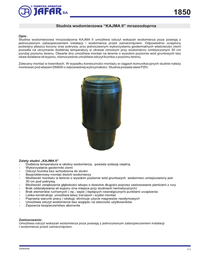 1850 Studnia wodomierzowa “KAJMA II” mrozoodoprna Opis: Studnia wodomierzowa mrozoodporna KAJMA II umożliwia odczyt wskazań wodomierza poza posesją z jednoczesnym zabezpieczeniem instalacji i wodomierza przed zamarznięciem. Odpowiednio ocieplony podwójny płaszcz boczny oraz pokrywa, przy jednoczesnym wykorzystaniu geotermalnych właściwości ziemi pozwala na utrzymanie dodatniej temperatury w okresie zimowym przy wodomierzu umieszczonym 30 cm poniżej poziomu terenu. Otwarte dno umożliwia montaż na terenie o wysokim poziomie wód gruntowych bez obaw działania sił wyporu, równocześnie umożliwia odczyt licznika z poziomu terenu. Zalecany montaż w trawnikach. W wypadku konieczności montażu w ciągach komunikacyjnych studnie należy montować pod włazem DN600 o odpowiedniej wytrzymałości. Studnia posiada atest PZH. Zastosowanie: Umożliwia odczyt wskazań wodomierza poza posesją z jednoczesnym zabezpieczeniem instalacji i wodomierza przed zamarznięciem. 20090406 1850 1. Pokrywa z korkiem izolującym- tworzywo. 2. Korpus górny studni z izolacją. 3. Korpus dolny studni. 4. Kołnierz. 5. Uchwyt pod zestaw wodomierza. Warianty wykonania studni KAJMA II W skład zestawu wodomierzowego wchodzą: - Zawory odcinające Zawór antyskażeniowy typ EA Złączki PE DN 32 ( 25, 40 ) Łączniki wodomierza Dane techniczne: Średnica wewnętrzna: 500mm Głębokość: 1200mm - możliwość zwiększenia głębokości wkopu o dowolne długości poprzez zastosowanie pierścieni z rury ( nr 6 ), np. typu X-Stream ( Wavin DN 450, kod: 3011521005 ) lub PRAGMA ( PIPE LIFE DN 500, kod: 24005060 ) Do montażu wodomierzy DN15,20,25 Przykładowe schematy konsol wodomierza Odcinki przed i za wodomierzem są wykonane współosiowo. Wodomierz instaluje się za pomocą łączników umożliwiający jego łatwy montaż i demontaż. W konsoli zachowana jest zalecana długość odcinków prostych przed (5xDN) i za (3xDN) wodomierzem Schemat konsoli na dwa wodomierze, np.: stosowany często w przypadku dodatkowego wodomierz do tzw. „podlewania trawników”. Na życzenie klienta możliwa różna konfiguracja elementów konsoli, np.: łączniki wodomierza zawory odcinające zawór antyskażeniowy zawór odpowietrzający złącza PE Zamawiając proszę podać: 1. 2. 3. 4. Średnicę wodomierza Ilość wodomierzy Średnicę rury przyłącza Ewentualne inne wymagania Dodatkowe wyposażenie montowane na życzenie, studnia może służyć również do zabezpieczenia przed przemarzaniem innych urządzeń na instalacji wodociągowej Producent zastrzega sobie prawo wnoszenia zmian wynikających z rozwoju produktu. 20090406