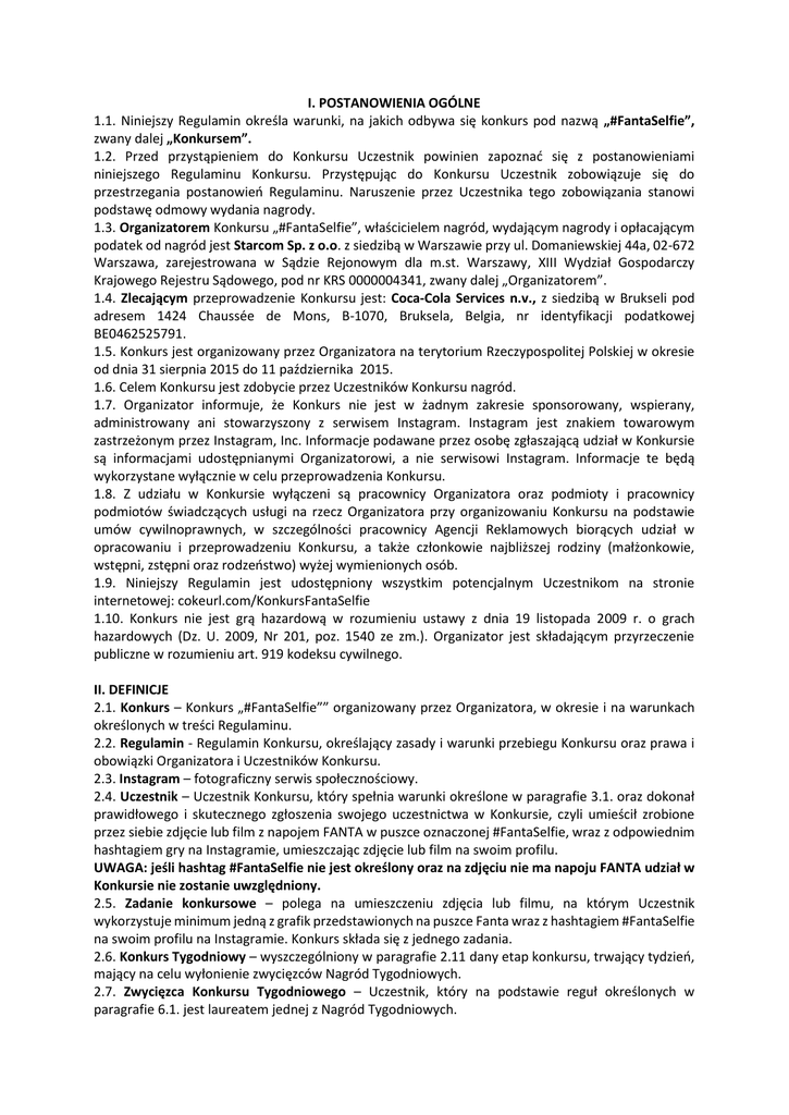 I. POSTANOWIENIA OGÓLNE 1.1. Niniejszy Regulamin określa warunki, na jakich odbywa się konkurs pod nazwą „#FantaSelfie”, zwany dalej „Konkursem”. 1.2. Przed przystąpieniem do Konkursu Uczestnik powinien zapoznać się z postanowieniami niniejszego Regulaminu Konkursu. Przystępując do Konkursu Uczestnik zobowiązuje się do przestrzegania postanowień Regulaminu. Naruszenie przez Uczestnika tego zobowiązania stanowi podstawę odmowy wydania nagrody. 1.3. Organizatorem Konkursu „#FantaSelfie”, właścicielem nagród, wydającym nagrody i opłacającym podatek od nagród jest Starcom Sp. z o.o. z siedzibą w Warszawie przy ul. Domaniewskiej 44a, 02-672 Warszawa, zarejestrowana w Sądzie Rejonowym dla m.st. Warszawy, XIII Wydział Gospodarczy Krajowego Rejestru Sądowego, pod nr KRS 0000004341, zwany dalej „Organizatorem”. 1.4. Zlecającym przeprowadzenie Konkursu jest: Coca-Cola Services n.v., z siedzibą w Brukseli pod adresem 1424 Chaussée de Mons, B-1070, Bruksela, Belgia, nr identyfikacji podatkowej BE0462525791. 1.5. Konkurs jest organizowany przez Organizatora na terytorium Rzeczypospolitej Polskiej w okresie od dnia 31 sierpnia 2015 do 11 października 2015. 1.6. Celem Konkursu jest zdobycie przez Uczestników Konkursu nagród. 1.7. Organizator informuje, że Konkurs nie jest w żadnym zakresie sponsorowany, wspierany, administrowany ani stowarzyszony z serwisem Instagram. Instagram jest znakiem towarowym zastrzeżonym przez Instagram, Inc. Informacje podawane przez osobę zgłaszającą udział w Konkursie są informacjami udostępnianymi Organizatorowi, a nie serwisowi Instagram. Informacje te będą wykorzystane wyłącznie w celu przeprowadzenia Konkursu. 1.8. Z udziału w Konkursie wyłączeni są pracownicy Organizatora oraz podmioty i pracownicy podmiotów świadczących usługi na rzecz Organizatora przy organizowaniu Konkursu na podstawie umów cywilnoprawnych, w szczególności pracownicy Agencji Reklamowych biorących udział w opracowaniu i przeprowadzeniu Konkursu, a także członkowie najbliższej rodziny (małżonkowie, wstępni, zstępni oraz rodzeństwo) wyżej wymienionych osób. 1.9. Niniejszy Regulamin jest udostępniony wszystkim potencjalnym Uczestnikom na stronie internetowej: cokeurl.com/KonkursFantaSelfie 1.10. Konkurs nie jest grą hazardową w rozumieniu ustawy z dnia 19 listopada 2009 r. o grach hazardowych (Dz. U. 2009, Nr 201, poz. 1540 ze zm.). Organizator jest składającym przyrzeczenie publiczne w rozumieniu art. 919 kodeksu cywilnego. II. DEFINICJE 2.1. Konkurs – Konkurs „#FantaSelfie”” organizowany przez Organizatora, w okresie i na warunkach określonych w treści Regulaminu. 2.2. Regulamin - Regulamin Konkursu, określający zasady i warunki przebiegu Konkursu oraz prawa i obowiązki Organizatora i Uczestników Konkursu. 2.3. Instagram – fotograficzny serwis społecznościowy. 2.4. Uczestnik – Uczestnik Konkursu, który spełnia warunki określone w paragrafie 3.1. oraz dokonał prawidłowego i skutecznego zgłoszenia swojego uczestnictwa w Konkursie, czyli umieścił zrobione przez siebie zdjęcie lub film z napojem FANTA w puszce oznaczonej #FantaSelfie, wraz z odpowiednim hashtagiem gry na Instagramie, umieszczając zdjęcie lub film na swoim profilu. UWAGA: jeśli hashtag #FantaSelfie nie jest określony oraz na zdjęciu nie ma napoju FANTA udział w Konkursie nie zostanie uwzględniony. 2.5. Zadanie konkursowe – polega na umieszczeniu zdjęcia lub filmu, na którym Uczestnik wykorzystuje minimum jedną z grafik przedstawionych na puszce Fanta wraz z hashtagiem #FantaSelfie na swoim profilu na Instagramie. Konkurs składa się z jednego zadania. 2.6. Konkurs Tygodniowy – wyszczególniony w paragrafie 2.11 dany etap konkursu, trwający tydzień, mający na celu wyłonienie zwycięzców Nagród Tygodniowych. 2.7. Zwycięzca Konkursu Tygodniowego – Uczestnik, który na podstawie reguł określonych w paragrafie 6.1. jest laureatem jednej z Nagród Tygodniowych. 2.8. Komisja konkursowa - powołana przez Organizatora Komisja w składzie 3 (trzech) osób, czuwająca nad poprawnym przebiegiem Konkursu, realizująca wszelkie powierzone jej przez Organizatora zadania, opisane treścią Regulaminu, w związku z organizacją Konkursu, w tym w szczególności wyłaniająca Zwycięzców Konkursów Tygodniowych na zasadach wskazanych Regulaminem. Do kompetencji Komisji należeć będzie również rozpatrywanie wpływających od Uczestników Konkursu reklamacji. 2.9. Czas trwania konkursu – okres, który jest liczony od dnia 31 sierpnia 2015 do 11 października 2015. 2.10. Nagrody Tygodniowe – nagrody przyznawane Zwycięzcom Konkursu Tygodniowego po zakończeniu danego Etapu Konkursu. 2.11. Etapy konkursu - Konkurs obejmuje 6 etapów: - Etap 1 - od dnia 31 sierpnia 2015 od godziny 11:00:00, do dnia 6 września 2015 roku do godziny 23:59:59; - Etap 2 - od dnia 7 września 2015 od godziny 11:00:00, do dnia 13 września 2015 roku do godziny 23:59:59; - Etap 3 - od dnia 14 września 2015 od godziny 11:00:00, do dnia 20 września 2015 roku do godziny 23:59:59; - Etap 4 - od dnia 21 września 2015 od godziny 11:00:00, do dnia 27 września 2015 roku do godziny 23:59:59; - Etap 5 - od dnia 28 września 2015 od godziny 11:00:00, do dnia 4 października 2015 roku do godziny 23:59:59; - Etap 6 - od dnia 5 października 2015 od godziny 11:00:00, do dnia 11 października 2015 roku do godziny 23:59:59; III. UCZESTNICY KONKURSU 3.1. W Konkursie mogą uczestniczyć wyłącznie osoby fizyczne, które w momencie wzięcia udziału w Konkursie: a) ukończyły 18 rok życia. Osoby, które ukończyły 13 rok życia, a nie ukończyły 18 lat, mogą wziąć udział w Konkursie za zgodą opiekunów prawnych; b) posiadają pełną zdolność do czynności prawnych; c) posiadają aktywne konto na portalu Instagram; d) posiadają miejsce zamieszkania na terenie Polski – Konkurs przeznaczony jest wyłącznie dla osób zamieszkujących na