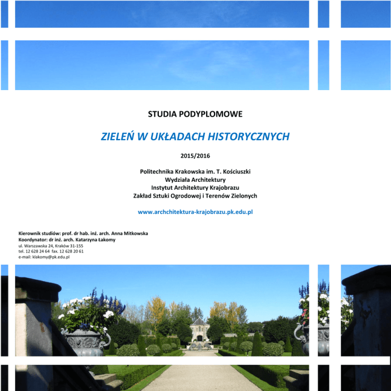 STUDIA PODYPLOMOWE ZIELEŃ W UKŁADACH HISTORYCZNYCH 2015/2016 Politechnika Krakowska im. T. Kościuszki Wydziała Architektury Instytut Architektury Krajobrazu Zakład Sztuki Ogrodowej i Terenów Zielonych www.archchitektura-krajobrazu.pk.edu.pl Kierownik studiów: prof. dr hab. inż. arch. Anna Mitkowska Koordynator: dr inż. arch. Katarzyna Łakomy ul. Warszawska 24, Kraków 31-155 tel. 12 628 24 64 fax. 12 628 20 61 e-mail: [email protected] Cel studiów Celem Studium Podyplomowego jest podnoszenia kwalifikacji i kompetencji słuchaczy reprezentujących różne zawody, aktualizacja i poszerzenie wiedzy na temat badao, ochrony, konserwacji, urządzania i pielęgnacji trenów zabytkowej zieleni o różnorodnej genezie, formie i funkcji. Interdyscyplinarny program Studium, z zakresu szeroko rozumianego dziedzictwa sztuki ogrodowej i krajobrazu historycznego, obejmuje zagadnienia: roli zieleni dla dziedzictwa kulturowego i budowania tożsamości miejsca, historii sztuki ogrodowej, elementów architektury i urbanistyki, charakterystyki roślinnośd zabytkowej, konserwacji i rewaloryzacji zabytkowych obiektów krajobrazowych, zielenina obszarach rewitalizowanych, badao zieleni zabytkowej, jej urządzania i pielęgnacji, prawnych uwarunkowao działao na obszarach zieleni historycznej i zasad sporządzania dokumentacji konserwatorskiej, ochrony i kształtowania krajobrazu w planowaniu przestrzennym. W ramach wymienionych powyżej bloków tematycznych, słuchacze studiów uzyskują niezbędną wiedzę teoretyczną, dwiczenia pozwolą na zapoznanie się z metodyką badawczą i technicznymi aspektami różnorodnej tematyki dotyczącej zieleni zabytkowej, a seminaria w terenie na praktyczne rozeznanie stanu zieleni historycznej na wielu wybranych przykładach. Wykładowcy Kadrę naukowo-dydaktyczną studiów stanowią wysoko kwalifikowani specjaliści z dziedziny architektury krajobrazu, historii ogrodów, konserwacji zielni, zabytków i urbanistyki, ochrony dziedzictwa kulturowego, reprezentujących uczelnie i instytucje naukowe i samorządowe (m. in.: PK, PWr, NID, AGH, UJ, WUOZ), a także pracownie, biura projektowe i realizacyjne. Uczestnicy Studia przeznaczone są absolwentów kierunków artystycznych, w tym plastyków, architektów, architektów krajobrazu, konserwatorów, inżynierów i konstruktorów, historyków sztuki oraz dla osób, których praca lub zainteresowania wiążą się z tematyką studiów. Lokalizacja Zajęcia obywają się w salach Instytutu Architektury Krajobrazu Politechniki Krakowskiej (Kraków, ul. Warszawska 24) oraz w terenie. Czas trwania 2 semestry, 190 godzin wykładów, dwiczeo oraz seminaria w terenie. Zajęcia odbywają się w piątki po południu i w soboty, co dwa tygodnie (+ studialne wyjazdy 2-dniowe sobota - niedziela), pierwsza edycja w okresie 02.03.2015 - 23.01.2016. Koszt Udział w studium jest odpłatny, łączny koszt 4720 zł (2semestry) płatne w całości lub dwóch ratach Numer konta podany zostanie po zakwalifikowaniu Ilośd kandydatów Ilośd miejsc jest ograniczona. O przyjęciu decyduje kolejnośd zgłoszeo. Rozpoczęcie rekrutacji 01.12.2014 - 31.01.2015, ogłoszenie wyników postępowania kwalifikacyjnego 03.02.2015. Wymagania dla kandydatów: - ukooczenie studiów wyższych (tytuł magistra lub co najmniej inżyniera), - złożenie dokumentów kwalifikacyjnych, - wniesienie opłaty w wyznaczonym terminie (podanym po zakooczeniu rekrutacji osobom zakwalifikowanym). Wymagane dokumenty do zgłoszenia: - karta zgłoszenia - prosimy wysład na adres mailowy: [email protected] - dwie fotografie - ksero dyplomu ukooczenia studiów PROGRAM RAMOWY Bloki tematyczne 1. Dziedzictwo kulturowe i tożsamośd miejsca - zieleo zabytkowa, jako dziedzictwo kulturowe - wartości ogrodu zabytkowego - konserwacja zieleni zabytkowej, cel i zasady 2. Historia sztuki ogrodowej, architektury ,urbanistyki i krajobrazów - typy i funkcje zieleni w epokach historycznych, - zieleo w urbanistyce - formy i kompozycje roślinne w układach zabytkowych - historyczne krajobrazy - historia introdukcji roślin - zakładanie ogrodów w świetle historycznych publikacji 3. Konserwacja i rewaloryzacja zabytkowych obiektów krajobrazowych - konserwacja i rewaloryzacja – historia, podstawowe doktryny - ochrona i konserwacja zieleni zabytkowej, konserwacja zieleni w Polsce, europejskie doświadczenia, współpraca międzynarodowa - metodologia postępowania studialnego - konserwacja i odtwarzanie infrastruktury i wyposażenia ogrodowego 4. Badania zabytkowej zieleni komponowanej - studia historyczno-kompozycyjne - analizy dendrologiczne - dendrochronologia - paleobotanika - studia krajobrazowe - archeologia ogrodowa - metody cyfrowe 5. Roślinnośd terenów zabytkowych - fitosocjologia - formy zieleni historycznej - kult i symbolika roślin - drzewo w kulturze - adaptacje zielnie zabytkowej na cele współczesne 6. Zieleo w obszarach rewitalizowanych - zasady rewitalizacji - współczesne adaptacje terenów zieleni o specjalnym przeznaczeniu 7.Urządzanie i pielęgnacja terenów zieleni - dawna sztuka ogrodnicza - pielęgnacja zielni historycznej - odtwarzanie zieleni - zabezpieczanie starszych drzew - materiały stosowane w ogrodach zabytkowych 8.Prawne uwarunkowania działao na obszarach zieleni historycznej - prawne podstawy ochrony i konserwacji zieleni - formy ochrony zieleni - współpraca z urzędem konserwatorskim 9. Ochrona i kształtowanie krajobrazu w planowaniu przestrzennym - ochrona i kształtowanie krajobrazu w planowaniu przestrzennym - ochrona krajobrazu w wymiarze europejskim 10. Dokumentacja konserwatorska - adaptacja zieleni zabytkowej na cele współczesne, przykłady, doświadczenia - dokumentacja -rodzaje, zasady sporządzania, kosztorys, uzgodnienia 11. Konsultacje dyplomowe 12. Seminaria terenowe - dwa wyjazdy studialne 2-dniowe oraz 4 seminaria 1-dniowe prezentujące przykłady rewaloryzacji zieleni zabytkowej w układach zabytkowych – zieleo miejsk