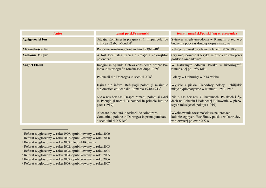 temat polski/rumuński Autor temat rumuński/polski (wg streszczenia) Agrigoroaiei Ion Situaţia României în preajma şi în timpul celui de Sytuacja międzynarodowa w Rumunii przed wyal II-lea Război Mondial1 buchem i podczas drugiej wojny światowej Alexandrescu Ion Raporturi româno-polone în anii 1939-19482 Andronic Mugur A fost localitatea Cacica o creaţie a coloniştilor Czy miejscowość Kaczyka założona została przez polonezi?3 polskich osadników? Anghel Florin Imagini în oglindă. Câteva considerări despre Po- W lustrzanym odbiciu. Polska w historiografii lonia în istoriografia românească după 19894 rumuńskiej po 1989 roku Polonezii din Dobrogea în secolul XIX5 Relacje rumuńsko-polskie w latach 1939-1948 Polacy w Dobrudży w XIX wieku Ieşirea din infern. Refugiaţii poloni şi misiunile Wyjście z piekła. Uchodźcy polscy i chilijskie diplomatice chiliene din România 1940-19436 misje dyplomatyczne w Rumunii 1940-1943 Nic o nas bez nas. Despre români, poloni şi evrei Nic o nas bez nas. O Rumunach, Polakach i Żyîn Pocuţia şi nordul Bucovinei în primele luni de dach na Pokuciu i Północnej Bukowinie w pierwpace (1919)7 szych miesiącach pokoju (1919) Alienare identitară în teritorii de colonizare. Comunităţi polone în Dobrogea în prima jumătate a secolului al XX-lea8 Referat wygłoszony w roku 1999, opublikowany w roku 2000 Referat wygłoszony w roku 2007, opublikowany w roku 2008 3 Referat wygłoszony w roku 2005, nieopublikowany 4 Referat wygłoszony w roku 2002, opublikowany w roku 2003 5 Referat wygłoszony w roku 2003, opublikowany w roku 2004 6 Referat wygłoszony w roku 2004, opublikowany w roku 2005 7 Referat wygłoszony w roku 2005, opublikowany w roku 2006 8 Referat wygłoszony w roku 2006, opublikowany w roku 2007 1 2 Wyobcowanie tożsamościowe na terenach kolonizacyjnych. Wspólnoty polskie w Dobrudży w pierwszej połowie XX w. „Blăstămul conducătorilor de samă”. Portrete ale mareşalului Józef Piłsudski în opera lui Nicolae Iorga9 „Przekleństwo wielkich wodzów”. marszałka Józefa Piłsudskiego w pracach Nicolae Iorga Portrety Proiecte de organizare a noii Europe: Stabilirea Plany organizacji nowej Europy: ustanowienie relaţiilor diplomatice şi a frontierei dintre România stosunków dyplomatycznych i granic pomiędzy şi Polonia (1918-1919)10 Rumunią i Polską (1918-1919) Barszczewska Agnieszka Mołdawscy Csángó w Rumunii, 1918-193911 Ceangăii din Moldova în România, 1918-1939 Biedrzycki Miłosz Emil Biedrzycki – orędownik kulturalnego i gospodarczego zbliżenia mię-dzy Polską i Rumunią12 Emil Biedrzycki – mijlocitor al apropierii culturale şi economice între Po-lonia şi România Biegański Zdzisław Filmy rumuńskie na ekranach kin w Polsce po Filme româneşti pe ecranele cinematografelor din 1945 roku13 Polonia după 1945 Blaj Pavel Colonii româneşti în ţinutul Sanok în sec. XIV- Rumuńskie osadnictwo w okolicach Sanoka w XV14 XIV-XV ww. Mariaje româno-polone în evul de mijloc (sec. Małżeństwa rumuńsko-polskie w wiekach średXIV-XVII)15 nich (XIV-XVII) Curic Lia Ritual şi simbolistică bucovineană16 în arta populară Rytuał i symbolizm w bukowińskiej sztuce ludowej Ciprian Gołębiowski-Porumbescu, produs tipic al Ciprian Gołębiowski-Porumbescu jako typowy Referat wygłoszony w roku 2007, opublikowany w roku 2008 Referat wygłoszony w roku 2008, opublikowany w roku 2009 11 Referat wygłoszony w roku 2008, opublikowany w roku 2009 12 Referat wygłoszony w roku 2011, opublikowany w roku 2012 13 Referat wygłoszony w roku 2009, nieopublikowany 14 Autor nieobecny na sympozjum, referat opublikowany w roku 2003 15 Referat wygłoszony w roku 2003, opublikowany w roku 2004 16 Referat wygłoszony w roku 2004, opublikowany w roku 2005 9 10 interculturalităţii bucovinene17 przykład bukowińskiej wielokulturowości Błesznowski Bartłomiej Nowak Marta Kościół warowny jako centrum przestrzeni społeczno-kulturowej w dawnych wspólnotach Sasów siedmiogrodzkich18 Biserica fortificată ca centru al spaţiului sociocultural în vechi comunităţi săseşti din Transilvania Bobeică Sorin Aspecte privind relaţiile comerciale ale Poloniei Aspekty dotyczące stosunków handlowych między cu Ţările Române, în special cu Moldova, în seco- Polską a Księstwami Rumuńskimi, w szczególnolul al XVII-lea19 ści Mołdawią w XVII w. Bobicescu Antim Cristian Câteva observații pe marginea unor izvoare inedite Kilka uwag na marginesie niepublikowanych źrócu privire la relațiile dintre Polonia și Moldova sub deł dotyczących relacji między Polską i Mołdawią Movilești20 za panowania Mohyłów Observaţii referitoare la imaginea Moldovei şi a Uwagi na temat wizerunku Mołdawii i Mołdawian moldovenilor în a II-a jumătate a sec. XVI şi I w Rzeczypospolitej w II połowie XVI w. i I połojumătate a sec. XVII21 wie XVII w. Din nou despre originea lui Ieremia Movilă. Partea Ponownie na temat pochodzenia Jeremiego MohyI22 ły. Część I Bodnariuc Ioan Zagadnienia historiograficzne dotyczące relacji Consideraţii de istoriografie legate de relaţii molmołdawsko-polskich w średniowieczu23 do-polone în epoca medieval Boniecki Dominik Stosunek Polonii gminy Kaczyka do lokalnych urzędów i urzędników24 Atitudinea comunităţii poloneze din comuna Cacica faţă de administraţia locală şi funcţionari Referat wygłoszony w roku 2005, nie opublikowany Referat wygłoszony w roku 2008, opublikowany w roku 2009 19 Referat wygłoszony w roku 2004, opublikowany w roku 2005 20 Referat wygłoszony w roku 2009, opublikowany w roku 2010 21 Referat wygłoszony w roku 2010, nieopublikowany 22 Inny temat prezentowany podczas sympozjum: Drepturile dinastice ale lui Ieremia Movilă. Mărturia unor izvoare nediscutate până acum / Prawa dynastyczne Jeremiego Mohyły. Świadectwo nieznanych dotąd źródeł 23 Referat wygłoszony w roku 2000, nie opublikowany 24 Referat wygłoszony w roku 201