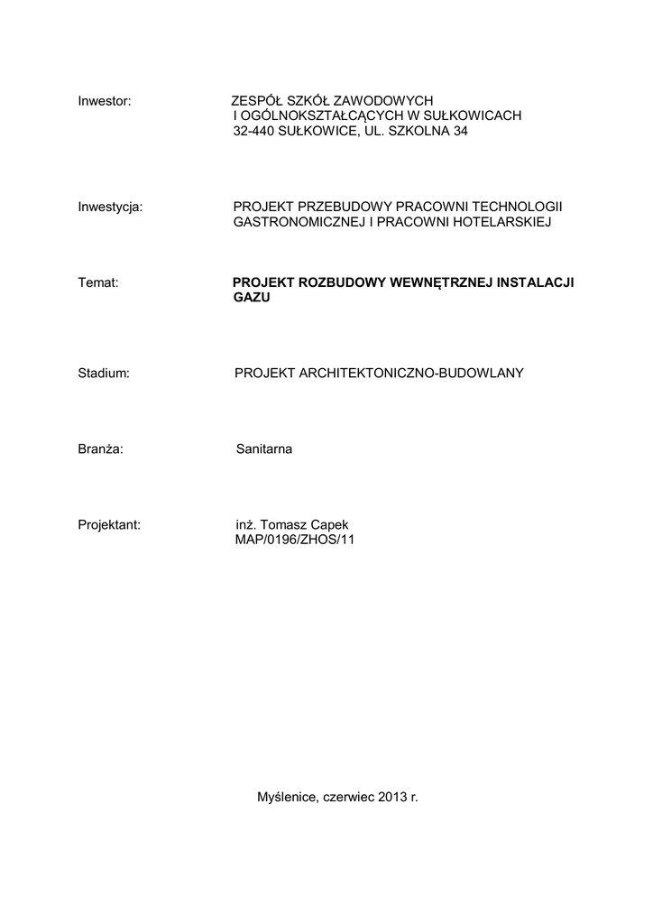 Inwestor: ZESPÓŁ SZKÓŁ ZAWODOWYCH I OGÓLNOKSZTAŁCĄCYCH W SUŁKOWICACH 32-440 SUŁKOWICE, UL. SZKOLNA 34 Inwestycja: PROJEKT PRZEBUDOWY PRACOWNI TECHNOLOGII GASTRONOMICZNEJ I PRACOWNI HOTELARSKIEJ Temat: PROJEKT ROZBUDOWY WEWNĘTRZNEJ INSTALACJI GAZU Stadium: PROJEKT ARCHITEKTONICZNO-BUDOWLANY Branża: Sanitarna Projektant: inż. Tomasz Capek MAP/0196/ZHOS/11 Myślenice, czerwiec 2013 r. Spis treści I. Część ogólna 1. Przedmiot opracowania 2. Zakres opracowania dokumentacji technicznej 3. Podstawa opracowania II. Opis techniczny projektowanych instalacji sanitarnych 1. Instalacja wewnętrzna gazu 2. System detekcji gazu 3. Uwagi końcowe 4. Informacje do sporządzenia planu BIOZ III. Spis rysunków 1. Rzut piwnicy – Instalacja gazu (G-01) skala 1:100 2. Rzut parteru – Instalacja gazu (G-02) skala 1:100 3. Aksonometria instalacji gazu (G-03) I. Część ogólna 1. Przedmiot opracowania Przedmiotem opracowania jest projekt budowlany rozbudowy wewnętrznej instalacji gazu dla przebudowy Pracowni technologi gastronomicznej przy Zespole Szkół Zawodowych i Ogólnokształcących w Sułkowicach. 2. Zakres opracowania dokumentacji technicznej Opracowanie niniejsze obejmuje: a) projekt techniczny rozbudowy wewnętrznej instalacji gazu 3. Podstawa opracowania a) podkład geodezyjny w skali 1:500 b) projekt architektoniczno – budowlany, w skali 1:100 c) warunki przyłączania do sieci gazowej KSGII/581TO/63/0/130966/13/2/13 z dn. 24.05.2013 r. d) aktualne normy, rozporządzenia, katalogi oraz wytyczne projektowe e) uzgodnienia międzybranżowe. II Opis techniczny projektowanych instalacji 1. Instalacja gazowa 1.1 Doprowadzenie gazu Budynek posiada instalację gazową. Gaz ziemny GZ-50 doprowadzany jest do skrzynki gazowej poprzez istniejące przyłącze gazowe. Zgodnie z warunkami rozbudowy wewnętrznej instalacji gazowej należy przebudować istniejącą skrzynkę gazową oraz: - wymienić gazomierz na G40 (szt.1) - zamontować reduktor R70 (szt.1) - zamontować rejestratora szczytów godzinowych z przekazem telemetrycznym Przyłącze dla projektowanej sali należy wykonać przez włączenie do istniejącego rurociągu DN80 w piwnicy. 1.2 Wyposażenie instalacji w odbiorniki gazu 1. Kuchnia gazowa 4 palnikowa o mocy 14 kW – szt. 8 2. Piec konwekcyjny o mocy 20 kW – szt. 1 1.3 Rozprowadzenie gazu Instalację wykonać z rur stalowych, czarnych, instalacyjnych, bez szwu produkowanych zgodnie z PN-80/H-74219, łączonych przez spawanie autogeniczne. Odbiorniki z instalacją łączyć za pomocą łączników gwintowanych, uszczelnianych konopiami czesanymi, zanurzanymi w pokoście naturalnym. Instalacje można także wykonać z rur miedzianych twardych, ciągnionych wykonanych z miedzi odtlenionej o zawartości 99,9% Cu, zgodnie z normami DIN 1786,1787. Do łączenia w/w rur używać wyłącznie lutów twardych o składzie zgodnym z podanym w normie ENV133/80-1 CEN-133/22 odporne na temperaturze min 450°C oraz temperaturze spływania powyżej 650°C - odpowiadających normie 8315. Do łączenia poszczególnych odcinków instalacji stosować kształtki gładkie posiadające odpowiednią grubość ścianki zapewniającą wytrzymałość połączenia oraz minimalną grubość styku. Odbiorniki łączyć z instalacją za pomocą końcówek gwintowanych z elementem przystosowanym do lutowania wykonane z mosiądzu duplex zgodnie z DIN 1705. Rury prowadzić po powierzchni ścian w odległości 3 cm od tynku, mocując je do nich za pomocą uchwytów wykonanych z materiałów ognioodpornych. Przewody instalacji gazowej poprowadzić tak, aby umożliwić samokompensację wydłużeń cieplnych oraz eliminację odkształceń spowodowanych pracą konstrukcji budynku. Należy utrzymać spadek przewodów 0,4‰ w kierunku przyborów. Poziome odcinki instalacji prowadzić w odległości min. 10 cm od innych instalacji, umieszczając je nad tymi instalacjami. Iskrzące urządzania elektryczne sytuować w odległości min. 60 cm od projektowanych przewodów gazowych. Przed wszystkimi odbiornikami zainstalować kurki odcinające , sytuując je w dostępnych miejscach . W przypadku przejścia instalacji gazowej przez ściany konstrukcyjne budynku oraz stropy, przewody gazowe prowadzić w stalowych rurach ochronnych wystających po 3 cm z każdej strony przeszkody. Instalację prowadzoną w rurze ochronnej zabezpieczyć przed korozją ,a przestrzeń wolną pomiędzy rurą ochronną a przewodową wypełnić plastycznym szczeliwem nie powodującym korozji przewodów gazowych. 1.4 Montaż odbiorników gazu Odbiorniki gazu mogą być instalowane w pomieszczeniach posiadających odpowiednią kubaturę oraz wysokość wynoszącą min. 2,2m. W budynku projektuje się zainstalowanie kuchenek gazowej 4 palnikowych (szt.8) i pieca konwekcyjnego (szt.1) w pomieszczeniu projektowanej pracowni technologi gastronomicznej. Pomieszczenie to spełnia minimalne wymagania dotyczące wysokości i kubatury pomieszczeń przeznaczonych na montaż odbiorników gazu. Kuchnie instalować w odległości okien i drzwi nie mniejszej niż 0,5m , zachowując przy tym odstęp od tylnej ściany oraz przyległych mebli nie mniejszy niż 5 cm. 1.5 Wentylacja pomieszczenia z urządzeniami gazowymi Istniejący kanał wentylacyjny o wymiarach w przekroju 14 x 14 cm zakończyć kratką wentylacyjną o wymiarach 14 x 14 cm usytuowaną pod stropem pomieszczenia. Do nawiewu powietrza przewidziano montaż nawietrzaków podokiennych (szt.4) Sprawność działania kanałów wentylacyjnych musi być potwierdzona aktualnym zaświadczeniem kominiarskim wydanym przez uprawnionego mistrza kominiarskiego. 1.6. Gazomierz Uwzględniając zapotrzebowanie gazu przez budynek, przewiduje się zainstalowanie gazomierza typu G-4. Długość przewodu gazowego od gazomierza do pierwszego odbiornika nie może być mniejsza niż 3,0m mierząc w rozwinięciu 1.7. Próba instalacji gazowej Po wykonaniu instalacji należy poddać ją dwukrotnej próbie szczelności 