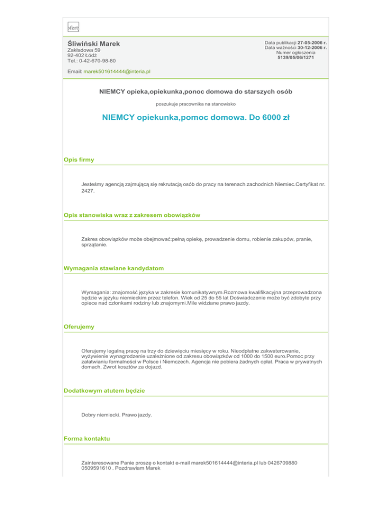 praca, oferty pracy Data publikacji 27-05-2006 r. Data ważności 30-12-2006 r. Numer ogłoszenia 5139/05/06/1271 Śliwiński Marek Zakładowa 59 92-402 Łódż Tel.: 0-42-670-98-80 Email: [email protected] NIEMCY opieka,opiekunka,ponoc domowa do starszych osób poszukuje pracownika na stanowisko NIEMCY opiekunka,pomoc domowa. Do 6000 zł Opis firmy Jesteśmy agencją zajmującą się rekrutacją osób do pracy na terenach zachodnich Niemiec.Certyfikat nr. 2427. Opis stanowiska wraz z zakresem obowiązków Zakres obowiązków może obejmować:pełną opiekę, prowadzenie domu, robienie zakupów, pranie, sprzątanie. Wymagania stawiane kandydatom Wymagania: znajomość języka w zakresie komunikatywnym.Rozmowa kwalifikacyjna przeprowadzona będzie w języku niemieckim przez telefon. Wiek od 25 do 55 lat Doświadczenie może być zdobyte przy opiece nad członkami rodziny lub znajomymi.Mile widziane prawo jazdy. Oferujemy Oferujemy legalną pracę na trzy do dziewięciu miesięcy w roku. Nieodpłatne zakwaterowanie, wyżywienie wynagrodzenie uzależnione od zakresu obowiązków od 1000 do 1500 euro.Pomoc przy załatwianiu formalności w Polsce i Niemczech. Agencja nie pobiera żadnych opłat. Praca w prywatnych domach. Zwrot kosztów za dojazd. Dodatkowym atutem będzie Dobry niemiecki. Prawo jazdy. Forma kontaktu Zainteresowane Panie proszę o kontakt e-mail [email protected] lub 0426709880 0509591610 . Pozdrawiam Marek Informacje dodatkowe Minimalne wykształcenie: dowolne Branża: Gospodarstwa domowe Forma zatrudnienia: zlecenie Wymiar pracy: dorywczo Wynagrodzenie (netto): nie podano Lokalizacja: zagranica Województwo: Miejsce pracy miasto(a) lub kraj(e): Niemcy Prawo jazdy: Znajomość języka obcego: tak Ogłoszenie pochodzi z portalu www.i-praca.pl - Internetowy Portal Pracy ilość wyświetleń: 3940