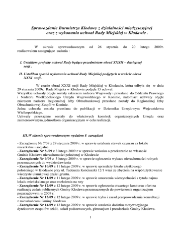 Sprawozdanie Burmistrza Kłodawy z działalności międzysesyjnej oraz z wykonania uchwał Rady Miejskiej w Kłodawie . ________________________________________________________________ W okresie sprawozdawczym realizowałem następujące zadania : od 26 stycznia do 20 lutego 2009r. I. Ustaliłem projekty uchwał Rady będące przedmiotem obrad XXXII – dzisiejszej sesji . II. Ustaliłem sposób wykonania uchwał Rady Miejskiej podjętych w trakcie obrad XXXI sesji . W czasie obrad XXXI sesji Rady Miejskiej w Kłodawie, która odbyła się w dniu 29 stycznia 2009r. Rada Miejska w Kłodawie podjęła 15 uchwał. Wszystkie uchwały objęte zostały zakresem nadzoru Wojewody i przesłane do Oddziału Prawnego i Nadzoru Wielkopolskiego Urzędu Wojewódzkiego w Koninie, natomiast uchwały objęte zakresem nadzoru Regionalnej Izby Obrachunkowej przesłane zostały do Regionalnej Izby Obrachunkowej Zespół w Koninie. Jedna uchwała została przesłana do publikacji w Dzienniku Urzędowym Województwa Wielkopolskiego. Uchwały przekazane zostały do właściwych komórek organizacyjnych Urzędu oraz zainteresowanym jednostkom organizacyjnym w celu realizacji. III.W okresie sprawozdawczym wydałem 8 zarządzeń - Zarządzenie Nr 7/09 z 29 stycznia 2009 r. w sprawie ustalenia stawek czynszu za lokale mieszkalne i socjalne. - Zarządzenie Nr 8 /09 z 3 lutego 2009 r w sprawie wniosku o przekazanie na własność Gminie Kłodawa nieruchomości położonej w Kłodawie - Zarządzenie Nr 9/09 z 3 lutego 2009 r. w sprawie ogłoszenia wykazu nieruchomości rolnych przeznaczonych do wydzierżawienia - Zarządzenie Nr 10/09 z 11 lutego 2009 r. w sprawie sprzedaży lokalu użytkowego położonego w Kłodawie przy ul. Tadeusza Kościuszki 12/1 wraz ze zbyciem na współużytkowanie wieczyste ułamkowej części gruntu. - Zarządzenie Nr 11/09 z 11 lutego 2009 r. w sprawie umorzenia wierzytelności z tytułu najmu lokalu mie4skzlanego oraz rozłożenia na raty - Zarządzenie Nr 12/09 z 12 lutego 2009 r. w sprawie ogłoszenia otwartego konkursu ofert na realizację zadań publicznych Gminy Kłodawa przeznaczonych do powierzenia organizacjom pozarządowym w 2009 r. - Zarządzenie Nr 13/09 z 12 lutego 2009 r. w sprawie trybu i zasad przeprowadzania konsultacji z mieszkańcami Gminy Kłodawa - Zarządzenie Nr 14/09 z 12 lutego 2009 r. w sprawie ustalenia dodatku motywacyjnego dyrektorom zespołów szkół, szkół podstawowych, gimnazjum i przedszkola Gminy Kłodawa. 1 V. W zakresie zamówień publicznych oraz funduszy: Zamówienia publiczne Wybrano wykonawcę w postępowaniu pn. Aktualizacja podkładów geodezyjnych do celów projektowych wraz z wykonaniem projektów podziału działek na podstawie koncepcji budowy obwodnicy z północy na południe dla miasta Kłodawa. Ze względu na przyjęte kryterium ceny, za najkorzystniejszą uznano ofertę spełniającą wymogi formalne, złożoną przez: Przedsiębiorstwo Geodezyjne OMEGA – Danuta Klimczak; ul. Sienkiewicza 31, 62 – 600 Koło z ceną ofertową: 1) Aktualizacja- całość 4.880,00 zł brutto 2) Cena jednego Projektu Podziału Działek- 597,80 zł 3) Cena 50 Projektów Podziału działek- 29.890,00 zł Cena oferty ogółem: 34.770,00 zł Fundusze europejskie 1. W dniu 16 lutego ukazała się na stronie internetowej Urzędu Marszałkowskiego Województwa Wielkopolskiego Lista Projektów po ocenie strategicznej na działanie 6.2.Rozwój kultury i zachowanie dziedzictwa kulturowego. Wniosek Gminy Kłodawa pn. „Rozbudowa i remont budynku Gminnego Ośrodka Kultury w Kłodawie” w skali od 18,5 do 91,5 otrzymał 47 punktów i znajduje się na pozycji 50. Alokacja środków na to działanie wynosiła 10 mln EUR, więc po wstępnych obliczeniach można przyjąć, iż dofinansowanie otrzyma tylko kilkanaście pierwszych projektów. 2. Trwają prace nad przygotowaniem Planów Odnowy Miejscowości Bierzwienna Długa i Pomarzany. VI.W zakresie oświaty W miesiącu marcu Gmina Kłodawa przystąpi do realizacji projekt pn. „Z nauką ścisłą za pan brat”, który skierowany jest do uczniów szkół podstawowych i gimnazjalnych na terenie gminy. Środki na realizację programu pochodzą z funduszy unijnych. Program opracowany został wg wytycznych dla Programu Operacyjnego Kapitał Ludzki Priorytet III - Wysoka jakość systemu oświaty, Działanie 3.3 Poprawa jakości kształcenia, Poddziałanie 3.3.4 Modernizacja treści i metod kształcenia. Instytucją zarządzającą jest Ministerstwo Edukacji Narodowej. Gmina Kłodawa jest jednym z wielu partnerów projektu. Realizacja przedsięwzięcia obejmie 12 samorządów lokalnych z różnych województw. Głównym Beneficjentem oraz liderem projektu jest gmina miejska Rypin (woj. kujawsko-pomorskie). Oprócz Gminy Kłodawa w projekcie wezmą udział uczniowie z gminy miejskiej i wiejskiej Rypin, z powiatu rypińskiego oraz z gmin: Brzuze, Rogowo, Skrwilno, Wąpielsk (woj. kujawsko-pomorskie), Nowe Miasto Lubawskie (woj. warmińsko-mazurskie), Łęczyca (woj. łódzkie), Słupsk (woj. pomorskie), Szczutowo (woj. mazowieckie). Okres realizacji projektu wynosi 3 lata. Głównym celem jest wdrożenie ponadregionalnego programu, który rozwinąłby wśród uczniów podstawowe umiejętności i kompetencje o kluczowym znaczeniu dla kontynuowania nauki oraz dla przyszłego zatrudnienia. Projekt ten kładzie nacisk na rozwój nauk matematyczno-przyrodniczych oraz technologii informacyjno-komunikacyjnych. 2 Działania projektu obejmować będą m.in.: - dodatkowe zajęcia rozwijające umiejętności uczniów w zakresie przedmiotów matematycznoprzyrodniczych na poziomie podstawowym, - dodatkowe zajęcia rozwijające umiejętności uczniów w zakresie przedmiotów matematycznoprzyrodniczych na poziomie ponadpodstawowym, - warsztaty kształtujące umiejętności uczenia się, - zimowe oraz letnie obozy naukowe (uczestnikami obozów będą uczniowie wyróżniający się osiągnięciami w zakresie przedmiotów matematyczno-przy