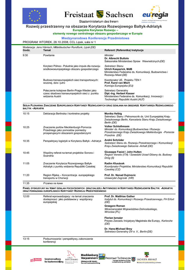 Rozwój przestrzenny na obszarze Korytarza Rozwojowego Baltyk-Adriatyk Europejskie Korytarze Rozwoju – elementy nowego centralnego obszaru gospodarczego w Europie Miedzynarodowa Konferencja Przedmiotowa PROGRAM: WTOREK, 28.10.2008, CCL Lipsk, sala nr 1 Moderacja: Jens Hänisch, Mitteldeutscher Rundfunk, Lipsk (DE) Godz. Temat 9:30 Referent (Referentka) Instytucja Powitanie Minister Dr. Albrecht Buttolo Saksonskie Ministerstwo Spraw Wewnetrznych (DE) Korytarz Pólnoc- Poludnie jako impuls dla rozwoju srodkowoeuropejskiego obszaru gospodarczego Sekretarz Stanu Ulrich Kasparick, MdB Ministerstwo Federalne ds. Komunikacji, Budownictwa i Rozwoju Miast (DE) Budowa transeuropejskich sieci transportowych: wczoraj, dzis i jutro Koordynator UE, Projektu TEN 1 Prof. Karel van Miert Komisja Europejska (EU) Polaczenie kolejowe Berlin-Praga-Wieden jako czesc skadowa transeuropejskich sieci z punktu widzenia Austrii Sekretarz Generalny Dipl.-Ing. Herbert Kasser Ministerstwo Federalne ds. Komunikacji, Innowacji i Technologi i Republiki Austrii (AUT) SESJA PLENARNA: ZNACZENIE EUROPEJSKICH KORYTARZY ROZWOJOWYCH ORAZ DZIALANIA NA OBSZARZE KORYTARRZA ROZWOJOWEGO BALTYK –ADRIATYK 10:15 Deklaracja Berlinska i konkretne projekty Monika Helbig Sekretarz Stanu i Pelnomocnik ds. Unii Europejskiej Kraju Zwiazkowego Berlin, Kancelaria Stanu Kraju Zwiazkowego Berlin (DE) Volker Schlothmann Minister ds. Komunikacji,Budownictwa i Rozwoju Przestrzennego Kraju Zwiazkowego Meklenburgia -Pomorze Przednie (DE) 10:25 Znaczenie portów Mecklenburgii-Pomorza Przedniego jako pomostów pomiedzy prosperujacymi obszarami gospodarczymi 10:35 Perspektywy logistyki w Korytarzu Baltyk –Adriatyk André Schröder Sekretarz Stanu ds. Rozwoju Przestrzennego i Komunikacji Kraju Zwiazkowego Saksonia -Anhalt (DE) 10:45 Wspólny referat na temat projektów Sonora i Scandria Giuseppe Fasiol / John Hulten Region Veneto (ITA) / Szwedzki Urzad Glówny ds. Budowy Dróg (S) 11:05 Znaczenie Korytarza Rozwojowego BaltykAdraityk z punktu widzenia Republiki Czeskiej Radim Klusácek Koordynator Projektów, Ministerstwo Komunikacji Republiki Czeskiej (CZ) 11:20 Region Rijeka – Koncentracja europejskiego transportu w Chorwcji Prof. Dr. Nenad Dujmovic Uniwerytet Zagrzeb (HR) 11:35 Przerwa na kawe PANEL DYSKUSYJNY NA TEMAT DZIALAN POCZATKOWYCH ORAZ DALSZEJ AKTYWNOSCI W KORYTARZU ROZWOJOWYM BALTYK -ADRIATYK ORAZ POWIAZANIA EUROPEJSKICH KORYTARZY ROZWOJU PRZESTRZENNEGO 12:00 Referat wprowadzajacy: na temat znaczenia dostepnosci jako podstawow y wspólpracy europejskiej Prof. Dr. Matthias Gather Instytut ds. Komunikacji i Rozwoju Przestrzennego, FH Erfurt (DE) Grzegorz Roman Wicemarszalek Województwa Dolnoslaskiego, Wroclaw (PL) Florian Ismaier Prezes Zarzadu Inicjatywy Magistrala dla Europy, Karlsruhe (DE) Dr. Hans-Michael Brey Sekretarz Generalny DV e. V., Berlin (DE) 13:15 Podsumowanie i perspektywy, zakonczenie konferencji