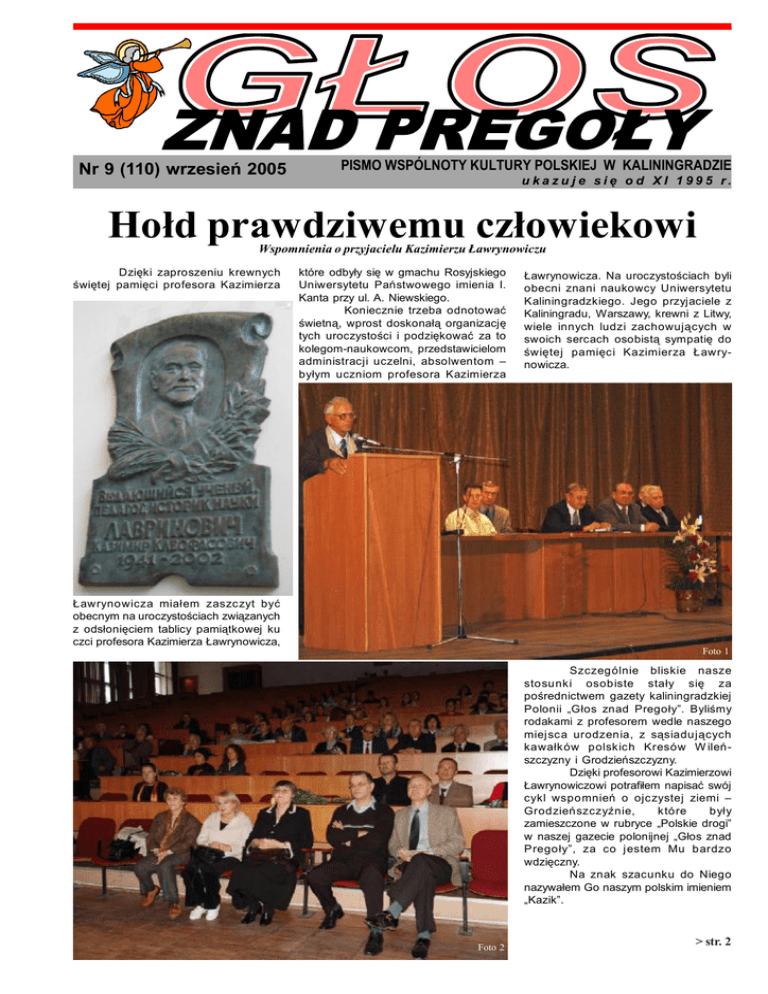 Nr 9 (110) wrzesień 2005 PISMO WSPÓLNOTY KULTURY POLSKIEJ W KALININGRADZIE u kazu j e się o d X I 1995 r. Hołd prawdziwemu człowiekowi Wspomnienia o przyjacielu Kazimierzu Ławrynowiczu Dzięki zaproszeniu krewnych świętej pamięci profesora Kazimierza które odbyły się w gmachu Rosyjskiego Uniwersytetu Państwowego imienia I. Kanta przy ul. A. Niewskiego. Koniecznie trzeba odnotować świetną, wprost doskonałą organizację tych uroczystości i podziękować za to kolegom-naukowcom, przedstawicielom administracji uczelni, absolwentom – byłym uczniom profesora Kazimierza Ławrynowicza. Na uroczystościach byli obecni znani naukowcy Uniwersytetu Kaliningradzkiego. Jego przyjaciele z Kaliningradu, Warszawy, krewni z Litwy, wiele innych ludzi zachowujących w swoich sercach osobistą sympatię do świętej pamięci Kazimierza Ławrynowicza. Ławrynowicza miałem zaszczyt być obecnym na uroczystościach związanych z odsłonięciem tablicy pamiątkowej ku czci profesora Kazimierza Ławrynowicza, Foto 1 Szczególnie bliskie nasze stosunki osobiste stały się za pośrednictwem gazety kaliningradzkiej Polonii „Głos znad Pregoły”. Byliśmy rodakami z profesorem wedle naszego miej sca urodzenia, z sąsiadujących kawałków polskich Kresów W ileńszczyzny i Grodzieńszczyzny. Dzięki profesorowi Kazimierzowi Ławrynowiczowi potrafiłem napisać swój cykl wspomnień o ojczystej ziemi – Grodzieńszczyźnie, które były zamieszczone w rubryce „Polskie drogi” w naszej gazecie polonijnej „Głos znad Pregoły”, za co j estem Mu bardzo wdzięczny. Na znak szacunku do Niego nazywałem Go naszym polskim imieniem „Kazik”. Foto 2 > str. 2