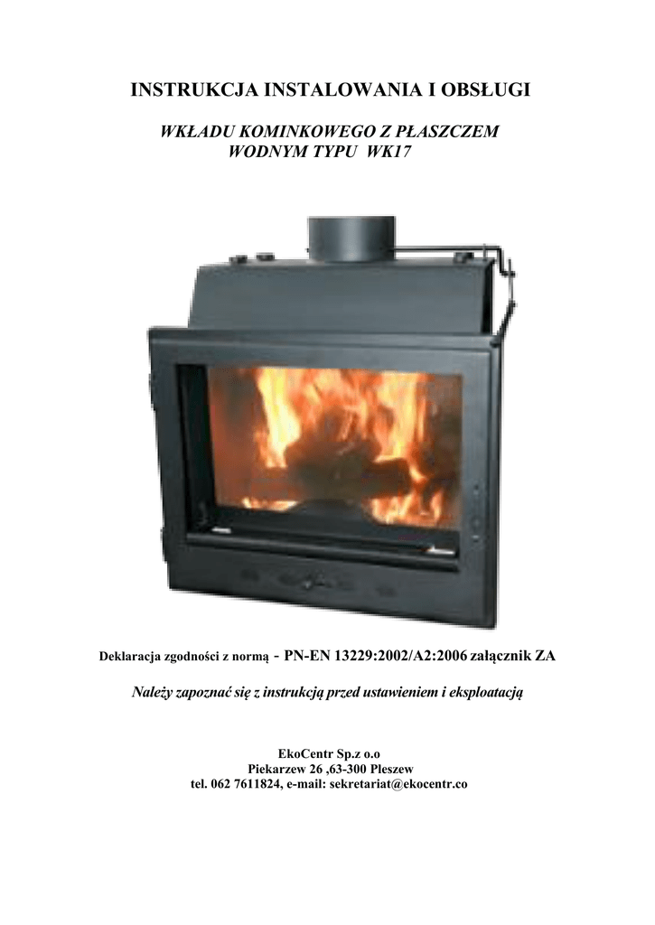 INSTRUKCJA INSTALOWANIA I OBSŁUGI WKŁADU KOMINKOWEGO Z PŁASZCZEM WODNYM TYPU WK17 Deklaracja zgodności z normą - PN-EN 13229:2002/A2:2006 załącznik ZA Należy zapoznać się z instrukcją przed ustawieniem i eksploatacją EkoCentr Sp.z o.o Piekarzew 26 ,63-300 Pleszew tel. 062 7611824, e-mail: [email protected] Podstawowe wymagania Wkłady kominkowe z płaszczem wodnym typu WK 17 są urządzeniami bardzo wydajnymi służącymi do zasilania instalacji c.o. oraz c.w.u. i ogrzewania pomieszczeń przez promieniowanie. Przed instalowaniem i eksploatacją należy przeczytać i stosować się do zaleceń zawartych w niniejszej instrukcji, zapewni to bezpieczną i wydajną pracę wkładu kominkowego. Przepisy i normy krajowe oraz lokalne dotyczące instalowania i eksploatacji powinny być spełnione a w szczególności: 1 ) Rozporządzenie Ministra Infrastruktury z dnia 12.04.2002 r. Dz.U.Nr75, poz. 690 ze zmianą z dnia 07.05.2004 r. Dz.U.Nr109, poz.1156. 2) Norma PN - B – 03406:1994 Ogrzewnictwo. Obliczeniowe zapotrzebowanie na ciepło. 3) Norma PN – 89 / B – 10425 Przewody dymowe, spalinowe i wentylacyjne murowane z cegły. 4) Norma PN – 78 / B – 03421.Wentylacja i klimatyzacja. Parametry obliczeniowe powietrza wewnętrznego. 5) Norma PN – 91/B – 02413:1991 Zabezpieczenie instalacji ogrzewań wodnych systemu otwartego. Wymagania Zaleca się projekt zabudowy, instalację oraz dobór wielkości i montaż wkładu kominkowego uprawnionej firmie instalatorskiej a odbiór instalacji przez mistrza kominiarskiego. Wkłady kominkowe z płaszczem wodnym typu WK 17 spełniają wymagania zawarte w normie PN – EN 13229: 2002 Wkłady Kominkowe wraz z Kominkami Otwartymi na Paliwa Stałe. Wymagania i Badania, zharmonizowanej z dyrektywą UE Wyroby Budowlane (89/106/EWG) Wkład WK z płaszczem wodnym strona 2 ver. 01102009 PL 1. ZASTOSOWANIE, OPIS i PODSTAWOWE PARAMETRY WKŁADÓW KOMINKOWYCH Z PŁASZCZEM WODNYM TYPU WK 17. Stałopalne stalowe wkłady kominkowe z płaszczem wodnym typu WK 17 służą do zasilania instalacji c.o. i c.w.u. budynku oraz ogrzewania pomieszczeń przez promieniowanie. Właściwą wielkość wymiany ciepła dla zapewnienia mocy cieplnej, uzyskano dzięki właściwie dobranej powierzchni wymiany ciepła ścian wewnętrznych kominka oraz powierzchni przekroju otworów powietrza pierwotnego i wtórnego do spalania. Wkłady kominkowe z płaszczem wodnym mogą wyłącznie zasilać instalację grzewczą o ciśnieniu statecznym 1 bar (10 m słupa wody). Zabezpieczoną naczyniem wzbiorczym systemu otwartego. Wkłady kominkowe WK montowane mogą być wyłącznie w obudowie zabezpieczającej przeciwpożarowo łatwopalne elementy budynku. Zalecenia dotyczące wykonania obudowy przedstawiono w rozdziale 2.2. Układ króćców wkładów kominkowych z płaszczem wodnym WK 17 przedstawiono na rysunku 1, przedstawiających tak4że przykładowy, uproszczony projekt instalacji c.o. Opis budowy Korpus wodny obejmujący komorę paleniskową oraz część konwekcyjną jest konstrukcją spawaną z blach stalowych St235JR o grubości 5mm (płaszcz wewnętrzny) i 3mm (płaszcz zewnętrzny). Korpus wodny umieszczony jest na stalowej płycie (podstawie) o grubości 4 mm, wyłożonej płytką szamotową. Górna płaszczyzna podstawy stanowi dno komory Wkład WK z płaszczem wodnym strona 3 ver. 01102009 PL paleniskowej z otworem prostokątnym pod stalowy ruszt. Dół podstawy stanowi komorę popielnikową. Do przedniej płaszczyzny korpusu wodnego przykręcona jest stalowa rama drzwiczek paleniskowych i frontu szuflady popielnika. W stalowym froncie szuflady umiejscowiona jest przesuwna przepustnica powietrza pierwotnego. Drzwiczki wkładu kominkowego wyposażone są w płaską prostokątną szybę żaroodporną. Pomiędzy górną krawędzią szyby a ramą drzwiczek jest szczelina, przez którą doprowadzane jest powietrze wtórne. Drzwiczki otwierane są przy pomocy uchwytu obsługiwanego za pomocą haczyka znajdującego się na wyposażeniu kominka. Nad komorą paleniskową znajdziemy rury, będące częścią korpusu wodnego. Przed osuwaniem się paliwa na szybę, podczas spalania oraz przed wypadaniem żaru w czasie obsługi paleniska, zabezpiecza stalowy ruszt pionowy. Czopuch wkładu kominkowego wyposażony jest w stalową przepustnicę, regulowana za pomocą uchwytu dźwigni, umieszczonego w górnej części ramy czołowej wkładu kominkowego. Płaszcz wodny wyposażony jest m.in. w dwa króćce dolotowe oraz umieszczone na stropie dwa króćce zasilające i króciec czujnika ciśnienia. Podstawowe dane techniczno – eksploatacyjne gwarantowane przy eksploatacji kominków zgodnie z zasadami ujętymi w niniejszej instrukcji zestawiono w tabeli 1. Tabela 1. Dane techniczno - eksploatacyjne wkładów kominkowych z płaszczem wodnym typoszeregu WK 17 Lp. Wyszczególnienie 1 Moc cieplna nominalna 2 Moc cieplna obiegu wodnego 3 4 5 6 7 8 9 10 11 12 13 14 15 16 17 18 drewno liściaste brykiet drewno liściaste brykiet drewno liściaste brykiet Moc cieplna przekazywana do pomieszczenia Stałopalność przy mocy nominalnej Jednorazowy załadunek paliwa Sprawność przy mocy nominalnej Emisja CO (13%O2) Strumień masy spalin Średnia temperatura spalin Dopuszczalne ciśnienie robocze Ciśnienie próby wodnej Maksymalna temp. robocza Odstęp części palnych od szyby - przy mocy nominalnej Ciąg kominowy - przy obciążeniu zredukowanym - gabarytowe (szer. x wys.x głębokość) Wymiary - średnica wylotu spalin Masa wkładu Pojemność wodna Króćce zasilania i powrotu -rodzaj 19 Paliwo Wkład WK z płaszczem wodnym Wartość Typ kominka Wk 17 18,56 kW 28,31 9,29 kW 8,88 9,27 kW 19,43 h 1 kg <8 % 75,5 % 0,8 g/s 11 °C ok. 200 bar 1 bar 2 °C 95 cm Min. 80 Pa 12 Pa 6 mm 650 x 700x 455 mm 200 kg 133 l 30 DN 25 (1”) drewno liściaste brykiet cm 30 cm 35-50 % <20 Miano - długość - obwód - wilgotność strona 4 ver. 01102009 PL 2. INSTRUKCJA MONTAŻU KOMINKÓW Przed montażem kominka na
