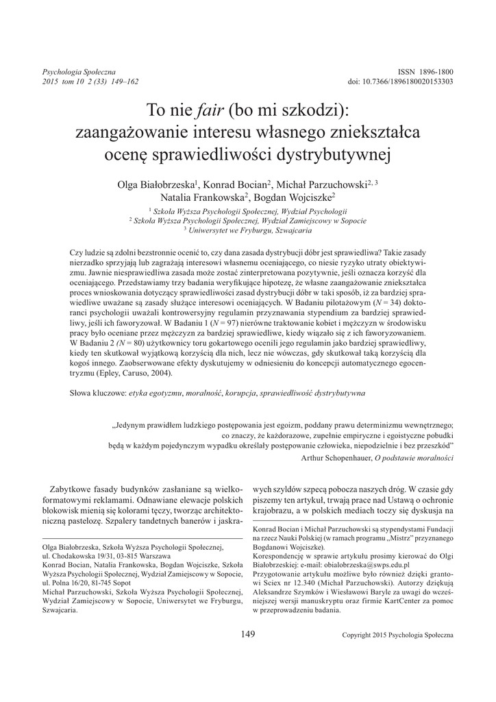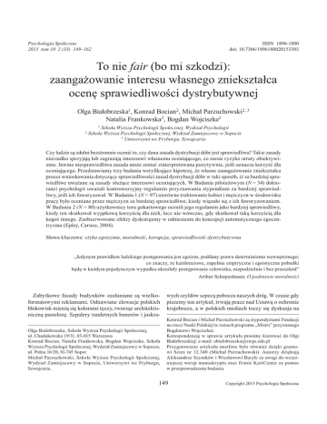 Psychologia Spo eczna 2015 tom 10 2 (33) 149–162 ISSN 1896-1800 doi: 10.7366/1896180020153303 To nie fair (bo mi szkodzi): zaanga!owanie interesu w asnego zniekszta ca ocen" sprawiedliwo#ci dystrybutywnej Olga Bia obrzeska1, Konrad Bocian2, Micha Parzuchowski2, 3 Natalia Frankowska2, Bogdan Wojciszke2 1 2 Szko a Wy!sza Psychologii Spo ecznej, Wydzia Psychologii Szko a Wy!sza Psychologii Spo ecznej, Wydzia Zamiejscowy w Sopocie 3 Uniwersytet we Fryburgu, Szwajcaria Czy ludzie s$ zdolni bezstronnie oceni% to, czy dana zasada dystrybucji dóbr jest sprawiedliwa? Takie zasady nierzadko sprzyjaj$ lub zagra!aj$ interesowi w asnemu oceniaj$cego, co niesie ryzyko utraty obiektywizmu. Jawnie niesprawiedliwa zasada mo!e zosta% zinterpretowana pozytywnie, je#li oznacza korzy#% dla oceniaj$cego. Przedstawiamy trzy badania weryÞkuj$ce hipotez", !e w asne zaanga!owanie zniekszta ca proces wnioskowania dotycz$cy sprawiedliwo#ci zasad dystrybucji dóbr w taki sposób, i! za bardziej sprawiedliwe uwa!ane s$ zasady s u!$ce interesowi oceniaj$cych. W Badaniu pilota!owym (N = 34) doktoranci psychologii uwa!ali kontrowersyjny regulamin przyznawania stypendium za bardziej sprawiedliwy, je#li ich faworyzowa . W Badaniu 1 (N = 97) nierówne traktowanie kobiet i m"!czyzn w #rodowisku pracy by o oceniane przez m"!czyzn za bardziej sprawiedliwe, kiedy wi$za o si" z ich faworyzowaniem. W Badaniu 2 (N = 80) u!ytkownicy toru gokartowego ocenili jego regulamin jako bardziej sprawiedliwy, kiedy ten skutkowa wyj$tkow$ korzy#ci$ dla nich, lecz nie wówczas, gdy skutkowa tak$ korzy#ci$ dla kogo# innego. Zaobserwowane efekty dyskutujemy w odniesieniu do koncepcji automatycznego egocentryzmu (Epley, Caruso, 2004). S owa kluczowe: etyka egotyzmu, moralno"#, korupcja, sprawiedliwo"# dystrybutywna „Jedynym prawid em ludzkiego post"powania jest egoizm, poddany prawu determinizmu wewn"trznego; co znaczy, !e ka!dorazowe, zupe nie empiryczne i egoistyczne pobudki b"d$ w ka!dym pojedynczym wypadku okre#la y post"powanie cz owieka, niepodzielnie i bez przeszkód” Arthur Schopenhauer, O podstawie moralno"ci Zabytkowe fasady budynków zas aniane s$ wielkoformatowymi reklamami. Odnawiane elewacje polskich blokowisk mieni$ si" kolorami t"czy, tworz$c architektoniczn$ pasteloz". Szpalery tandetnych banerów i jaskraOlga Bia obrzeska, Szko a Wy!sza Psychologii Spo ecznej, ul. Chodakowska 19/31, 03-815 Warszawa Konrad Bocian, Natalia Frankowska, Bogdan Wojciszke, Szko a Wy!sza Psychologii Spo ecznej, Wydzia Zamiejscowy w Sopocie, ul. Polna 16/20, 81-745 Sopot Micha Parzuchowski, Szko a Wy!sza Psychologii Spo ecznej, Wydzia Zamiejscowy w Sopocie, Uniwersytet we Fryburgu, Szwajcaria. wych szyldów szpec$ pobocza naszych dróg. W czasie gdy piszemy ten artyku , trwaj$ prace nad Ustaw$ o ochronie krajobrazu, a w polskich mediach toczy si" dyskusja na Konrad Bocian i Micha Parzuchowski s$ stypendystami Fundacji na rzecz Nauki Polskiej (w ramach programu „Mistrz” przyznanego Bogdanowi Wojciszke). Korespondencj" w sprawie artyku u prosimy kierowa% do Olgi Bia obrzeskiej: e-mail: [email protected] Przygotowanie artyku u mo!liwe by o równie! dzi"ki grantowi Sciex nr 12.340 (Micha Parzuchowski). Autorzy dzi"kuj$ Aleksandrze Szymków i Wies awowi Baryle za uwagi do wcze#niejszej wersji manuskryptu oraz firmie KartCenter za pomoc w przeprowadzeniu badania. 149 Copyright 2015 Psychologia Spo eczna 150 O. BIA&OBRZESKA, K. BOCIAN, M. PARZUCHOWSKI, N. FRANKOWSKA, B. WOJCISZKE temat estetyki przestrzeni publicznej (Springer, 2013). Dlaczego przestrze' publiczna w Polsce pozostaje tak nieuporz$dkowana? Jednym z powodów jest brak przepisów, które szczegó owo regulowa yby np. to, w jakim miejscu i w jakiej formie mo!na w owej przestrzeni publicznej reklamowa% swoj$ ofert". Obok powodu natury legislacyjnej nie bez znaczenia jest fakt, !e brak Ustawy o ochronie krajobrazu le!y w interesie wielu osób. Jak mówi Filip Springer w rozmowie z Micha em Wybieralskim na amach Gazety Wyborczej: „Deweloperzy zarabiaj$ na rozlewaniu si" miast i chaotycznej zabudowie przedmie#% (…). Na ba aganie zarabia bran!a reklamowa. Wielkie firmy te! !yj$ z tego, !e dooko a jest tak brzydko (…). A na pastelozie zarabiaj$ architekci” (Wybieralski, 2013, s. 22–23). Wra!liwi na estetyk" mieszka'cy opowiadaj$ si" za wprowadzeniem wi"kszej kontroli nad tym, jak zagospodarowuje si" przestrze' publiczn$ w Polsce. Tymczasem przedsi"biorcy, na których zlecenie owe szyldy s$ zawieszane, czy politycy korzystaj$cy podczas kompanii wyborczych na banerowej samowolce (poprzez oklejanie ca ych miast plakatami z w asnym wizerunkiem) nie b"d$ zapewne tak przychylni wej#ciu w !ycie podobnej ustawy. Ten przyk ad ujawnia zjawisko oczywiste, acz bardzo powa!ne w swoich konsekwencjach – ludzie za sprawiedliwe i s uszne uznaj$ regulacje dla nich samych korzystne, te za#, które zagra!aj$ ich interesowi, widz$ jako niesprawiedliwe i nies uszne. W niniejszym artykule podejmujemy si" empirycznej analizy mechanizmu psychologicznego wydawanych w ten sposób ocen. Przywileje szlacheckie, afera hazardowa, afera Rywina – to tylko nieliczne przyk ady z historii, kiedy to przewodni$ ide$ osób maj$cych realny wp yw na uchwalane prawo by a bynajmniej nie sprawiedliwo#%, lecz osobista korzy#%. O powszechno#ci przedk adania interesu w asnego nad obiektywnie rozumian$ sprawiedliwo#% #wiadcz$ popularne w debacie publicznej zarzuty wobec osób maj$cych w adz" – o apówkarstwo, o nadawanie przywilejów cz onkom rodziny, o nadu!ywanie powierzonego bud!etu, o wp yw lobbystów na ustawodawstwo itd. (Jarosz, 2004). Cho% zwykle pozostawanie u w adzy hamuje przyjmowanie perspektywy innych, a nasila kierowanie si" w asnym interesem (Galinsky, Magee, Inesi, Gruenfeld, 2006), to czy „zwykli” ludzie potrafi$ uciszy% osobiste pobudki, oceniaj$c, czy co# jest (obiektywnie) sprawiedliwe, czy nie? Odpowiadamy na pytanie, czy s$ oni zdolni bezstronnie oceni% sprawiedliwo#% zasad dystrybucji dóbr, kied