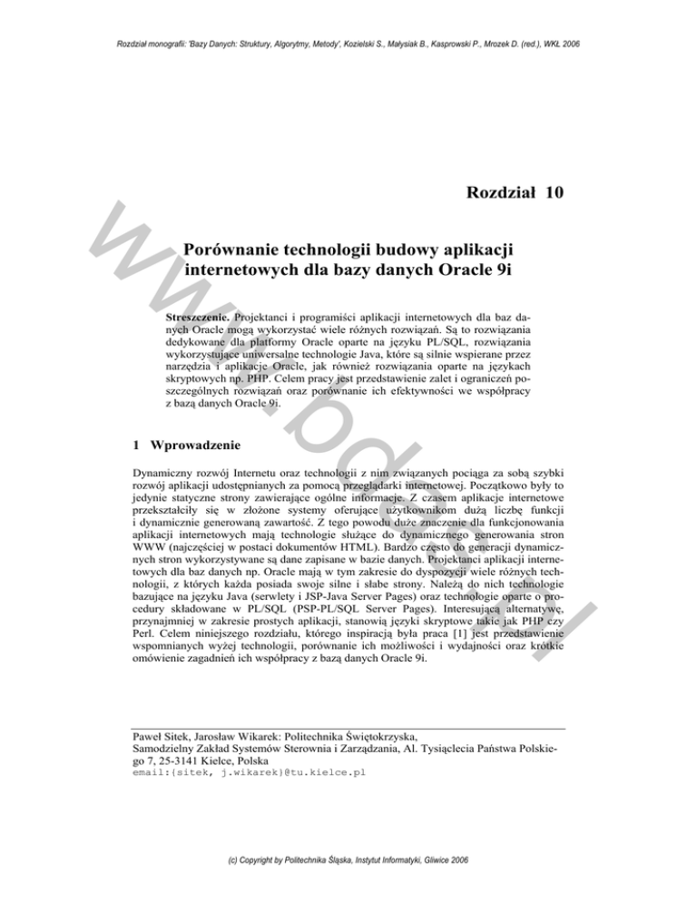 bazujące na języku Java (serwlety i JSP-Java Server Pages) oraz technologie oparte o procedury składowane w PL/SQL (PSP-PL/SQL Server Pages). Interesującą alternatywę,