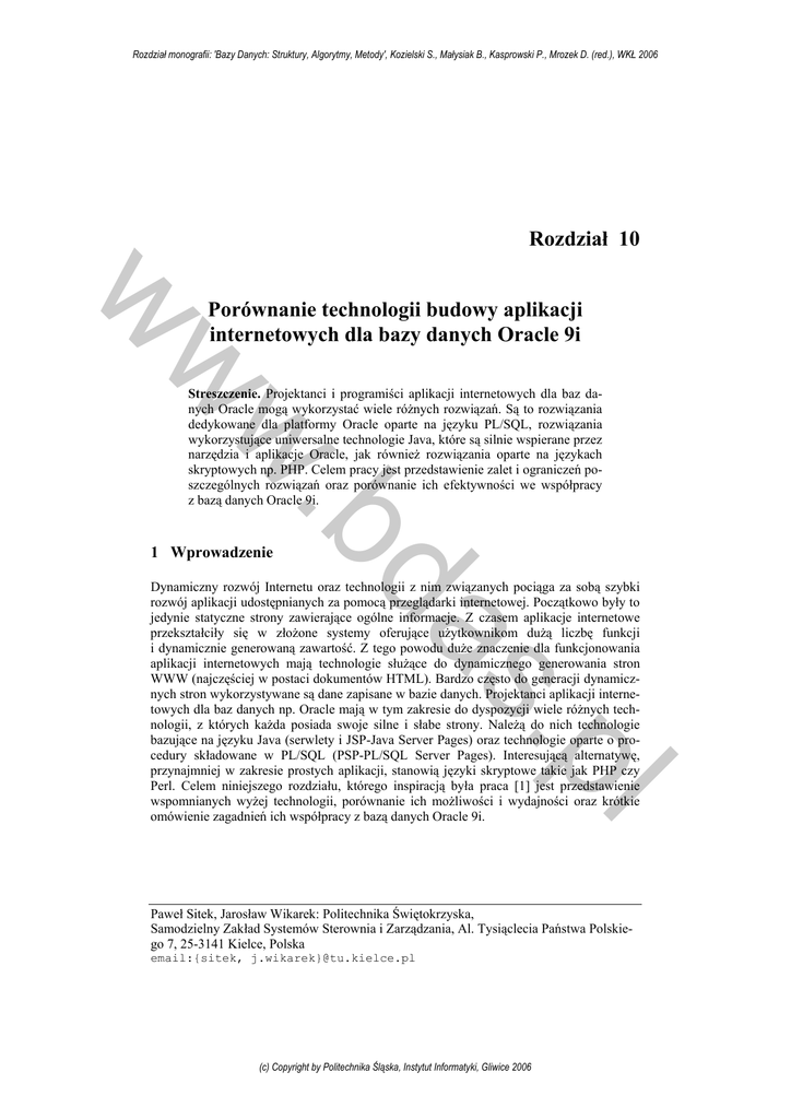 Wojciechowski M, Zakrzewisz M. Analiza porównawcza technologii tworzenia aplikacji internetowych dla baz danych Oracle. VIII Konferencja PLOUG, s. 46-61, Kościelisko 2002.