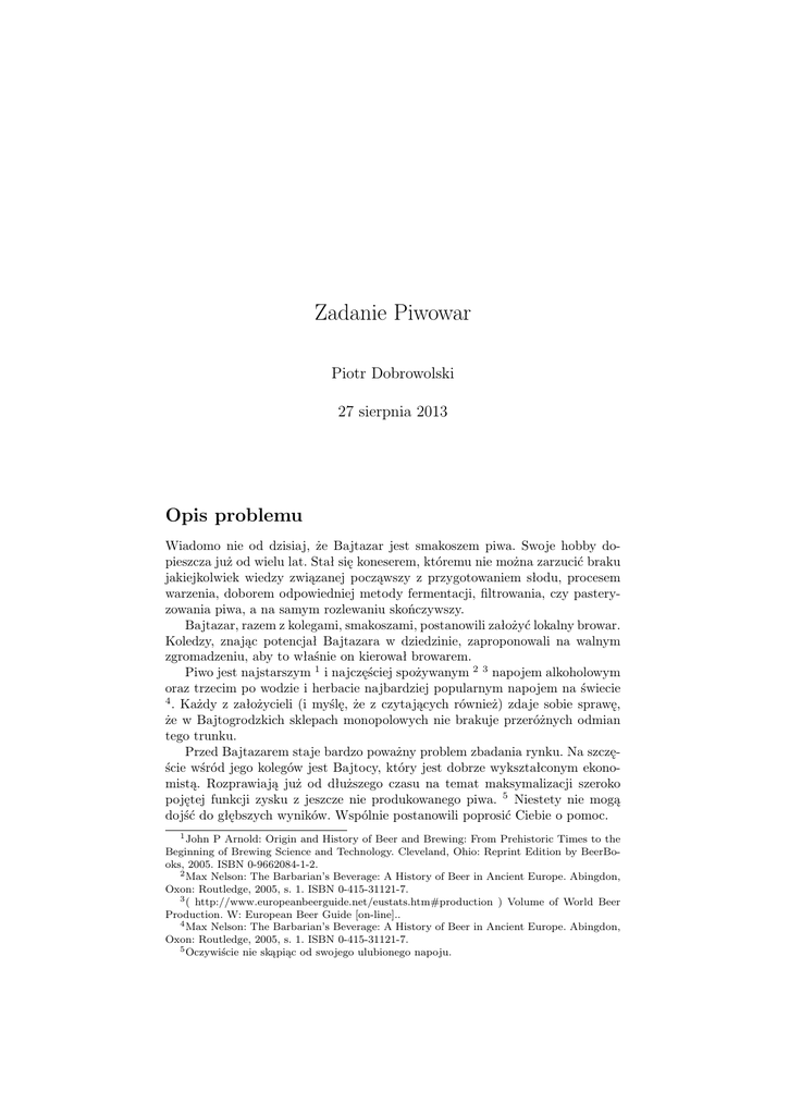 Zadanie Piwowar Piotr Dobrowolski 27 sierpnia 2013 Opis problemu Wiadomo nie od dzisiaj, że Bajtazar jest smakoszem piwa. Swoje hobby dopieszcza już od wielu lat. Stał się koneserem, któremu nie można zarzucić braku jakiejkolwiek wiedzy związanej począwszy z przygotowaniem słodu, procesem warzenia, doborem odpowiedniej metody fermentacji, filtrowania, czy pasteryzowania piwa, a na samym rozlewaniu skończywszy. Bajtazar, razem z kolegami, smakoszami, postanowili założyć lokalny browar. Koledzy, znając potencjał Bajtazara w dziedzinie, zaproponowali na walnym zgromadzeniu, aby to właśnie on kierował browarem. Piwo jest najstarszym 1 i najczęściej spożywanym 2 3 napojem alkoholowym oraz trzecim po wodzie i herbacie najbardziej popularnym napojem na świecie 4 . Każdy z założycieli (i myślę, że z czytających również) zdaje sobie sprawę, że w Bajtogrodzkich sklepach monopolowych nie brakuje przeróżnych odmian tego trunku. Przed Bajtazarem staje bardzo poważny problem zbadania rynku. Na szczęście wśród jego kolegów jest Bajtocy, który jest dobrze wykształconym ekonomistą. Rozprawiają już od dłuższego czasu na temat maksymalizacji szeroko pojętej funkcji zysku z jeszcze nie produkowanego piwa. 5 Niestety nie mogą dojść do głębszych wyników. Wspólnie postanowili poprosić Ciebie o pomoc. 1 John P Arnold: Origin and History of Beer and Brewing: From Prehistoric Times to the Beginning of Brewing Science and Technology. Cleveland, Ohio: Reprint Edition by BeerBooks, 2005. ISBN 0-9662084-1-2. 2 Max Nelson: The Barbarian’s Beverage: A History of Beer in Ancient Europe. Abingdon, Oxon: Routledge, 2005, s. 1. ISBN 0-415-31121-7. 3 ( http://www.europeanbeerguide.net/eustats.htm#production ) Volume of World Beer Production. W: European Beer Guide [on-line].. 4 Max Nelson: The Barbarian’s Beverage: A History of Beer in Ancient Europe. Abingdon, Oxon: Routledge, 2005, s. 1. ISBN 0-415-31121-7. 5 Oczywiście nie skąpiąc od swojego ulubionego napoju. Lekcja ekonomii w wykonaniu Bajtocego Funkcja zysku jest najbardziej ogólny i wszechstronnym miernikiem oceny pracy przedsiębiorstwa. 6 W naszym eksperymencie funkcja zysku musi brać pod uwagę następujące czynniki: • koszt stały, • koszt zmienny, • inny koszt produkcji, niezależny od powyższych, • zysk ze sprzedaży. Które to będą się zmieniać w zależności od postanowień na temat produkcji. Być może nie jest to ostatnie słowo Bajtocego i będzie chciał coś dodać do procesu liczenia funkcji zysku. Co wiemy od Bajtazara Know-how browaru jest kwintesencją jego sukcesu na rynku. Na szczęście, jak już wiemy, Bajtazar nie jest byle laikiem. Zna całą gamę sposobów produkcji piwa, które potrafi również zmieniać, udoskonalać i wręcz tworzyć nowe. Pamiętaj o tym, aby te informacje nie wyciekły, na początku to one tak naprawdę stanowią prawdziwy kapitał przedsiębiorstwa. Bajtazar udostępnia nam listę testerów, tak zwanych kiperów 7 . Każdy z nich implementuje metodę, która zwraca informację, czy kupiłby dane piwo. Produkcja Warzenie piwa w znaczeniu szerszym pod tym pojęciem rozumie się ogół czynności mających na celu wytworzenie piwa jako gotowego produktu spożywczego. W wąskim znaczeniu warzeniem piwa określa się gotowanie brzeczki z chmielem w kotle warzelnym. 8 My skupimy się na szerszym rozumieniu tego pojęcia. Proces ten możemy skrócić do poniższych punktów: • ześrutowanie słodu w młynie lub śrutowniku, tworzymy śrutę słodową, • proces w kadzi zaciernej (zalewanie śruty słodowej podaną ilością wodą i podgrzewanie do danej temperatury), powstaje zacier, • filtracja w kadzi filtracyjnej, powstaje brzeczka przednia, • warzenie, (od kilkudziesięciu minut do około godziny w zależności od rodzaju piwa), powstaje brzeczka gorąca, 6 Zaczerpnięte z http://www.przedsiebiorstw.xcze.pl/10.php [on-line] jest to osoba zajmująca się organoleptyczną oceną smaku, zapachu, jakością i klasyfikacją wszelkiego rodzaju potraw i napojów. (źródło wikipedia: http://pl.wikipedia.org/wiki/Kiper). 8 Źródło wikipedia (http://pl.wikipedia.org/wiki/Warzenie piwa) 7 Kiper 2 • oddzielanie osadów w kadzi wirowej, schładzanie (do danej temperatury w zależności od procesu), powstaje brzeczka nastawna, • natlenianie, a następnie dodawanie drożdży (których kultury mogą być różne w zależności od piwa, wymieniane po danej ilości cykli fermentacji), następuje fermantacja, • filtracja brzeczki, powstaje piwo zielone, • leżakowanie i dojrzewanie, • filtracja, • pasteryzowanie, • rozlew. 10 Klasyfikacja słodów ): 9 , każdy słód charakteryzuje cena za tonę oraz (WZB • Słody jęczmienne słód pilzneński słód monachijski monachijski jasny monachijski ciemny słód wiedeński słody karmelowe karmelowy jasny karmelowy ciemny słody palone, barwiące, czekoladowe, czarne słód zakwaszający • Słody pszeniczne słód pszeniczny jasny słód pszeniczny ciemny • Słody żytnie słód żytni karmelowy słód żytni czekoladowy Wyróżniamy drożdże górnej i dolnej fermentacji. Bajtazar już ma pomysł na następujące piwa: 9 źródło : http://www.wiki.piwo.org/Rodzaje s%C5%82od%C3%B3w oraz ich zastosowanie Zachwytu Bajtazara (który jest liczbą rzeczywistą), a dowiadujemy się o nim dzięki testowi słodu przez Bajtazara 10 Współczynnik 3 • “Hipster na trawce” jest to niepasteryzowane, niefiltrowane piwo, którego proces ważenia trwa pół godziny. Wykonuje się je mieszkając słód jęczmienny pilzneński ze słodem jęczmiennym monachijskim ciemnym. Podczas procesu zacierania zalewa się wodą w stosunku 1:3, podgrzewając do temperatury 73◦ C. Po ważeniu następuje schładzanie do temperatury 30◦ C. Stosuje się wyłącznie drożdże górnej fermentacji. Piwo leżakuje tydzień. Rozlewane jest do drogich butelek klasy A. 11 (niekapslowanych, tylko z zamknięciem pał