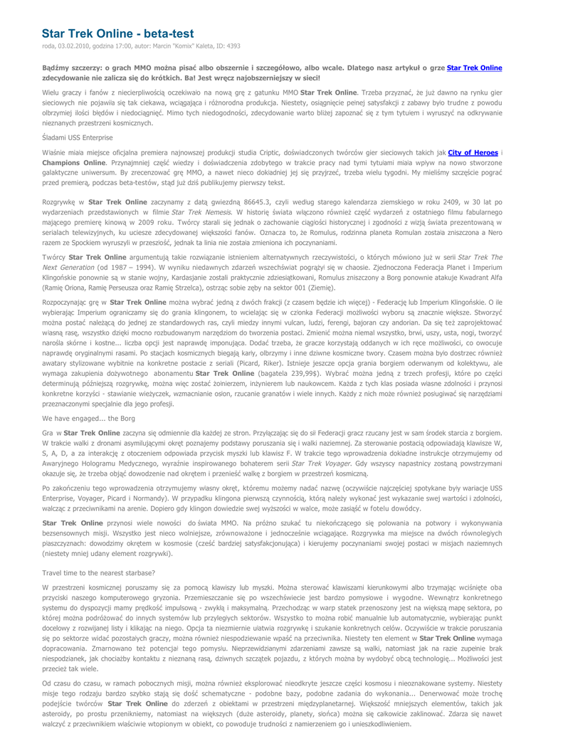 Star Trek Online - beta-test roda, 03.02.2010, godzina 17:00, autor: Marcin "Komix" Kaleta, ID: 4393 Bądźmy szczerzy: o grach MMO można pisać albo obszernie i szczegółowo, albo wcale. Dlatego nasz artykuł o grze Star Trek Online zdecydowanie nie zalicza się do krótkich. Ba! Jest wręcz najobszerniejszy w sieci! Wielu graczy i fanów z niecierpliwością oczekiwało na nową grę z gatunku MMO Star Trek Online. Trzeba przyznać, że już dawno na rynku gier sieciowych nie pojawiła się tak ciekawa, wciągająca i różnorodna produkcja. Niestety, osiągnięcie pełnej satysfakcji z zabawy było trudne z powodu olbrzymiej ilości błędów i niedociągnięć. Mimo tych niedogodności, zdecydowanie warto bliżej zapoznać się z tym tytułem i wyruszyć na odkrywanie nieznanych przestrzeni kosmicznych. Śladami USS Enterprise Właśnie miała miejsce oficjalna premiera najnowszej produkcji studia Criptic, doświadczonych twórców gier sieciowych takich jak City of Heroes i Champions Online. Przynajmniej część wiedzy i doświadczenia zdobytego w trakcie pracy nad tymi tytułami miała wpływ na nowo stworzone galaktyczne uniwersum. By zrecenzować grę MMO, a nawet nieco dokładniej jej się przyjrzeć, trzeba wielu tygodni. My mieliśmy szczęście pograć przed premierą, podczas beta-testów, stąd już dziś publikujemy pierwszy tekst. Rozgrywkę w Star Trek Online zaczynamy z datą gwiezdną 86645.3, czyli według starego kalendarza ziemskiego w roku 2409, w 30 lat po wydarzeniach przedstawionych w filmie Star Trek Nemesis. W historię świata włączono również część wydarzeń z ostatniego filmu fabularnego mającego premierę kinową w 2009 roku. Twórcy starali się jednak o zachowanie ciągłości historycznej i zgodności z wizją świata prezentowaną w serialach telewizyjnych, ku uciesze zdecydowanej większości fanów. Oznacza to, że Romulus, rodzinna planeta Romulan została zniszczona a Nero razem ze Spockiem wyruszyli w przeszłość, jednak ta linia nie została zmieniona ich poczynaniami. Twórcy Star Trek Online argumentują takie rozwiązanie istnieniem alternatywnych rzeczywistości, o których mówiono już w serii Star Trek The Next Generation (od 1987 – 1994). W wyniku niedawnych zdarzeń wszechświat pogrążył się w chaosie. Zjednoczona Federacja Planet i Imperium Klingońskie ponownie są w stanie wojny, Kardasjanie zostali praktycznie zdziesiątkowani, Romulus zniszczony a Borg ponownie atakuje Kwadrant Alfa (Ramię Oriona, Ramię Perseusza oraz Ramię Strzelca), ostrząc sobie zęby na sektor 001 (Ziemię). Rozpoczynając grę w Star Trek Online można wybrać jedną z dwóch frakcji (z czasem będzie ich więcej) - Federację lub Imperium Klingońskie. O ile wybierając Imperium ograniczamy się do grania klingonem, to wcielając się w członka Federacji możliwości wyboru są znacznie większe. Stworzyć można postać należącą do jednej ze standardowych ras, czyli miedzy innymi vulcan, ludzi, ferengi, bajoran czy andorian. Da się też zaprojektować własną rasę, wszystko dzięki mocno rozbudowanym narzędziom do tworzenia postaci. Zmienić można niemal wszystko, brwi, uszy, usta, nogi, tworzyć narośla skórne i kostne... liczba opcji jest naprawdę imponująca. Dodać trzeba, że gracze korzystają oddanych w ich ręce możliwości, co owocuje naprawdę oryginalnymi rasami. Po stacjach kosmicznych biegają karły, olbrzymy i inne dziwne kosmiczne twory. Czasem można było dostrzec również awatary stylizowane wybitnie na konkretne postacie z seriali (Picard, Riker). Istnieje jeszcze opcja grania borgiem oderwanym od kolektywu, ale wymaga zakupienia dożywotnego abonamentu Star Trek Online (bagatela 239,99$). Wybrać można jedną z trzech profesji, które po części determinują późniejszą rozgrywkę, można więc zostać żołnierzem, inżynierem lub naukowcem. Każda z tych klas posiada własne zdolności i przynosi konkretne korzyści - stawianie wieżyczek, wzmacnianie osłon, rzucanie granatów i wiele innych. Każdy z nich może również posługiwać się narzędziami przeznaczonymi specjalnie dla jego profesji. We have engaged... the Borg Gra w Star Trek Online zaczyna się odmiennie dla każdej ze stron. Przyłączając się do sił Federacji gracz rzucany jest w sam środek starcia z borgiem. W trakcie walki z dronami asymilującymi okręt poznajemy podstawy poruszania się i walki naziemnej. Za sterowanie postacią odpowiadają klawisze W, S, A, D, a za interakcję z otoczeniem odpowiada przycisk myszki lub klawisz F. W trakcie tego wprowadzenia dokładne instrukcje otrzymujemy od Awaryjnego Hologramu Medycznego, wyraźnie inspirowanego bohaterem serii Star Trek Voyager. Gdy wszyscy napastnicy zostaną powstrzymani okazuje się, że trzeba objąć dowodzenie nad okrętem i przenieść walkę z borgiem w przestrzeń kosmiczną. Po zakończeniu tego wprowadzenia otrzymujemy własny okręt, któremu możemy nadać nazwę (oczywiście najczęściej spotykane były wariacje USS Enterprise, Voyager, Picard i Normandy). W przypadku klingona pierwszą czynnością, którą należy wykonać jest wykazanie swej wartości i zdolności, walcząc z przeciwnikami na arenie. Dopiero gdy klingon dowiedzie swej wyższości w walce, może zasiąść w fotelu dowódcy. Star Trek Online przynosi wiele nowości do świata MMO. Na próżno szukać tu niekończącego się polowania na potwory i wykonywania bezsensownych misji. Wszystko jest nieco wolniejsze, zrównoważone i jednocześnie wciągające. Rozgrywka ma miejsce na dwóch równoległych płaszczyznach: dowodzimy okrętem w kosmosie (cześć bardziej satysfakcjonująca) i kierujemy poczynaniami swojej postaci w misjach naziemnych (niestety mniej udany element rozgrywki). Travel time to the nearest starbase? W przestrzeni kosmicznej poruszamy się za pomocą klawiszy lub myszki. Można sterować klawiszami kierunkowymi albo trzymając wciśnięte oba przyciski naszego ko