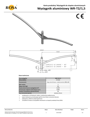 Karta produktu/ Wysięgnik do słupów aluminiowych Wysięgnik aluminiowy WR-T2/1,5 Dane techniczne Typ wysięgnika Kod produktu WR-T2/1,5 472102 Przeznaczenie słupy aluminiowe z zakooczeniem Ø60x180 Ilośd ramion Waga netto [kg] 2 8,8 0,249 0,096 60 oprawy uliczne Powierzchnia boczna wysięgnika [m2] Orientacyjna objętośd jednostkowa [m3] Średnica montażowa oprawy Ø [mm] Typ stosowanej oprawy anodowanie w 10 kolorach, każdy z możliwością wybłyszczania opcja malowania proszkowego wg RAL (inne farby na życzenie klienta) pakowanie: włóknina polipropylenowa certyfikat CE ważny w przypadku stosowania na słupach produkcji firmy ROSA Dane producenta Zakład Produkcji Sprzętu Oświetleniowego ROSA Stanisław Rosa 43-109 Tychy, ul. Strefowa 1, tel. +48 32 73 88 901, www.rosa.pl Edycja Data aktualizacji 2 30.03.2016 Podpis Strona 1/1
