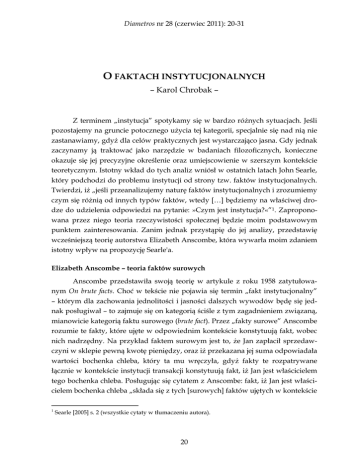 Diametros nr 28 (czerwiec 2011): 20-31 O FAKTACH INSTYTUCJONALNYCH – Karol Chrobak – Z terminem „instytucja” spotykamy się w bardzo różnych sytuacjach. Jeśli pozostajemy na gruncie potocznego użycia tej kategorii, specjalnie się nad nią nie zastanawiamy, gdyż dla celów praktycznych jest wystarczająco jasna. Gdy jednak zaczynamy ją traktować jako narzędzie w badaniach filozoficznych, konieczne okazuje się jej precyzyjne określenie oraz umiejscowienie w szerszym kontekście teoretycznym. Istotny wkład do tych analiz wniósł w ostatnich latach John Searle, który podchodzi do problemu instytucji od strony tzw. faktów instytucjonalnych. Twierdzi, iż „jeśli przeanalizujemy naturę faktów instytucjonalnych i zrozumiemy czym się różnią od innych typów faktów, wtedy […] będziemy na właściwej drodze do udzielenia odpowiedzi na pytanie: »Czym jest instytucja?«”1. Zaproponowana przez niego teoria rzeczywistości społecznej będzie moim podstawowym punktem zainteresowania. Zanim jednak przystąpię do jej analizy, przedstawię wcześniejszą teorię autorstwa Elizabeth Anscombe, która wywarła moim zdaniem istotny wpływ na propozycję Searle'a. Elizabeth Anscombe – teoria faktów surowych Anscombe przedstawiła swoją teorię w artykule z roku 1958 zatytułowanym On brute facts. Choć w tekście nie pojawia się termin „fakt instytucjonalny” – którym dla zachowania jednolitości i jasności dalszych wywodów będę się jednak posługiwał – to zajmuje się on kategorią ściśle z tym zagadnieniem związaną, mianowicie kategorią faktu surowego (brute fact). Przez „fakty surowe” Anscombe rozumie te fakty, które ujęte w odpowiednim kontekście konstytuują fakt, wobec nich nadrzędny. Na przykład faktem surowym jest to, że Jan zapłacił sprzedawczyni w sklepie pewną kwotę pieniędzy, oraz iż przekazana jej suma odpowiadała wartości bochenka chleba, który ta mu wręczyła, gdyż fakty te rozpatrywane łącznie w kontekście instytucji transakcji konstytuują fakt, iż Jan jest właścicielem tego bochenka chleba. Posługując się cytatem z Anscombe: fakt, iż Jan jest właścicielem bochenka chleba „składa się z tych [surowych] faktów ujętych w kontekście 1 Searle [2005] s. 2 (wszystkie cytaty w tłumaczeniu autora). 20 Karol Chrobak ◦ O faktach instytucjonalnych naszych instytucji”2. Ponieważ na kontekst faktów nadrzędnych składają się określone instytucje, fakty te można określić mianem faktów instytucjonalnych. Zaproponowana przez Anscombe koncepcja faktów surowych nieco się komplikuje, gdy rozważymy kilka ich pięter. Weźmy dla przykładu taki oto fakt: „Jan jest prezesem spółki X”. Konstytuuje go inny fakt, polegający na tym, iż „Jan przez Radę Nadzorczą został wybrany prezesem spółki X”, rozpatrywany w kontekście odpowiedniej procedury wyboru kierownictwa firmy. Ten z kolei może zostać potwierdzony jeszcze bardziej elementarnym faktem, takim, iż „Jan w trakcie wyboru na prezesa spółki X otrzymał największą liczbę głosów ze wszystkich kandydatów” rozpatrywanym również w kontekście powyższej procedury. Ta hierarchiczna struktura wyjaśnień – którą można by jeszcze ciągnąć dalej – pokazuje, iż fakt, który w jednym wyjaśnieniu jest niejako „na dole”, czyli jest traktowany jako fakt surowy, w innym może być już traktowany jako fakt instytucjonalny. Struktura ta przedstawiałaby się następująco (por. diagram): prawdziwość opisu C zakłada prawdziwość opisu B umieszczonego w kontekście K2, zaś prawdziwość opisu B zakłada jeszcze bardziej fundamentalny opis A umieszczony w kontekście K1. Pojęcie faktu surowego ma zatem charakter relatywny. Na relatywizm ten wyraźnie wskazuje sama Anscombe: „W odniesieniu do wielu opisów zdarzeń czy stanów rzeczy, co do których twierdzi się, że zachodzą, możemy zapytać, jakie w ich przypadku są surowe fakty; będziemy przez to rozumieli fakty, które mają miejsce i dzięki którym, we właściwym kontekście, taki a taki opis jest prawdziwy lub fałszywy, i które są bardziej „surowe” niż rzekomy fakt odpowiadający temu opisowi”3. A zatem o tym, czy dany fakt jest surowy czy nie, decyduje to, czy stanowi 2 Anscombe [1958] s. 69. 3 Ibidem, s. 71. 21 Karol Chrobak ◦ O faktach instytucjonalnych on podstawę do wyjaśnienia faktu wobec niego nadrzędnego (czyli mniej „surowego”), czy też podrzędnego (czyli bardziej „surowego”). W artykule Anscombe znajdujemy sześć warunków szczegółowo opisujących tę strukturę. Na szczególną uwagę zasługują trzy z nich: (1) Po pierwsze (w tekście warunek drugi), instytucja konieczna do zaistnienia faktu opisanego w C (która jest składnikiem kontekstu K2) może, ale nie musi być konieczna do zaistnienia faktów opisanych w B. Jeśli jednak jest konieczna, oczywiście oznacza to, iż konteksty K1 oraz K2 muszą się częściowo bądź całkowicie pokrywać. W przeciwnym bowiem razie fakt opisany w B byłby po prostu niezrozumiały. Z tego rodzaju przypadkiem mieliśmy do czynienia chociażby w przytoczonym powyżej przykładzie Jana, będącego prezesem spółki X, gdzie na obu piętrach wyjaśnień pojawia się ten sam kontekst instytucjonalny (procedura wyboru kierownictwa firmy). (2) Po drugie (w tekście warunek czwarty), jeśli fakt opisany w B ma miejsce oraz składająca się na kontekst K2 instytucja faktycznie obowiązuje, wówczas możemy powiedzieć, że zachodzi również fakt opisany w C. Anscombe podkreśla jednak, iż obowiązywanie w określonej sytuacji danej instytucji zakłada normalność towarzyszących tej sytuacji okoliczności (czyli innymi słowy wyklucza zachodzenie okoliczności nadzwyczajnych, które unieważniałyby odniesienie do tej konkretnej sytuacji pojęcia danej instytucji). O tym, iż okoliczności rozważanego faktu są normalne, upewniamy się negatywnie, wykluczając zachodzenie s