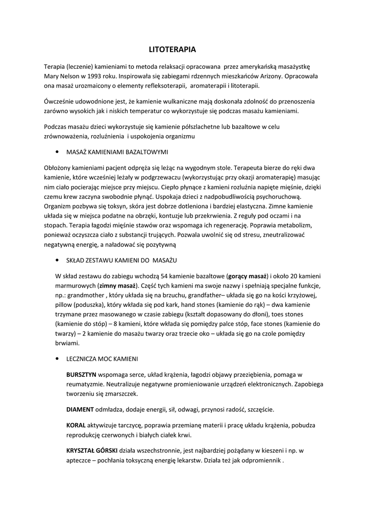 LITOTERAPIA Terapia (leczenie) kamieniami to metoda relaksacji opracowana przez amerykańską masażystkę Mary Nelson w 1993 roku. Inspirowała się zabiegami rdzennych mieszkańców Arizony. Opracowała ona masaż urozmaicony o elementy refleksoterapii, aromaterapii i litoterapii. Ówcześnie udowodnione jest, że kamienie wulkaniczne mają doskonała zdolność do przenoszenia zarówno wysokich jak i niskich temperatur co wykorzystuje się podczas masażu kamieniami. Podczas masażu dzieci wykorzystuje się kamienie półszlachetne lub bazaltowe w celu zrównoważenia, rozluźnienia i uspokojenia organizmu MASAŻ KAMIENIAMI BAZALTOWYMI Obłożony kamieniami pacjent odpręża się leżąc na wygodnym stole. Terapeuta bierze do ręki dwa kamienie, które wcześniej leżały w podgrzewaczu (wykorzystując przy okazji aromaterapię) masując nim ciało pocierając miejsce przy miejscu. Ciepło płynące z kamieni rozluźnia napięte mięśnie, dzięki czemu krew zaczyna swobodnie płynąć. Uspokaja dzieci z nadpobudliwością psychoruchową. Organizm pozbywa się toksyn, skóra jest dobrze dotleniona i bardziej elastyczna. Zimne kamienie układa się w miejsca podatne na obrzęki, kontuzje lub przekrwienia. Z reguły pod oczami i na stopach. Terapia łagodzi mięśnie stawów oraz wspomaga ich regenerację. Poprawia metabolizm, ponieważ oczyszcza ciało z substancji trujących. Pozwala uwolnić się od stresu, zneutralizować negatywną energię, a naładować się pozytywną SKŁAD ZESTAWU KAMIENI DO MASAŻU W skład zestawu do zabiegu wchodzą 54 kamienie bazaltowe (gorący masaż) i około 20 kamieni marmurowych (zimny masaż). Część tych kamieni ma swoje nazwy i spełniają specjalne funkcje, np.: grandmother , który układa się na brzuchu, grandfather– układa się go na kości krzyżowej, pillow (poduszka), który wkłada się pod kark, hand stones (kamienie do rąk) – dwa kamienie trzymane przez masowanego w czasie zabiegu (kształt dopasowany do dłoni), toes stones (kamienie do stóp) – 8 kamieni, które wkłada się pomiędzy palce stóp, face stones (kamienie do twarzy) – 2 kamienie do masażu twarzy oraz trzecie oko – układa się go na czole pomiędzy brwiami. LECZNICZA MOC KAMIENI BURSZTYN wspomaga serce, układ krążenia, łagodzi objawy przeziębienia, pomaga w reumatyzmie. Neutralizuje negatywne promieniowanie urządzeń elektronicznych. Zapobiega tworzeniu się zmarszczek. DIAMENT odmładza, dodaje energii, sił, odwagi, przynosi radość, szczęście. KORAL aktywizuje tarczycę, poprawia przemianę materii i pracę układu krążenia, pobudza reprodukcję czerwonych i białych ciałek krwi. KRYSZTAŁ GÓRSKI działa wszechstronnie, jest najbardziej pożądany w kieszeni i np. w apteczce – pochłania toksyczną energię lekarstw. Działa też jak odpromiennik . PERŁY, czyli „ łzy oceanu”, pozwalają oczyścić charakter i duszę. Noszone z miłością stają się talizmanami szczęścia. Wspomagają leczenie osteoporozy. Wykorzystywane są w produkcji kosmetyków w celu zapewnienia świeżej cery. RUBIN wzmacnia serce, oczyszcza krew, pobudza krążenie. SZAFIR zwany władcą klejnotów przerasta wszystkie inne kamienie. Najskuteczniejsze lekarstwo przeciw truciźnie, ucisza wzburzone nerwy, gasi gorączkę. Daje pogodę ducha. Daria Tomala
