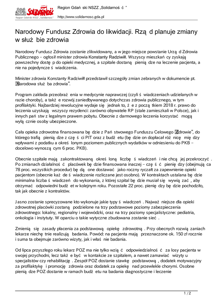 Region Gda ski NSZZ „Solidarno http://www.solidarnosc.gda.pl Narodowy Fundusz Zdrowia do likwidacji. Rz w słu bie zdrowia d planuje zmiany Narodowy Fundusz Zdrowia zostanie zlikwidowany, a w jego miejsce powstanie Urz d Zdrowia Publicznego ‒ ogłosił minister zdrowia Konstanty Radziwiłł. Wszyscy mieszka cy zyskaj powszechny dost p do opieki medycznej, a szpitale dostan pieni dze na leczenie pacjenta, a nie na pojedyncze wiadczenia. Minister zdrowia Konstanty Radziwiłł przedstawił szczegóły zmian zebranych w dokumencie pt. „Narodowa słu ba zdrowia . Program zakłada przeobra enia w medycynie naprawczej (czyli wiadczeniach udzielanych w razie choroby), a tak e rozwój zaniedbywanego dotychczas zdrowia publicznego, w tym profilaktyki. Najbardziej rewolucyjne wydaje si jednak to, e z pocz tkiem 2018 r. prawo do leczenia uzyskaj wszyscy rezydenci: zarówno obywatele RP (stale zamieszkali w Polsce), jak i innych pa stw z legalnym prawem pobytu. Obecnie z darmowego leczenia korzysta mog wył cznie osoby ubezpieczone. Cała opieka zdrowotna finansowana b dzie z Pa stwowego Funduszu Celowego „Zdrowie , do którego trafi pieni dze z cz ci PIT oraz z bud etu (b dzie on dopłacał ró nic mi dzy wpływami z podatku a okre lonym poziomem publicznych wydatków w odniesieniu do PKB ‒ docelowo wynosz cym 6 proc. PKB). Obecnie szpitale maj zakontraktowan okre lon liczb wiadcze i nie chc jej przekroczy . Po zmianach działalno placówek b dzie finansowana inaczej ‒ cz pieni dzy (obejmuj ca 78 proc. wszystkich procedur) b d one dostawa jako roczny ryczałt za zapewnienie opieki pacjentom (obecnie ka de wiadczenie rozliczane jest osobno). W kontraktach ustalana b dzie minimalna liczba wiadcze do wykonania, z której szpital b dzie musiał si wywi za , aby otrzyma odpowiedni bud et w kolejnym roku. Pozostałe 22 proc. pieni dzy b dzie pochodziło, tak jak obecnie z kontraktów. Jasno zostanie sprecyzowane kto wykonuje jakie typy wiadcze . Najwa niejsze dla opieki zdrowotnej placówki zostan podzielone na trzy podstawowe poziomy zabezpieczenia zdrowotnego: lokalny, regionalny i wojewódzki, oraz na trzy poziomy specjalistyczne: pediatria, onkologia i instytuty. W oparciu o takie wytyczne zbudowana zostanie sie . Zmieni si zasady płacenia za podstawow opiek zdrowotn . Przy obecnych rozwi zaniach lekarze niech tnie realizuj badania. Powód: na pacjenta maj przeznaczone ok. 150 zł rocznie i suma ta obejmuje zarówno wizyty, jak i wła nie badania. Od lipca przyszłego roku lekarz POZ ma nie tylko wzi odpowiedzialno za losy pacjenta w swojej przychodni, lecz tak e by w kontakcie ze szpitalem, a nawet zamawia wizyty u specjalistów czy rehabilitacj . Zespół POZ dostanie stawk podstawow , dodatek motywacyjny za profilaktyk i promocj zdrowia oraz dodatek za opiek nad przewlekle chorymi. Osobne pieni dze POZ dostanie w ramach bud etu na badania diagnostyczne i leczenie 1/2 Region Gda ski NSZZ „Solidarno http://www.solidarnosc.gda.pl specjalistyczne. Ewentualne oszcz dno zostanie w kieszeni wi cej pieni dzy ci (np. na liczbie bada ) nie spowoduj , e przychodni Od stycznia 2018 r. Narodowy Fundusz Zdrowia b dzie zast piony „systemem administrowanym przez struktury ministra zdrowia i Wojewódzkich Urz dów Zdrowia . ed. hd ródło: Dział Informacji KK 2/2 Powered by TCPDF (www.tcpdf.org)