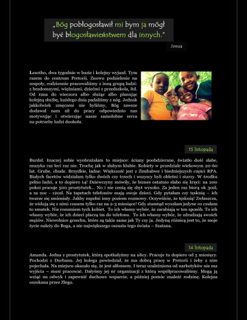 „Bóg pobłogosławił mi bym ja mógł być błogosławieństwem dla innych.” Josua Lesotho, dwa tygodnie w bazie i kolejny wyjazd. Tym razem do centrum Pretorii. Znowu podzielenie na zespoły, codziennie pracowaliśmy z inną grupą ludzi: z bezdomnymi, więźniami, dziećmi z przedszkola, itd. Od rana do wieczora albo służąc albo planując kolejną służbę, każdego dnia padaliśmy z nóg. Jednak jakkolwiek zmęczeni nie byliśmy, Bóg zawsze dodawał nam sił do pracy odpowiednio nas motywując i otwierając nasze samolubne serca na potrzeby ludzi dookoła. 15 listopada Burdel. Inaczej sobie wyobrażałam to miejsce: ściany poobdzierane, światło dość słabe, muzyka raz leci raz nie. Trochę jak w słabym klubie. Kobiety w przedziale wiekowym 20-60 lat. Grube, chude. Brzydkie, ładne. Większość jest z Zimbabwe i biedniejszych części RPA. Białych facetów widziałam tylko dwóch czy trzech i wszyscy byli obleśni i starzy. W środku pełno ludzi, a to dopiero 14! Dziewczyny mówiły, że biznes ostatnio słabo się kręci: na 200 pokoi pracuje 500 prostytutek… No i nie cenią się zbyt wysoko. Za jeden raz biorą ok 30zł, a za noc - 120zl. Na tapetach telefonów mają swoje dzieci. Gdy pytałam czy tęsknią – ich twarze się zmieniały. Jakby zupełni inny poziom rozmowy. Oczywiście, że tęsknią! Zwłaszcza, że widują się z nimi czasem tylko raz na 2-3 miesiące! Gdy stamtąd wyszłam jedyne co czułam to smutek. Nie rozumiem tych kobiet. To ich własny wybór, że zarabiają w ten sposób. To ich własny wybór, że ich dzieci płaczą im do telefonu. To ich własny wybór, że zdradzają swoich mężów. Niewolnice grzechu, które są takie same jak Ty czy ja. Jedyną różnicą jest to, że moje życie należy do Boga, a nie największego oszusta tego świata – Szatana. 14 listopada Amanda. Jedna z prostytutek, którą spotkałyśmy na ulicy. Pracuje tu dopiero od 5 miesięcy. Pochodzi z Durbanu. Jej kolega powiedział, że ma dobrą pracę w Pretorii i żeby z nim pojechała. Na miejscu okazało się, że jest alfonsem. I teraz uzależniona od narkotyków nie ma wyjścia – musi pracować. Dałyśmy jej nr organizacji z którą współpracowaliśmy. Mogą ją wziąć na odwyk i zapewnić duchowe wsparcie, a później pomóc znaleźć rodzinę. Kolejna oszukana przez Złego. 16 listopada Shelter. Miejsce dla nastoletnich chłopaków z całej Afryki, gdzie mogą mieszkać. Wygląda jak więzienie: wszędzie kraty, brudno, rozwalone krzesła, generator z prądem włączyli tylko na nasz przyjazd. Nick. Chłopak z Kongo. 15 lat. Jego rodzice zostali zabici. 2 lata temu przyjechał do RPA. Przez jakiś czas mieszkał u jakiegoś faceta, który ostatecznie przywiózł go tu, bo nie miał dokumentów. Jak mi to powiedział, nie wiedziałam co odpowiedzieć. Co nas łączy? Nic. Chyba, że… I zaczęłam mu opowiadać o Niebie. O Ojcu, który jest jedynym prawdziwym, troszczącym się. O domu, którego nie ma. I że to wszystko może stać się rzeczywistością jeśli odda swoje życie Bogu. Mocno niesamowite było, że gdy ktoś go nagle zawołał, wolał zostać ze mną i słuchać. Obiecał, że przyjdzie jeszcze następnego dnia porozmawiać w trakcie sportów. 17 listopada Fun day. Czyli dzień gier i zabaw dla chłopaków z Shelter. Gadałam z jednym chłopakiem, z którym troszkę zakumplowałam się poprzedniego dnia. Na imię ma Abraham, 17 lat, jego mama pochodziła z Botzwany, ojciec z RPA. Oboje zginęli w wypadku samochodowym. Ulubiony przedmiot w szkole, to matma. W przyszłości chciałby grać w nogę. I po całym dniu się żegnamy i nagle mnie pyta „to kiedy się znowu widzimy?” i mnie wcięło. Co miałam mu powiedzieć? Nigdy się już nie zobaczymy. Patrzył na mnie swoimi wielkimi oczami i nie mógł odejść. Ktoś w końcu szczerze zainteresował się jego życiem. Dał mu coś czego potrzebował. I nagle to zabrał. Chłopak nie ma rodziców, zdrowych przyjaźni, a ja dając mu szczyptę tego – teraz go z tego bezczelnie okradłam. Znowu zabrano mu coś ważnego. To nie jest fair. Przez kolejny dzień chodziłam jak struta zastanawiając się tylko po co istnieją misje krótkoterminowe. Wierzę jednak, że i w tym Bóg ma swój plan. Kolejny, którego nie rozumiem. To tylko kilka historii, które wybrałam by Wam opowiedzieć. Zanim to wszystko miało miejsce zastanawiałam się co ja mogę dać tym ludziom? O czym mogę z nimi rozmawiać? Nikt mnie nie zgwałcił, nie porwał, nigdy nie słyszałam, żeby moi rodzice się choćby kłócili. Bóg jednak pokazał mi, że nie potrzebuję żadnego traumatycznego przeżycia by mnie używał wobec tych ludzi. Największą rzeczą jaką mam jest moc Ewangelii i śmierci Jego Syna na krzyżu za nasze grzechy. Niby nic, a jednak wszystko. Nadzieja jaką mogłam dać tym ludziom jest największą ze wszystkich. Każdego dnia słysząc wszystkie te historie, ogarniał mnie niesamowity smutek. Każda z tych osób została oszukana. Wierzyli w lepszą przyszłość, której ten świat nie może im w żaden sposób dać. Jeden chłopak, gdy podsumowywaliśmy ten wyjazd, powiedział, że zastanawiał się, czemu Bóg go pobłogosławił takim wygodnym życiem, a inni ludzie muszą uprawiać prostytucje by zarobić i to nawet nie na chleb, ale narkotyki! I odpowiedzią było „God blessed me so I can be a blessing for other people” (Bóg pobłogosławił mi, bym ja mógł być błogosławieństwem dla innych). I ja poznawszy wcześniej tą jedyną, prawdziwą nadzieje, mogę teraz wskazywać na nią tym wszystkim, którzy jej nie doświadczyli. Na nadzieję życia wolnego od grzechu. Życia w świętości z Panem Bogiem. Proszę, módl się… Dziękując Bogu za niesamowicie dobry czas w trakcie służby w centrum Pretorii, Za zmiany jakie we mnie dokonuje, Proś Boga by pokazywał mi co mam robić po zakończeniu szkolenia. Z początku chciałam dołączyć do służby z ludźmi ch