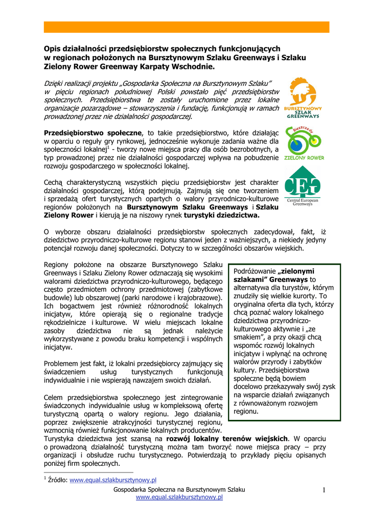 Opis działalności przedsiębiorstw społecznych funkcjonujących w regionach położonych na Bursztynowym Szlaku Greenways i Szlaku Zielony Rower Greenway Karpaty Wschodnie. Dzięki realizacji projektu „Gospodarka Społeczna na Bursztynowym Szlaku” w pięciu regionach południowej Polski powstało pięć przedsiębiorstw społecznych. Przedsiębiorstwa te zostały uruchomione przez lokalne organizacje pozarządowe – stowarzyszenia i fundację, funkcjonują w ramach prowadzonej przez nie działalności gospodarczej. Przedsiębiorstwo społeczne, to takie przedsiębiorstwo, które działając w oparciu o reguły gry rynkowej, jednocześnie wykonuje zadania ważne dla społeczności lokalnej1 - tworzy nowe miejsca pracy dla osób bezrobotnych, a typ prowadzonej przez nie działalności gospodarczej wpływa na pobudzenie rozwoju gospodarczego w społeczności lokalnej. Cechą charakterystyczną wszystkich pięciu przedsiębiorstw jest charakter działalności gospodarczej, którą podejmują. Zajmują się one tworzeniem i sprzedażą ofert turystycznych opartych o walory przyrodniczo-kulturowe regionów położonych na Bursztynowym Szlaku Greenways i Szlaku Zielony Rower i kierują je na niszowy rynek turystyki dziedzictwa. O wyborze obszaru działalności przedsiębiorstw społecznych zadecydował, fakt, iż dziedzictwo przyrodniczo-kulturowe regionu stanowi jeden z ważniejszych, a niekiedy jedyny potencjał rozwoju danej społeczności. Dotyczy to w szczególności obszarów wiejskich. Regiony położone na obszarze Bursztynowego Szlaku Greenways i Szlaku Zielony Rower odznaczają się wysokimi walorami dziedzictwa przyrodniczo-kulturowego, będącego często przedmiotem ochrony przedmiotowej (zabytkowe budowle) lub obszarowej (parki narodowe i krajobrazowe). Ich bogactwem jest również różnorodność lokalnych inicjatyw, które opierają się o regionalne tradycje rękodzielnicze i kulturowe. W wielu miejscach lokalne zasoby dziedzictwa nie są jednak należycie wykorzystywane z powodu braku kompetencji i wspólnych inicjatyw. Problemem jest fakt, iż lokalni przedsiębiorcy zajmujący się świadczeniem usług turystycznych funkcjonują indywidualnie i nie wspierają nawzajem swoich działań. Podróżowanie „zielonymi szlakami” Greenways to alternatywa dla turystów, którym znudziły się wielkie kurorty. To oryginalna oferta dla tych, którzy chcą poznać walory lokalnego dziedzictwa przyrodniczokulturowego aktywnie i „ze smakiem”, a przy okazji chcą wspomóc rozwój lokalnych inicjatyw i wpłynąć na ochronę walorów przyrody i zabytków kultury. Przedsiębiorstwa społeczne będą bowiem docelowo przekazywały swój zysk na wsparcie działań związanych z równoważonym rozwojem regionu. Celem przedsiębiorstwa społecznego jest zintegrowanie świadczonych indywidualnie usług w kompleksową ofertę turystyczną opartą o walory regionu. Jego działania, poprzez zwiększenie atrakcyjności turystycznej regionu, wzmocnią również funkcjonowanie lokalnych producentów. Turystyka dziedzictwa jest szansą na rozwój lokalny terenów wiejskich. W oparciu o prowadzoną działalność turystyczną można tam tworzyć nowe miejsca pracy – przy organizacji i obsłudze ruchu turystycznego. Potwierdzają to przykłady pięciu opisanych poniżej firm społecznych. 1 Źródło: www.equal.szlakbursztynowy.pl Gospodarka Społeczna na Bursztynowym Szlaku www.equal.szlakbursztynowy.pl 1 Green Traveller Turystyka Dziedzictwa Kulturowego, Sucha Beskidzka Przedsiębiorstwo Green Traveller działa przy Babiogórskim Stowarzyszeniu „Zielona Linia” w regionie babiogórskim. Promuje ideę turystyki aktywnej i zrównoważonej, a poprzez edukację i zabawę przekazuje to, co w lokalnej kulturze jest najcenniejsze. Green Traveller oferuje niecodzienne formy spędzania czasu wolnego. W odpowiedzi na rosnące zainteresowanie turystyką dziedzictwa w ofercie biura znajduje się wiele tematycznych wycieczek, w trakcie których można poznać przyrodę Babiej Góry – Królowej Beskidów i tradycję zamieszkujących babiogórski region ludzi. Oprócz zwiedzania najsłynniejszych zabytków regionu tj. Skansen na Markowych Równienkach, dwór szlachecki na Wysowej, zamek w Suchej Beskidzkiej, zwany „Małym Wawelem” i karczma „Rzym”, Green Traveller oferuje możliwość uczestniczenia w życiu regionu poprzez udział w pokazach i warsztatach folklorystycznych. W programach wycieczek m.in. warsztaty z techniki malowania na szkle, wytwarzania zabawek z siana oraz orawskich zabawek szmacianych, wypieku chleba według tradycyjnych metod oraz garncarstwa. Słynną atrakcją regionu jest pokaz wyrobu drewnianych zabawek. Tradycja wytwarzania tzw. zabawek strzyszawskich sięga XVIII wieku. Green Traveller, Turystyka Dziedzictwa Kulturowego ul. Mickiewicza 107, 34-200 Sucha Beskidzka tel./fax.: 033 874 37 17, 033 874 25 25, e-mail: [email protected], www.greentraveller.com.pl Horyzonty ITD. Inspiracja Turystyka Doradztwo, Lanckorona Firma "Horyzonty ITD " Inspiracja Turystka Doradztwo powstała na terenie Lanckorony, uroczej miejscowości położonej niedaleko Krakowa. Mając na uwadze rozwój turystyki dziedzictwa kulturowego, powołało ją do życia Stowarzyszenie Ekologiczno - Kulturalne "Na Bursztynowym Szlaku", zatrudniając w czerwcu 2006r. siedem osób z Lanckorony i okolic. W swojej działalności przedsiębiorstwo społeczne Horyzonty ITD kieruje się ochroną dziedzictwa kulturowo-przyrodniczego Lanckorony oraz promocją produktów lokalnych z regionów położonych na Bursztynowym Szlaku Greenways. Firma organizuje wycieczki dla turystów indywidualnych i grupowych z przewodnikiem, który oprowadzi po lanckorońskim Ekomuzeum, a także pokaże Kalwarię Zebrzydowską i Wadowice. W ofercie warsztaty manuale: haftu, bibułkarstwa, ceramiki i wyrobu świec, a w prowadzonym przez firmę Sklepiku Produktów Lokalnych można znaleźć ręcznie wykonane pamiątki: zapachowe wor