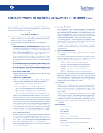 Szczególne Warunki Ubezpieczenia Zdrowotnego INTER VISION GOLD Niniejsze Szczególne warunki ubezpieczenia zdrowotnego INTER VISION GOLD, zwane dalej SWU, stosuje się do umów ubezpieczenia zdrowotnego INTER VISION zawieranych przez Towarzystwo Ubezpieczeń INTER Polska S.A. 8) INTER Polska wypłaca w razie choroby Ubezpieczonego, jego wypadku lub leczenia związanego z ciążą i porodem dzienny zasiłek w wysokości 150 PLN za każdą dobę koniecznego z punktu widzenia medycznego leczenia szpitalnego Ubezpieczonego, jeśli pobyt w szpitalu był dłuższy niż 24 godziny, z zastrzeżeniem, iż INTER Polska wypłaca dzienny zasiłek szpitalny za maksymalnie 90 dób pobytu Ubezpieczonego w szpitalu w roku ubezpieczeniowym. §1 Zakres świadczeń INTER Polska 1. 2. Zakres świadczeń zdrowotnych realizowanych w ramach ubezpieczenia INTER VISION GOLD określony jest w wykazie świadczeń zdrowotnych. Zasady realizacji świadczeń zdrowotnych określone są w §13 OWU. Przy zgłoszeniu roszczenia o wypłatę świadczenia z tytułu dziennego zasiłku szpitalnego, INTER Polska wymaga przedłożenia kopii karty informacyjnej leczenia szpitalnego lub kopii karty wypisu ze szpitala. W ramach ubezpieczenia zdrowotnego INTER VISION GOLD INTER Polska pokrywa: 1) Koszty ambulatoryjnych konsultacji lekarskich (z wyłączeniem lekarza dentysty, lekarza rehabilitacji medycznej oraz lekarza medycyny pracy) oraz leczenia ambulatoryjnego zgodnie z Wykazem nr 1 „Konsultacje i zabiegi ambulatoryjne”. 2) Koszty domowych wizyt lekarskich internistów, pediatrów i lekarzy rodzinnych, w wyniku nieszczęśliwego wypadku i nagłego zachorowania. W przypadku leczenia Ubezpieczonego w szpitalu w związku z chorobami psychicznymi i psychiatrycznymi nie przysługuje prawo do otrzymania dziennego zasiłku szpitalnego. 9) Koszty zabiegów protetycznych INTER Polska pokrywa koszty zabiegów protetycznych określonych w Wykazie nr 7 „Protetyka”. Koszty domowych wizyt lekarskich pokrywane są na podstawie rachunku na zasadach określonych w § 13 pkt 5–10 OWU oraz realizowane są w ramach usług assistance na zasadach określonych w odrębnych Szczególnych Warunkach Ubezpieczenia. Koszty zabiegów protetycznych pokrywane są wyłącznie na podstawie rachunku na zasadach określonych w § 13 pkt 5–10 OWU w wysokości 25% wartości świadczenia określonej w wykazie z jednoczesnym ograniczeniem do: 3) Koszty ambulatoryjnie przeprowadzonych badań laboratoryjnych zaleconych przez lekarza specjalistę, zgodnie z Wykazem nr 2 „Laboratorium”. – 1 000 PLN w ciągu pierwszego roku ubezpieczeniowego, – 2 000 PLN w ciągu dwóch pierwszych lat ubezpieczeniowych, 4) Koszty ambulatoryjnie przeprowadzonych badań diagnostycznych zaleconych przez lekarza specjalistę, zgodnie z Wykazem nr 3 „Diagnostyka”. – 3 000 PLN w ciągu trzech pierwszych lat ubezpieczeniowych, – 4 000 PLN w ciągu czterech pierwszych lat ubezpieczeniowych, 5) Koszty leczenia dentystycznego – 5 000 PLN w ciągu każdego kolejnego roku ubezpieczeniowego. INTER Polska pokrywa koszty świadczeń (koszty materiałów i robocizny) zgodnie z Wykazem nr 6 „Dentystyka”. Powyższe limity dotyczą czasu trwania umowy w wariancie INTER VISION GOLD. 6) Ubezpieczony jest zobowiązany przed rozpoczęciem leczenia przedłożyć INTER Polska plan leczenia wraz z kosztorysem. INTER Polska zobowiązuje się do bezzwłocznego zbadania tego planu. INTER Polska pokrywa koszty świadczeń protetycznych powstałe po akceptacji planu leczenia. Koszty leczenia ortodontycznego Koszty leczenia ortodontycznego (koszty materiałów i robocizny) objęte są ochroną w przypadku Ubezpieczonych do 18 roku życia do wysokości: – 1 000 PLN w ciągu pierwszego roku ubezpieczeniowego, – 2 000 PLN w ciągu dwóch pierwszych lat ubezpieczeniowych, – 3 000 PLN w ciągu trzech pierwszych lat ubezpieczeniowych, – 4 000 PLN w ciągu czterech pierwszych lat ubezpieczeniowych, – 4 000 PLN w ciągu każdych kolejnych czterech lat ubezpieczeniowych. 10) Koszty leków INTER Polska pokrywa koszty leków aktualnie zarejestrowanych i dopuszczonych do obrotu w Polsce, koniecznych do zastosowania przez Ubezpieczonego, pozostałe po potrąceniu refundacji NFZ maksymalnie do kwoty 500 PLN w roku ubezpieczeniowym. Leki muszą zostać zlecone przez lekarza i zakupione w aptece. Za leki nie uważa się, nawet jeśli zostały przepisane przez lekarza: witamin i mikroelementów, znieczuleń, szczepionek (za wyjątkiem szczepionki przeciw żółtaczce typu AB), preparatów odżywczych i wzmacniających, środków dezynfekcyjnych i kosmetycznych, wody mineralnej, dodatków do kąpieli itp. Powyższe limity dotyczą czasu trwania umowy w wariancie INTER VISION GOLD. W przypadku ubezpieczenia dzieci bez rodzica lub opiekuna prawnego, koszty leczenia ortodontycznego są wyłączone z zakresu ochrony ubezpieczeniowej. Ubezpieczony jest zobowiązany przed rozpoczęciem leczenia przedłożyć INTER Polska plan przebiegu leczenia wraz z kosztorysem oraz z uzasadnieniem medycznej konieczności przeprowadzenia zabiegu. INTER Polska zobowiązuje się do bezzwłocznego zbadania tego planu. INTER Polska pokrywa koszty świadczeń ortodontycznych powstałe po akceptacji planu leczenia wyłącznie na podstawie rachunku na zasadach określonych w § 13 pkt 5 – 10 OWU. 7) SWU|visgold|61/2012|4.0 Dzienny zasiłek szpitalny Koszty środków pomocniczych INTER Polska pokrywa koszt zakupu lub wypożyczenia środków pomocniczych koniecznych do zastosowania w związku z zabiegiem chirurgicznym wykonywanym w trakcie leczenia szpitalnego, na podstawie rachunku (na zasadach określonych w § 13 pkt 5 – 10 OWU) oraz kopii potwierdzenia medycznej konieczności zakupu danego środka, zgodnie z Wykazem nr 4 „Środki pomocnicze”. Świadczenie związane ze środkiem pomocniczym danego rodzaju przysługuje raz w roku ubezpieczeniowym. 11) Koszty profilaktycznego przeglądu stanu zdrowia zgodnie z W