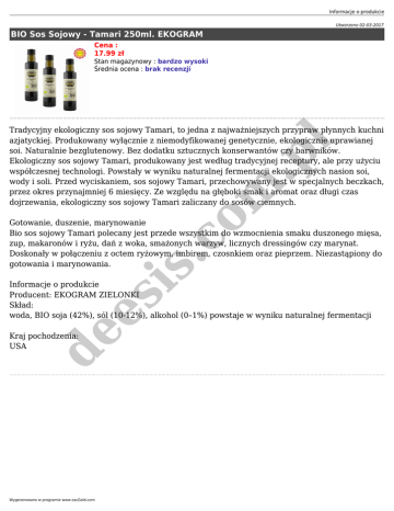 Informacje o produkcie Utworzono 02-03-2017 BIO Sos Sojowy - Tamari 250ml. EKOGRAM Cena : 17.99 zł Stan magazynowy : bardzo wysoki Średnia ocena : brak recenzji .c o m .p l Tradycyjny ekologiczny sos sojowy Tamari, to jedna z najważniejszych przypraw płynnych kuchni azjatyckiej. Produkowany wyłącznie z niemodyfikowanej genetycznie, ekologicznie uprawianej soi. Naturalnie bezglutenowy. Bez dodatku sztucznych konserwantów czy barwników. Ekologiczny sos sojowy Tamari, produkowany jest według tradycyjnej receptury, ale przy użyciu współczesnej technologi. Powstały w wyniku naturalnej fermentacji ekologicznych nasion soi, wody i soli. Przed wyciskaniem, sos sojowy Tamari, przechowywany jest w specjalnych beczkach, przez okres przynajmniej 6 miesięcy. Ze względu na głęboki smak i aromat oraz długi czas dojrzewania, ekologiczny sos sojowy Tamari zaliczany do sosów ciemnych. es is Gotowanie, duszenie, marynowanie Bio sos sojowy Tamari polecany jest przede wszystkim do wzmocnienia smaku duszonego mięsa, zup, makaronów i ryżu, dań z woka, smażonych warzyw, licznych dressingów czy marynat. Doskonały w połączeniu z octem ryżowym, imbirem, czosnkiem oraz pieprzem. Niezastąpiony do gotowania i marynowania. de Informacje o produkcie Producent: EKOGRAM ZIELONKI Skład: woda, BIO soja (42%), sól (10-12%), alkohol (0–1%) powstaje w wyniku naturalnej fermentacji Kraj pochodzenia: USA Wygenerowano w programie www.oscGold.com