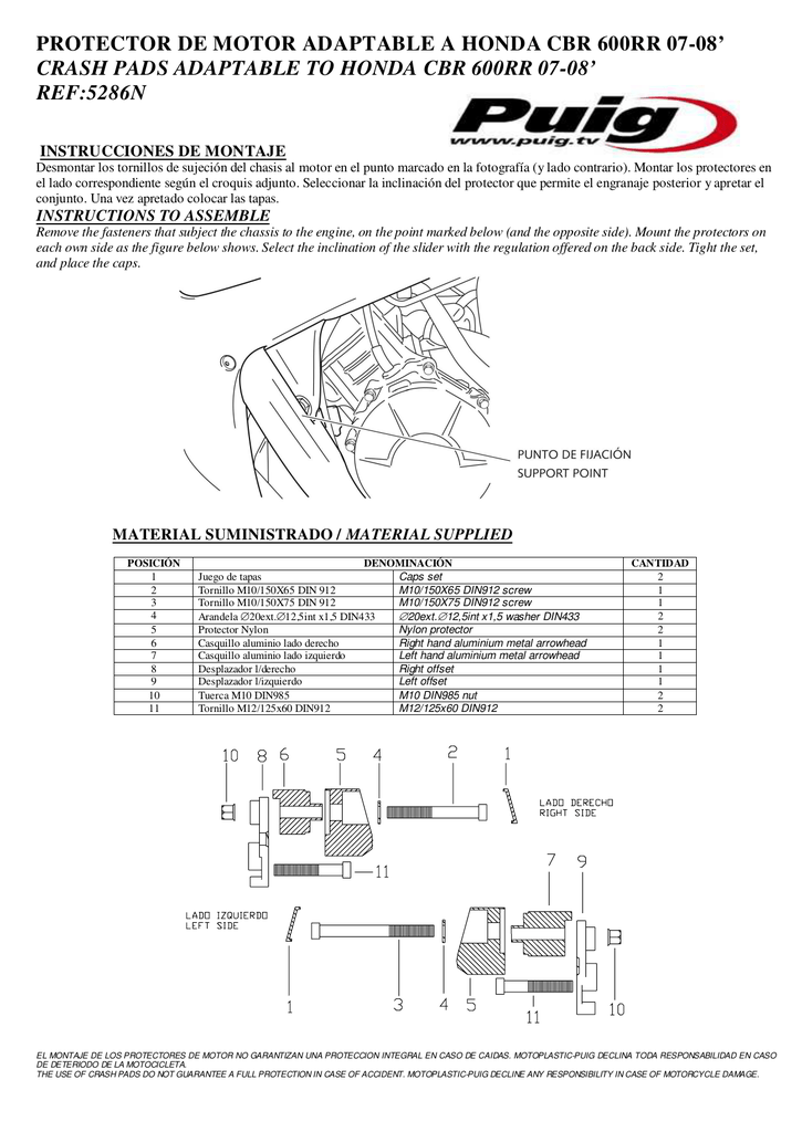 PROTECTOR DE MOTOR ADAPTABLE A HONDA CBR 600RR 07-08’ CRASH PADS ADAPTABLE TO HONDA CBR 600RR 07-08’ REF:5286N INSTRUCCIONES DE MONTAJE Desmontar los tornillos de sujeción del chasis al motor en el punto marcado en la fotografía (y lado contrario). Montar los protectores en el lado correspondiente según el croquis adjunto. Seleccionar la inclinación del protector que permite el engranaje posterior y apretar el conjunto. Una vez apretado colocar las tapas. INSTRUCTIONS TO ASSEMBLE Remove the fasteners that subject the chassis to the engine, on the point marked below (and the opposite side). Mount the protectors on each own side as the figure below shows. Select the inclination of the slider with the regulation offered on the back side. Tight the set, and place the caps. MATERIAL SUMINISTRADO / MATERIAL SUPPLIED POSICIÓN 1 2 3 4 5 6 7 8 9 10 11 DENOMINACIÓN Juego de tapas Caps set Tornillo M10/150X65 DIN 912 M10/150X65 DIN912 screw Tornillo M10/150X75 DIN 912 M10/150X75 DIN912 screw Arandela 20ext. 12,5int x1,5 DIN433 20ext. 12,5int x1,5 washer DIN433 Protector Nylon Nylon protector Casquillo aluminio lado derecho Right hand aluminium metal arrowhead Casquillo aluminio lado izquierdo Left hand aluminium metal arrowhead Desplazador l/derecho Right offset Desplazador l/izquierdo Left offset Tuerca M10 DIN985 M10 DIN985 nut Tornillo M12/125x60 DIN912 M12/125x60 DIN912 CANTIDAD 2 1 1 2 2 1 1 1 1 2 2 EL MONTAJE DE LOS PROTECTORES DE MOTOR NO GARANTIZAN UNA PROTECCION INTEGRAL EN CASO DE CAIDAS. MOTOPLASTIC-PUIG DECLINA TODA RESPONSABILIDAD EN CASO DE DETERIODO DE LA MOTOCICLETA. THE USE OF CRASH PADS DO NOT GUARANTEE A FULL PROTECTION IN CASE OF ACCIDENT. MOTOPLASTIC-PUIG DECLINE ANY RESPONSIBILITY IN CASE OF MOTORCYCLE DAMAGE.