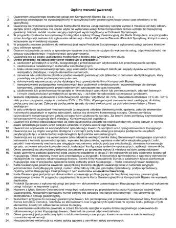 Ogólne warunki gwarancji 1. 2. 3. 4. 5. 6. 7. 8. 9. 10. 11. 12. 13. 14. 15. 16. 17. 18. 19. 20. 21. 22. 23. 24. Gwarantem zakupionego towaru lub usługi jest Komputronik Biznes Sp. z o.o. Gwarancja obowiązuje na wyszczególniony w specyfikacji karty gwarancyjnej towar przez czas określony w tej specyfikacji. Gwarancja na wykonane przez Serwis Komputronik Biznes usługi naprawy sprzętu wynosi 3 miesiące od daty odbioru sprzętu przez użytkownika. Na części użyte do wykonania usługi firma Komputronik Biznes udziela 12 miesięcznej gwarancji. Nazwa, model i numer seryjny części jest wyszczególniony w Protokole Sprzętowym. W przypadku zestawów komputerowych integralną częścią Umowy Gwarancyjnej jest Karta Komputera, a w przypadku zmian konfiguracji zestawu lub zgłaszania reklamacji – Karta Wykonania Zlecenia /Protokół Sprzętowy, których numery wpisywane są w ewidencji napraw. W przypadku napraw podstawą do reklamacji jest kopia Protokołu Sprzętowego z wykonanej usługi wydana klientowi przy odbiorze sprzętu. Gwarant odpowiada za wady w sprzedanym towarze oraz towarze użytym do wykonania usług, odpowiedzialność nie dotyczy sprzedawanego i instalowanego oprogramowania. Gwarancją nie są objęte uszkodzenia mechaniczne towaru oraz wywołane nimi skutki. Utrata gwarancji na zakupiony towar następuje w przypadku: a. uszkodzeń powstałych w wyniku niezgodnego z przeznaczeniem użytkowania lub przechowywania sprzętu, b. zastosowania niewłaściwych materiałów eksploatacyjnych, c. braku okresowej konserwacji sprzętu, jego elementów mechanicznych takich jak: napędy dysków wymiennych, wentylatory chłodzące, i innych elementów ruchomych, d. zerwania lub uszkodzenia plomb w postaci nalepek gwarancyjnych (stikerów) z numerem identyfikacyjnym, który posiadają wszystkie podzespoły komputerowe, e. dokonywania napraw przez osoby działające bez upoważnienia firmy Komputronik Biznes, f. transportowania podzespołów komputerowych bez opakowań antystatycznych i odpowiedniego dla danego komponentu zabezpieczenia przed nadmiernymi wstrząsami na czas transportu, g. użytkowania lub przechowywania sprzętu w niewłaściwych warunkach lub pomieszczeniach, zdarzeń losowych i innych okolicznościach powstałych po sprzedaży – za które nie odpowiada sprzedawca i producent, Warunki optymalne użytkowania i przechowywania sprzętu: wilgotność 30-70%, temperatura otoczenia +5C do +35C, niski poziom zapylenia, napięcie zasilania 230V 7% 50Hz. Wymagane jest zerowanie sieci zasilającej, do której podłączany jest sprzęt. Zaleca się podłączenie sprzętu do sieci elektrycznej za pośrednictwem listwy z filtrem zasilającym W celu uniknięcia uszkodzeń mechanicznych (przegrzania układów elektronicznych, spalenia, zatarcia elementów ruchomych) powstałych w wyniku zabrudzeń, zaleca się okresową konserwację sprzętu. Okresy pomiędzy czynnościami konserwacyjnymi zależą od warunków użytkowania sprzętu. Za średni okres pomiędzy czynnościami konserwacyjnymi przyjmuje się 6 miesięcy. Konserwacja jest odpłatana. Gwarant nie ponosi odpowiedzialności za dane użytkownika zawarte na nośnikach danych, utratę danych w wyniku awarii sprzedanego towaru oraz korzyści utracone w wyniku awarii tego towaru. Gwarant nie odpowiada za kompatybilność sprzedanego towaru ze sprzętem oraz oprogramowaniem Kupującego. Gwarancją nie są objęte wszystkie dostępne z zewnątrz porty komunikacyjne (miejsca podłączania urządzeń peryferyjnych itp.), a także bufory wejścia/wyjścia tych portów komunikacyjnych. Gwarancją nie są objęte i są wykonywane tylko odpłatnie według Cennika Usług Serwisowych następujące czynności: testowanie i kontrola sprawności sprzętu, wymiana bezpieczników, wymiana materiałów eksploatacyjnych ( rolki, zębatki i inne elementy mechaniczne ulegające naturalnemu zużyciu podczas eksploatacji), okresowa konserwacja sprzętu, usuwanie wirusów komputerowych, instalacja i konfiguracja systemów operacyjnych, aplikacji i sterowników. Okres gwarancji na akumulatory (również dostarczone ze sprzętem) wynosi 3 miesiące od daty zakupu/dostawy. Wady ujawnione podczas gwarancji będą usuwane bezpłatnie w ciągu 21 dni roboczych od daty odebrania towaru od Kupującego. Okres naprawy może ulec przedłużeniu w przypadku konieczności sprowadzenia z zagranicy elementów niezbędnych do naprawy reklamowanego towaru. Serwis firmy Komputronik Biznes o zaistniałym fakcie poinformuje Kupującego oraz w przypadku zgłoszenia takiej potrzeby przez Kupującego – może dostarczyć towar zastępczy. Karta Gwarancyjna powinna zawierać: specyfikację towarów objętych Gwarancją wraz z numerem seryjnym jednoznacznie identyfikującym sprzęt, numer i datę faktury zakupu, pieczątkę Sprzedawcy, podpis sprzedawcy, czytelny podpis Kupującego. Brak jednego z tych elementów unieważnia Gwarancję. Karta Gwarancyjna jest jedynym dokumentem uprawniającym Kupującego do bezpłatnej naprawy gwarancyjnej zakupionego towaru. W przypadku zagubienia/zniszczenia Karty Gwarancyjnej firma Komputronik Biznes nie wystawia duplikatów. Protokół Sprzętowy z wykonanej usługi jest jedynym dokumentem uprawniającym Kupującego do reklamacji wykonanej usługi i użytych w naprawie części. Naprawy z tytułu Umowy Gwarancyjnej mogą być realizowane po przedstawieniu przez Kupującego ważnej Karty Gwarancyjnej. Nieczytelny/zamazany numer seryjny (na sprzęcie i na karcie gwarancyjnej) - nie uprawnia do skorzystania z obsługi gwarancyjnej. Warunkiem przyjęcia do naprawy gwarancyjnej towaru lub podzespołów jest przekazanie Serwisowi firmy Komputronik Biznes kompletu instrukcji, nośników ze sterownikami oraz oryginalnych opakowań. W wyniku braku jednego z tych elementów, koszty ich odtworzenia ponosi Kupujący. Za ewentualne uszkodzenia powstałe w czasie transportu sprzętu w wyniku braku oryginalnego opakowania do reklamowanego przez K