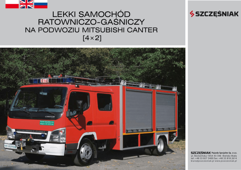 LEKKI SAMOCHÓD RATOWNICZO-GAćNICZY NA PODWOZIU MITSUBISHI CANTER [4×2] Pojazdy Specjalne Sp. z o.o. ul. Bestwińska 105A 43-346 Bielsko-Biała tel: +48 33 827 3400 fax: +48 33 818 2614 b i u r o @ p s s z c z e s n i a k . p l w w w. p s s z c z e s n i a k . p l LEKKI SAMOCHÓD RATOWNICZO-GAŚNICZY NA PODWOZIU MITSUBISHI CANTER [4x2] LIGHT CLASS FIRE RESCUE VEHICLE ON MITSUBISHI CANTER [4x2] Chassis Podwozie Model: DMC: Napęd: Silnik: Załoga: ЛЕГКИЙ СПАСАТЕЛЬНЫЙ АВТОМОБИЛЬ ПОЖАРНЫЙ НА БАЗОВОМ ШАССИ MITSUBISHI CANTER [4x2] Mitsubishi Canter 7 500 kg 4x2 143 KM (107 kW) 1+1+4 Type: GVW: Drive: Engine: Crew: Шасси Mitsubishi Canter 7 500 kg 4x2 143 HP (107 kW) 1+1+4 Тип: РММ: Привод: Двигатель: Кабина: Mitsubishi Canter 7 500 кг 4x2 143 л.с. (107 кВт) 1+1+4 Zabudowa Superstructure Надстройка Typ: Nierdzewna/aluminium Zbiornik: Kompozytowy Zbiornik wody: 1 500 l Zbiornik piany: 150 l Pompa: Jednozakresowa Wydajność 1 060 l/min przy 10 bar pompy: 200 l/min przy 28 bar Dozownik piany: 3–6% Type: Tank: Water tank: Foam tank: Pump: Pump Performance: RTP System: Steel/aluminium Composite 1 500 l 150 l One stage pump 1 060 l/min – 10 bar 200 l/min – 28 bar 3–6% Działko dachowe: Roof Monitor: – Тип: Нержавеющая сталь /алюминий Цистерна: Композитовая Цистерна для воды: 1 500 л Цистерна для пены: 150 л Насос: Одноступенчатый Производитель- 1 060 л/мин - 10 бар ность насоса: 200 л/мин - 28 бар Дозировка пенообразователя: 3–6% Водопенный лафетный ствол на крыше: – Линия высокого давления: 60 м Патрубки 2 x 75 – Linia szybkiego natarcia: Nasady tłoczne: 60 m 2 x 75 Hose reel: Outlets: 60 m 2 x 75 Szczegółowe informacje techniczne można uzyskać kontaktując się z naszym działem handlowym lub wysyłając zapytanie ofertowe. Zachęcamy również do odwiedzenia naszej strony internetowej. Pojazdy Specjalne Sp. z o.o. ul. Bestwińska 105A 43-346 Bielsko-Biała tel: +48 33 827 3400 fax: +48 33 818 2614 [email protected] w w w.psszczesniak.pl Please contact our commercial department or send request form to receive detailed technical information. We also advise you to visit our web page. NIP: 5472099801 REGON:241073251 По всем интересующим вопросам вы можете получить оперативную информацию по ниже указаным адресам. Наши эксперты отдела продаж отвечут на все вопросы. Приглашаем также посетить наш сайт. tel. +48 33 827 34 38 fax +48 33 818 26 14 [email protected] [email protected]