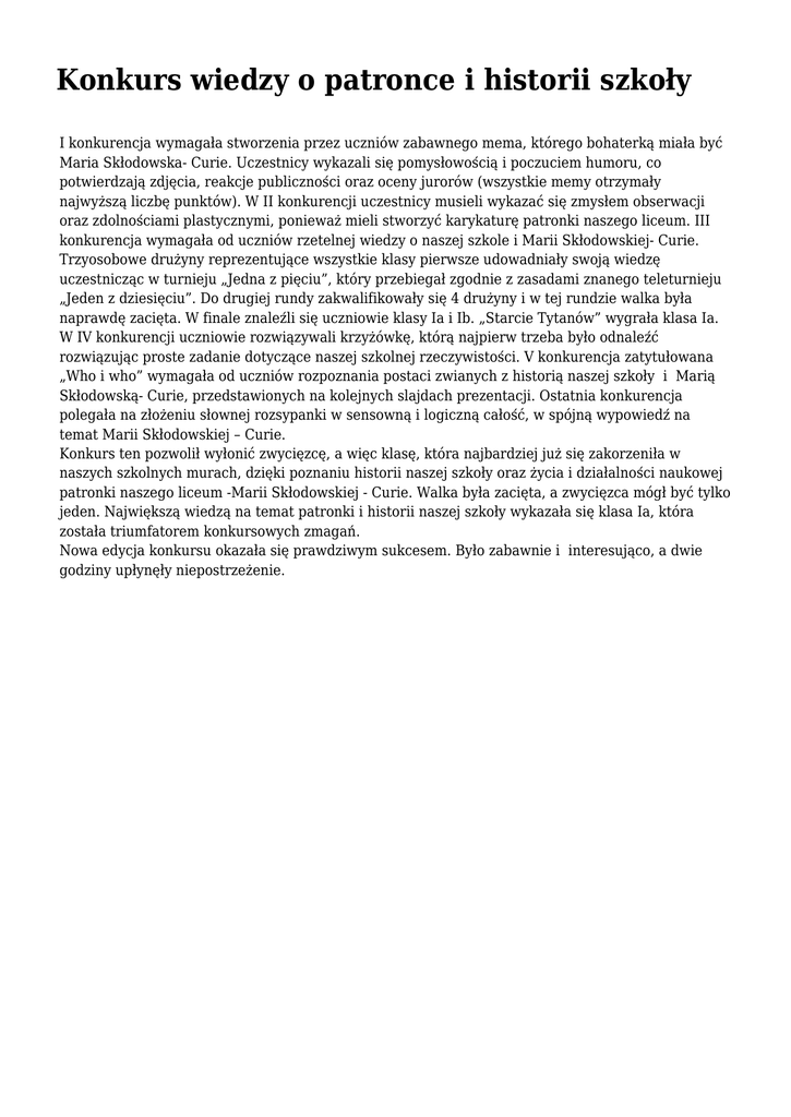 Konkurs wiedzy o patronce i historii szkoły I konkurencja wymagała stworzenia przez uczniów zabawnego mema, którego bohaterką miała być Maria Skłodowska- Curie. Uczestnicy wykazali się pomysłowością i poczuciem humoru, co potwierdzają zdjęcia, reakcje publiczności oraz oceny jurorów (wszystkie memy otrzymały najwyższą liczbę punktów). W II konkurencji uczestnicy musieli wykazać się zmysłem obserwacji oraz zdolnościami plastycznymi, ponieważ mieli stworzyć karykaturę patronki naszego liceum. III konkurencja wymagała od uczniów rzetelnej wiedzy o naszej szkole i Marii Skłodowskiej- Curie. Trzyosobowe drużyny reprezentujące wszystkie klasy pierwsze udowadniały swoją wiedzę uczestnicząc w turnieju „Jedna z pięciu”, który przebiegał zgodnie z zasadami znanego teleturnieju „Jeden z dziesięciu”. Do drugiej rundy zakwalifikowały się 4 drużyny i w tej rundzie walka była naprawdę zacięta. W finale znaleźli się uczniowie klasy Ia i Ib. „Starcie Tytanów” wygrała klasa Ia. W IV konkurencji uczniowie rozwiązywali krzyżówkę, którą najpierw trzeba było odnaleźć rozwiązując proste zadanie dotyczące naszej szkolnej rzeczywistości. V konkurencja zatytułowana „Who i who” wymagała od uczniów rozpoznania postaci zwianych z historią naszej szkoły i Marią Skłodowską- Curie, przedstawionych na kolejnych slajdach prezentacji. Ostatnia konkurencja polegała na złożeniu słownej rozsypanki w sensowną i logiczną całość, w spójną wypowiedź na temat Marii Skłodowskiej – Curie. Konkurs ten pozwolił wyłonić zwycięzcę, a więc klasę, która najbardziej już się zakorzeniła w naszych szkolnych murach, dzięki poznaniu historii naszej szkoły oraz życia i działalności naukowej patronki naszego liceum -Marii Skłodowskiej - Curie. Walka była zacięta, a zwycięzca mógł być tylko jeden. Największą wiedzą na temat patronki i historii naszej szkoły wykazała się klasa Ia, która została triumfatorem konkursowych zmagań. Nowa edycja konkursu okazała się prawdziwym sukcesem. Było zabawnie i interesująco, a dwie godziny upłynęły niepostrzeżenie.