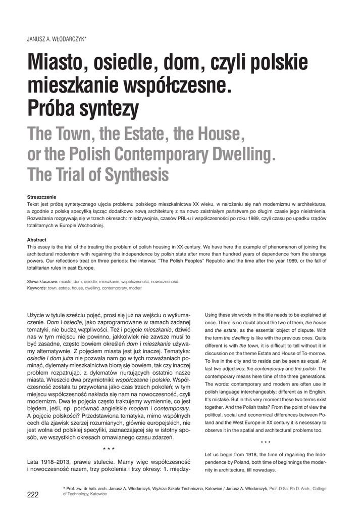 JANUSZ A. WŁODARCZYK* Miasto, osiedle, dom, czyli polskie mieszkanie współczesne. Próba syntezy The Town, the Estate, the House, or the Polish Contemporary Dwelling. The Trial of Synthesis Streszczenie Tekst jest próbą syntetycznego ujęcia problemu polskiego mieszkalnictwa XX wieku, w nałożeniu się nań modernizmu w architekturze, a zgodnie z polską specyfiką łącząc dodatkowo nową architekturę z na nowo zaistniałym państwem po długim czasie jego nieistnienia. Rozważania rozgrywają się w trzech okresach: międzywojnia, czasów PRL-u i współczesności po roku 1989, czyli czasu po upadku rządów totalitarnych w Europie Wschodniej. Abstract This essey is the trial of the treating the problem of polish housing in XX century. We have here the example of phenomenon of joining the architectural modernism with regaining the independence by polish state after more than hundred years of dependence from the strange powers. Our reflections treat on three periods: the interwar, “The Polish Peoples” Republic and the time after the year 1989, or the fall of totalitarian rules in east Europe. Słowa kluczowe: miasto, dom, osiedle, mieszkanie, współczesność, nowoczesność Keywords: town, estate, house, dwelling, contemporary, modert Użycie w tytule sześciu pojęć, prosi się już na wejściu o wytłumaczenie. Dom i osiedle, jako zaprogramowane w ramach zadanej tematyki, nie budzą wątpliwości. Też i pojęcie mieszkanie, dziwić nas w tym miejscu nie powinno, jakkolwiek nie zawsze musi to być zasadne, często bowiem określeń dom i mieszkanie używamy alternatywnie. Z pojęciem miasta jest już inaczej. Tematyka: osiedle i dom jutra nie pozwala nam go w tych rozważaniach pominąć, dylematy mieszkalnictwa biorą się bowiem, tak czy inaczej problem rozpatrując, z dylematów nurtujących ostatnio nasze miasta. Wreszcie dwa przymiotniki: współczesne i polskie. Współczesność została tu przywołana jako czas trzech pokoleń; w tym miejscu współczesność nakłada się nam na nowoczesność, czyli modernizm. Dwa te pojęcia często traktujemy wymiennie, co jest błędem, jeśli, np. porównać angielskie modern i contemporary. A pojęcie polskości? Przedstawiona tematyka, mimo wspólnych cech dla zjawisk szerzej rozumianych, głównie europejskich, nie jest wolna od polskiej specyfiki, zaznaczającej się w istotny sposób, we wszystkich okresach omawianego czasu zdarzeń. *** Lata 1918–2013, prawie stulecie. Mamy więc współczesność i nowoczesność razem, trzy pokolenia i trzy okresy: 1. między- 222 Using these six words in the title needs to be explained at once. There is no doubt about the two of them, the house and the estate, as the essential object of dispute. With the term the dwelling is like with the previous ones. Quite different is with the town, it is difficult to tell without it in discussion on the theme Estate and House of To-morrow. To live in the city and to reside can be seen as equal. At last two adjectives: the contemporary and the polish. The contemporary means here time of the three generations. The words: contemporary and modern are often use in polish language interchangeably; different as in English. It’s mistake. But in this very moment these two terms exist together. And the Polish traits? From the point of view the political, social and economical differences between Poland and the West Europe in XX century it is necessary to observe it in the spatial and architectural problems too. *** Let us begin from 1918, the time of regaining the Independence by Poland, both time of beginnings the modernity in architecture, till nowadays. * Prof. zw. dr hab. arch. Janusz A. Włodarczyk, Wyższa Szkoła Techniczna, Katowice / Janusz A. Włodarczyk, Prof. D Sc. Ph D. Arch., College of Technology, Katowice wojnie w niepodległej Polsce plus czas II wojny, 2. czasy PRL-u i 3. czas po jego upadku. Zacznę po kolei, od międzywojnia i dalej, trzy elementy naszych rozważań: po kolei, ale od tyłu – od domu, zgodnie z zadanym założeniem dywagacji. 1918–1945, międzywojnie i II wojna. W I akcie najnowszej historii bohaterem numer 1, i to bohaterem podwójnym: raz jako dom jednorodzinny, rangi wysokiej: willa, dwa jako dom wielorodzinny. Wzorcem niekwestionowanym był tu Le Corbusier, z kilkoma sławnymi willami jak ta w Poissy i w Garche, z jednej strony, a z drugiej – Jednostka Marsylska. Pomysły, jako synteza corbusierowskich Pięciu Punktów, zaowocowały modernistyczną wersją kamienicy czynszowej, uszlachetnionej, pozbawionej podwórka-studni oraz dziesiąto-wodnych-po-kisielu popłuczyn po antyku, raz na wyższych poziomach architektury – i dwa, trafiającej-pod-strzechy „kostki modernistycznej”, na niższych. Rewolucja, jako modernizm i jako Nowe w mieszkalnictwie się rozpoczęła, w Polsce jej znaczenie, obok merytorycznego, czyli szansy na przestawienie się jakościowe w kategoriach życiowych, było też i symboliczne jako wizytówka odradzającego się państwa. Tak odbierano dokonania Gdyni, Katowic i Górnego Śląska czy nowych osiedli warszawskich, z projektem Warszawy Funkcjonalnej. To rewelacja: w 20 lat stworzono nowe wzorce dla mieszkalnictwa. Niewątpliwe to osiągnięcie polskiego międzywojnia. W dzisiejszym rozumieniu mieszkalnictwa osiedle to wytwór modernizmu. Pomijając próby, jak te z osiedlami przyzakładowymi, fenomen był obcy miastu przemysłowemu i wcześniej. Jego prawdziwe początki to lata 20. –30. wieku XX, kiedy to idea osiągnęła perfekcję. W Polsce przykłady w postaci zrealizowanych jednostek osiedlowych warszawskiego Żoliborza Brukalskich i poślizgowo wczesnych realizacji powojennych Koła Syrkusów czy Rakowca Hansenów stały się wzorcami trudnymi później do przebicia. Wczesne doświadczenia realizacyjne miasta nowego, jak Gdyni, pozwoliły na ocenę, częściową – idei modernistycznych zawartych m.in. później w Karcie Ateńskiej. Układ urbanistyczny zakłada