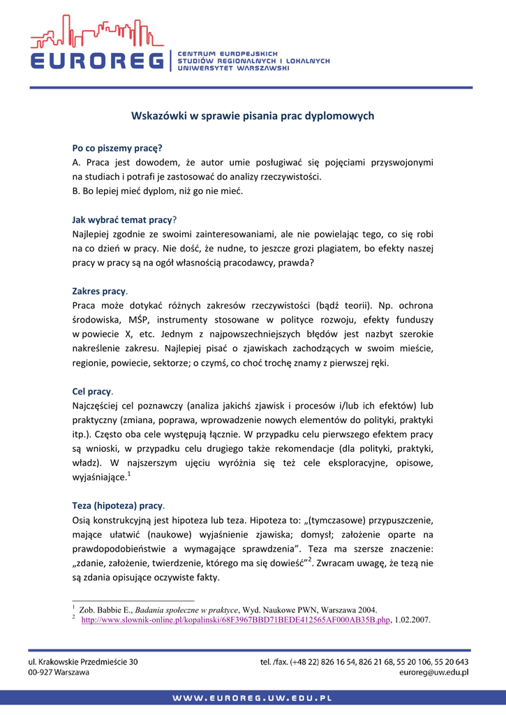 Wskazówki w sprawie pisania prac dyplomowych Po co piszemy pracę? A. Praca jest dowodem, że autor umie posługiwać się pojęciami przyswojonymi na studiach i potrafi je zastosować do analizy rzeczywistości. B. Bo lepiej mieć dyplom, niż go nie mieć. Jak wybrać temat pracy? Najlepiej zgodnie ze swoimi zainteresowaniami, ale nie powielając tego, co się robi na co dzień w pracy. Nie dość, że nudne, to jeszcze grozi plagiatem, bo efekty naszej pracy w pracy są na ogół własnością pracodawcy, prawda? Zakres pracy. Praca może dotykać różnych zakresów rzeczywistości (bądź teorii). Np. ochrona środowiska, MŚP, instrumenty stosowane w polityce rozwoju, efekty funduszy w powiecie X, etc. Jednym z najpowszechniejszych błędów jest nazbyt szerokie nakreślenie zakresu. Najlepiej pisać o zjawiskach zachodzących w swoim mieście, regionie, powiecie, sektorze; o czymś, co choć trochę znamy z pierwszej ręki. Cel pracy. Najczęściej cel poznawczy (analiza jakichś zjawisk i procesów i/lub ich efektów) lub praktyczny (zmiana, poprawa, wprowadzenie nowych elementów do polityki, praktyki itp.). Często oba cele występują łącznie. W przypadku celu pierwszego efektem pracy są wnioski, w przypadku celu drugiego także rekomendacje (dla polityki, praktyki, władz). W najszerszym ujęciu wyróżnia się też cele eksploracyjne, opisowe, wyjaśniające.1 Teza (hipoteza) pracy. Osią konstrukcyjną jest hipoteza lub teza. Hipoteza to: „(tymczasowe) przypuszczenie, mające ułatwić (naukowe) wyjaśnienie zjawiska; domysł; założenie oparte na prawdopodobieństwie a wymagające sprawdzenia”. Teza ma szersze znaczenie: „zdanie, założenie, twierdzenie, którego ma się dowieść”2. Zwracam uwagę, że tezą nie są zdania opisujące oczywiste fakty. 1 2 Zob. Babbie E., Badania społeczne w praktyce, Wyd. Naukowe PWN, Warszawa 2004. http://www.slownik-online.pl/kopalinski/68F3967BBD71BEDE412565AF000AB35B.php, 1.02.2007. Pytania badawcze. Dowód tezy najczęściej przeprowadza się zadając pytania badawcze, tak sformułowane, żeby na podstawie uzyskanych odpowiedzi można było na zakończenie napisać, czy teza się w świetle analizy potwierdziła, czy nie. Przykład relacji teza-pytania badawcze. Teza: Działania władz gminnych nie odpowiadają problemom rozwojowym miasta X. Logicznie wynikające stąd pytania badawcze: 1. Jakie są problemy miasta X? 2. Jakie działania podejmują władze, by je rozwiązać? 3. Czy realizowane działania służą rozwiązaniu problemów? Warto pamiętać, że sukcesem badacza jest nie tylko potwierdzenie hipotezy, ale też jej falsyfikacja (odrzucenie jako nieprawdziwej). Metoda badania (pracy). To przyjęty na potrzeby „pracy nad pracą” sposób jej zorganizowania, zgodny ze standardami współczesnej nauki. Metody: - eksperyment - badania sondażowe - badania terenowe - analiza treści - badania danych zastanych - badania porównawcze - badania ewaluacyjne.3 Powyższy podział nie jest wbrew pozorom ostry. Metoda powinna odpowiadać tematowi i celom badania. Z reguły stosuje się więcej niż jedna metodę. Każda metoda ma z kolei właściwe sobie narzędzia badawcze. Np. badania terenowe mogą być prowadzone z wykorzystaniem ankiety, wywiadu, obserwacji uczestniczącej, obserwacji itp. Struktura pracy. Struktura pracy powinna w idealnym ujęciu obejmować: 1. Kartę tytułową 2. Spis treści 3 Babbie E, Badania…, op.cit., rys. 4.2. 3. Wstęp (krótka forma) lub Wprowadzenie (dłuższa forma) 4. Rozdział teoretyczny (pojęcia kluczowe i kluczowe odniesienia teoretyczne) 5. Rozdział metodologiczny (pytania i problemy badawcze, hipotezy, metody, techniki, narzędzia badawcze, próba badawcza, czas, miejsce badań) 6. Rozdział(y) zawierające wyniki badań 7. Zakończenie 8. Bibliografia (alfabetyczna) 9. Aneks Praca powinna mieć zatem strukturę: T-M-B (teoria-metodologia-wyniki badań). Ostateczny układ zależeć będzie od tematyki pracy i jej celów. Nie zawsze rozdział teoretyczny lub metodologiczny będzie miał formę rozdziału, w pewnych sytuacjach może wystarczyć wspólny rozdział teoretyczno-metodologiczny bądź stosowne podrozdziały w np. wprowadzeniu. Wstęp. Uzasadnia wybór tematu. Wskazuje zakres pracy. Formułuje tezę i pytania badawcze. Wymienia wybraną metodę badania. Wskazuje źródła informacji wykorzystane w pracy. Zwięźle zarysowuje układ rozdziałów. Rozdział teoretyczny i metodologiczny. Czasem – na zasadzie wyjątku - jest zbędny jako regularny rozdział, jeśli ustalenia teoretyczne są ubogie, a metoda badania mało skomplikowana. Wtedy wystarczy np. solidny podrozdział we wstępie. Na ogół jednak się je pisze dokonując przeglądu literatury przedmiotu oraz definiując podstawowe pojęcia (tzw. siatkę pojęciową) na potrzeby pracy. Podobnie można w uzasadnionych przypadkach postąpić z rozdziałem metodologicznym. W żadnym jednak wypadku nie można tych zagadnień pominąć. Rozdział (rozdziały) prezentujące wyniki przeprowadzonej analizy. Z reguły wychodzą od diagnozy, by potem prezentować poszczególne aspekty i fazy analizy. Zakończenie. Krótki rozdział omawiający główne ustalenia pracy, odpowiadający na pytanie, czy teza się potwierdziła (BARDZO WAŻNE), a wreszcie zawierający wnioski (i rekomendacje, jeśli wyniki upoważniają do ich formułowania lub jeśli taki był jeden z celów pracy). Źródła informacji. Są to wyniki badań empirycznych własnych lub obcych, artykuły i opracowania naukowe, dane statystyki urzędowej. Bibliografia. Zalecana formuła podawania źródła w bibliografii to: Królikowski J., 2004, Analizy pola magnetycznego, Wyd. Poważne, Warszawa. W przypadku źródła internetowego: Strategia Rozwoju Szczecina, 2002, http://www.szczecin.pl/Strategia/_pl/01_dokument/sub_1.html , (pobrany dnia 1.02.2007). Nie wystarczy WWW.szczecin.pl. I data jest potrzebna, bo internetowe źródła są ulotne. Jeżeli nie