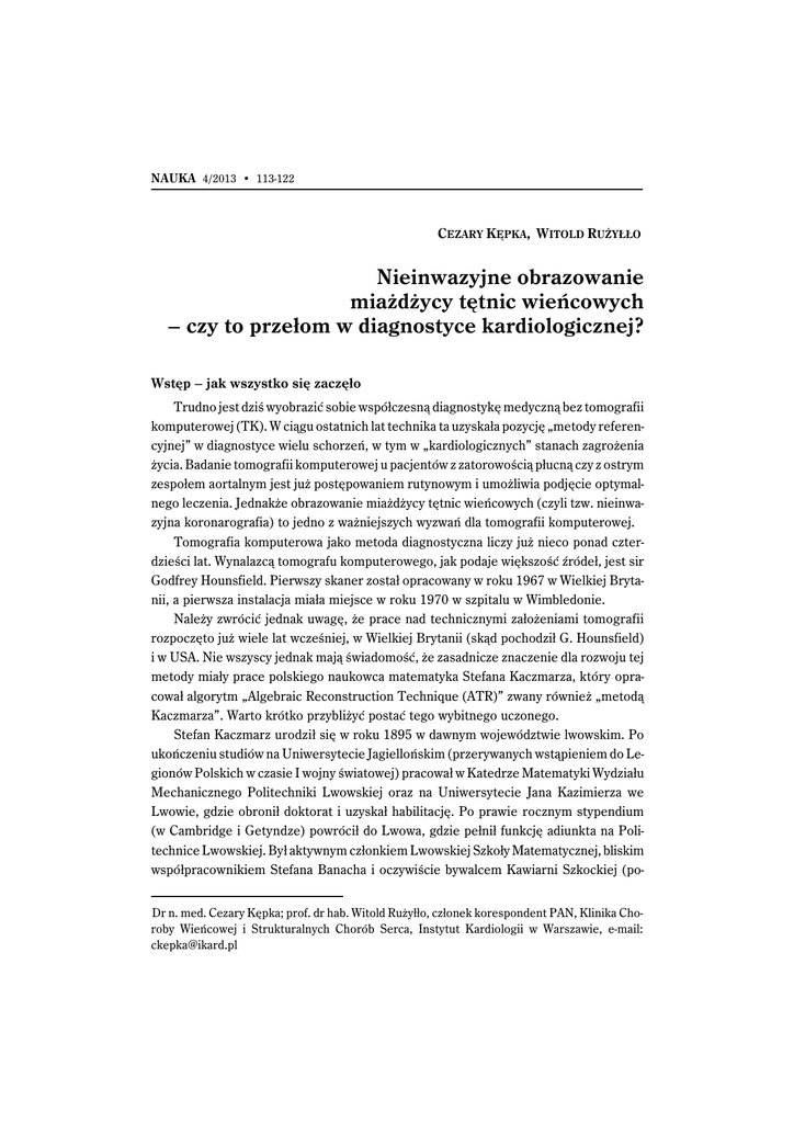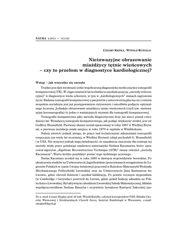 NAUKA 4/2013 • 113-122 CEZARY KĘPKA, WITOLD RUŻYŁŁO Nieinwazyjne obrazowanie miażdżycy tętnic wieńcowych – czy to przełom w diagnostyce kardiologicznej? Wstęp – jak wszystko się zaczęło Trudno jest dziś wyobrazić sobie współczesną diagnostykę medyczną bez tomografii komputerowej (TK). W ciągu ostatnich lat technika ta uzyskała pozycję „metody referencyjnej” w diagnostyce wielu schorzeń, w tym w „kardiologicznych” stanach zagrożenia życia. Badanie tomografii komputerowej u pacjentów z zatorowością płucną czy z ostrym zespołem aortalnym jest już postępowaniem rutynowym i umożliwia podjęcie optymalnego leczenia. Jednakże obrazowanie miażdżycy tętnic wieńcowych (czyli tzw. nieinwazyjna koronarografia) to jedno z ważniejszych wyzwań dla tomografii komputerowej. Tomografia komputerowa jako metoda diagnostyczna liczy już nieco ponad czterdzieści lat. Wynalazcą tomografu komputerowego, jak podaje większość źródeł, jest sir Godfrey Hounsfield. Pierwszy skaner został opracowany w roku 1967 w Wielkiej Brytanii, a pierwsza instalacja miała miejsce w roku 1970 w szpitalu w Wimbledonie. Należy zwrócić jednak uwagę, że prace nad technicznymi założeniami tomografii rozpoczęto już wiele lat wcześniej, w Wielkiej Brytanii (skąd pochodził G. Hounsfield) i w USA. Nie wszyscy jednak mają świadomość, że zasadnicze znaczenie dla rozwoju tej metody miały prace polskiego naukowca matematyka Stefana Kaczmarza, który opracował algorytm „Algebraic Reconstruction Technique (ATR)” zwany również „metodą Kaczmarza”. Warto krótko przybliżyć postać tego wybitnego uczonego. Stefan Kaczmarz urodził się w roku 1895 w dawnym województwie lwowskim. Po ukończeniu studiów na Uniwersytecie Jagiellońskim (przerywanych wstąpieniem do Legionów Polskich w czasie I wojny światowej) pracował w Katedrze Matematyki Wydziału Mechanicznego Politechniki Lwowskiej oraz na Uniwersytecie Jana Kazimierza we Lwowie, gdzie obronił doktorat i uzyskał habilitację. Po prawie rocznym stypendium (w Cambridge i Getyndze) powrócił do Lwowa, gdzie pełnił funkcję adiunkta na Politechnice Lwowskiej. Był aktywnym członkiem Lwowskiej Szkoły Matematycznej, bliskim współpracownikiem Stefana Banacha i oczywiście bywalcem Kawiarni Szkockiej (poDr n. med. Cezary Kępka; prof. dr hab. Witold Rużyłło, członek korespondent PAN, Klinika Choroby Wieńcowej i Strukturalnych Chorób Serca, Instytut Kardiologii w Warszawie, e-mail: [email protected] 114 C. Kępka, W. Rużyłło zostawił problem nr 130 w Księdze). Zaginął w do dziś niewyjaśnionych okolicznościach w roku 1939 w czasie podróży do Warszawy, wezwany rozkazem mobilizacyjnym. Pozostawił po sobie wiele prac i publikacji zauważonych i docenionych przez środowisko naukowe. Pierwsze wprowadzone do użytku klinicznego skanery, produkowane przez firmę EMI z Londynu (stąd nazywano je EMI-scanner), przeznaczone były wyłącznie do badań głowy i wymagały zanurzenia badanej struktury w wodzie, a czas badania wynosił nawet kilkanaście minut. Jednakże już wtedy znaczenie tej techniki zostało docenione przez środowisko naukowe – sir G. Hounsfield otrzymał w roku 1979 Nagrodę Nobla za wynalezienie tomografu komputerowego. Kolejne lata to burzliwy rozwój tej techniki. Przyczynił się do tego m.in. duży sukces komercyjny grupy the Beatles, dzięki któremu firma EMI (wydająca również płyty tej grupy) posiadała środki m.in. na inwestycje w tomografię komputerową. Wyścig technologiczny zaowocował rosnącymi możliwościami technicznymi urządzeń i doprowadził do wprowadzenia kolejnych generacji do praktyki klinicznej. Obecnie dysponujemy skanerami o liczbie „rzędów” sięgającej nawet 320. Jeden z producentów oferuje również urządzenie dwuźródłowe cechujące się bardzo dobrymi parametrami technicznymi. Pomimo faktu, że tomografia komputerowa (TK) to technika radiologiczna, postęp technologiczny w dużej mierze stymulowany jest przez kardiologów. To właśnie badania „kardiologiczne” należą do najbardziej zaawansowanych technicznie, a tym samym wymagają zastosowania nowoczesnych urządzeń. Wciąż rosną również oczekiwania środowiska kardiologicznego. Efektem postępu jest możliwość obrazowania za pomocą TK tętnic wieńcowych – struktur wąskich, krętych, ruchomych i często zmienionych miażdżycowo. Trudno wyobrazić sobie inne struktury anatomiczne trudniejsze do wiarygodnego obrazowania. Wciąż nie jest jednak możliwe „rutynowe” badanie tętnic wieńcowych – badanie takie musi być zawsze wykonywane na sprzęcie zaawansowanym technologicznie, przez bardzo doświadczony zespół. Jednym z kluczowych elementów skutecznego obrazowania jest również właściwy dobór pacjentów – kwalifikacja do badania powinna być prowadzona przed osobę wnikliwie znającą ograniczenia i możliwości metody. Beczka miodu – obecne miejsce tomografii komputerowej w obrazowaniu tętnic wieńcowych Jeszcze przed kilkoma laty tomografia komputerowa tętnic wieńcowych dla wielu kardiologów była techniką słabo poznaną, z obiegową opinią o niewielkiej przydatności klinicznej tej metody. Nierzadko wyniki badania były kwestionowane przez specjalistów, zgodność z koronarografią była niezadowalająca, a pacjent nie odnosił zakładanych korzyści z wykonanego badania. Ograniczenia te wynikały głównie z niewystarczających parametrów technicznych ówczesnych urządzeń oraz z niewielkiego doświadczenia Nieinwazyjne obrazowanie miażdżycy tętnic wieńcowych 115 personelu. Na szczęście to już historia. Dzisiaj znaczenie i możliwości metody są diametralnie różne niż jeszcze kilka lat temu. Tomografia ewoluowała z metody „ładnych obrazków” do przydatnego klinicznie narzędzia diagnostycznego, którym dysponuje współczesna kardiologia. Ba – wydaje się, że w perspektywie kolejnych kilku lat kardi