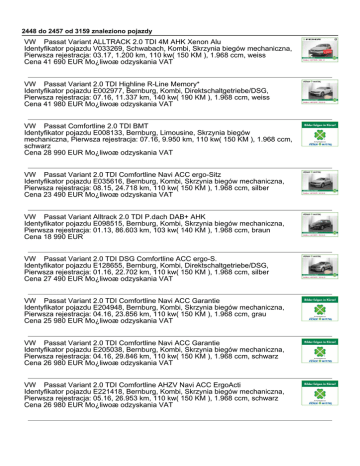 2448 do 2457 od 3159 znaleziono pojazdy VW Passat Variant ALLTRACK 2.0 TDI 4M AHK Xenon Alu Identyfikator pojazdu V033269, Schwabach, Kombi, Skrzynia biegów mechaniczna, Pierwsza rejestracja: 03.17, 1.200 km, 110 kw( 150 KM ), 1.968 ccm, weiss Cena 41 690 EUR Mo¿liwoæ odzyskania VAT VW Passat Variant 2.0 TDI Highline R-Line Memory* Identyfikator pojazdu E002977, Bernburg, Kombi, Direktschaltgetriebe/DSG, Pierwsza rejestracja: 07.16, 11.337 km, 140 kw( 190 KM ), 1.968 ccm, weiss Cena 41 980 EUR Mo¿liwoæ odzyskania VAT VW Passat Comfortline 2.0 TDI BMT Identyfikator pojazdu E008133, Bernburg, Limousine, Skrzynia biegów mechaniczna, Pierwsza rejestracja: 07.16, 9.950 km, 110 kw( 150 KM ), 1.968 ccm, schwarz Cena 28 990 EUR Mo¿liwoæ odzyskania VAT VW Passat Variant 2.0 TDI Comfortline Navi ACC ergo-Sitz Identyfikator pojazdu E035616, Bernburg, Kombi, Skrzynia biegów mechaniczna, Pierwsza rejestracja: 08.15, 24.718 km, 110 kw( 150 KM ), 1.968 ccm, silber Cena 23 490 EUR Mo¿liwoæ odzyskania VAT VW Passat Variant Alltrack 2.0 TDI P.dach DAB+ AHK Identyfikator pojazdu E098515, Bernburg, Kombi, Skrzynia biegów mechaniczna, Pierwsza rejestracja: 01.13, 86.603 km, 103 kw( 140 KM ), 1.968 ccm, braun Cena 18 990 EUR VW Passat Variant 2.0 TDI DSG Comfortline ACC ergo-S. Identyfikator pojazdu E128655, Bernburg, Kombi, Direktschaltgetriebe/DSG, Pierwsza rejestracja: 01.16, 22.702 km, 110 kw( 150 KM ), 1.968 ccm, silber Cena 27 490 EUR Mo¿liwoæ odzyskania VAT VW Passat Variant 2.0 TDI Comfortline Navi ACC Garantie Identyfikator pojazdu E204948, Bernburg, Kombi, Skrzynia biegów mechaniczna, Pierwsza rejestracja: 04.16, 23.856 km, 110 kw( 150 KM ), 1.968 ccm, grau Cena 25 980 EUR Mo¿liwoæ odzyskania VAT VW Passat Variant 2.0 TDI Comfortline Navi ACC Garantie Identyfikator pojazdu E205038, Bernburg, Kombi, Skrzynia biegów mechaniczna, Pierwsza rejestracja: 04.16, 29.846 km, 110 kw( 150 KM ), 1.968 ccm, schwarz Cena 26 980 EUR Mo¿liwoæ odzyskania VAT VW Passat Variant 2.0 TDI Comfortline AHZV Navi ACC ErgoActi Identyfikator pojazdu E221418, Bernburg, Kombi, Skrzynia biegów mechaniczna, Pierwsza rejestracja: 05.16, 26.953 km, 110 kw( 150 KM ), 1.968 ccm, schwarz Cena 26 980 EUR Mo¿liwoæ odzyskania VAT VW Passat Variant 2.0 TDI Trendline ACC PDC Identyfikator pojazdu E414633, Bernburg, Kombi, Skrzynia biegów mechaniczna, Pierwsza rejestracja: 04.15, 15.118 km, 110 kw( 150 KM ), 1.968 ccm, silber Cena 23 980 EUR Mo¿liwoæ odzyskania VAT