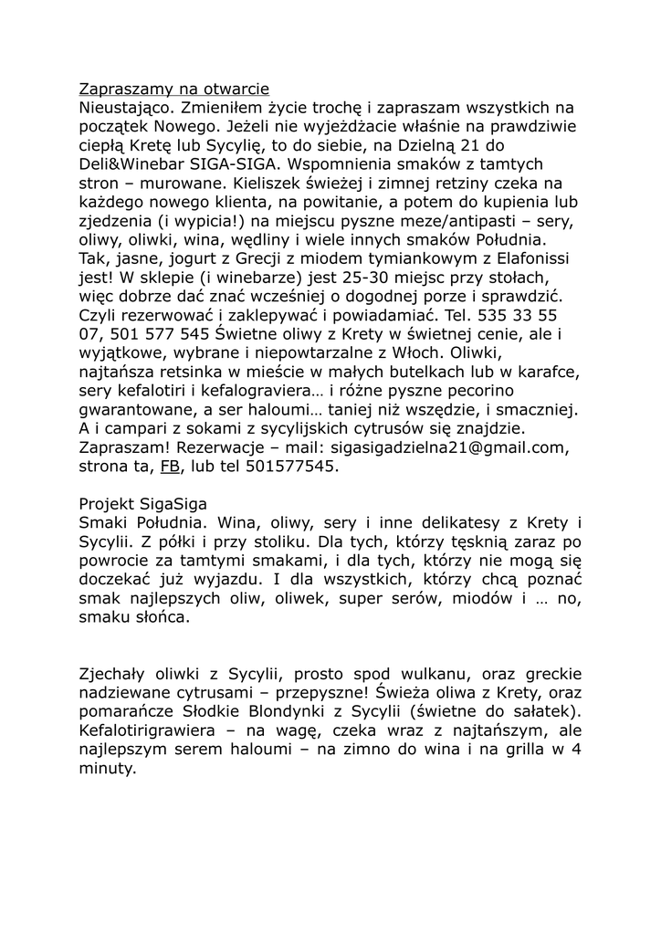 Zapraszamy na otwarcie Nieustająco. Zmieniłem życie trochę i zapraszam wszystkich na początek Nowego. Jeżeli nie wyjeżdżacie właśnie na prawdziwie ciepłą Kretę lub Sycylię, to do siebie, na Dzielną 21 do Deli&Winebar SIGA-SIGA. Wspomnienia smaków z tamtych stron – murowane. Kieliszek świeżej i zimnej retziny czeka na każdego nowego klienta, na powitanie, a potem do kupienia lub zjedzenia (i wypicia!) na miejscu pyszne meze/antipasti – sery, oliwy, oliwki, wina, wędliny i wiele innych smaków Południa. Tak, jasne, jogurt z Grecji z miodem tymiankowym z Elafonissi jest! W sklepie (i winebarze) jest 25-30 miejsc przy stołach, więc dobrze dać znać wcześniej o dogodnej porze i sprawdzić. Czyli rezerwować i zaklepywać i powiadamiać. Tel. 535 33 55 07, 501 577 545 Świetne oliwy z Krety w świetnej cenie, ale i wyjątkowe, wybrane i niepowtarzalne z Włoch. Oliwki, najtańsza retsinka w mieście w małych butelkach lub w karafce, sery kefalotiri i kefalograviera… i różne pyszne pecorino gwarantowane, a ser haloumi… taniej niż wszędzie, i smaczniej. A i campari z sokami z sycylijskich cytrusów się znajdzie. Zapraszam! Rezerwacje – mail: [email protected], strona ta, FB, lub tel 501577545. Projekt SigaSiga Smaki Południa. Wina, oliwy, sery i inne delikatesy z Krety i Sycylii. Z półki i przy stoliku. Dla tych, którzy tęsknią zaraz po powrocie za tamtymi smakami, i dla tych, którzy nie mogą się doczekać już wyjazdu. I dla wszystkich, którzy chcą poznać smak najlepszych oliw, oliwek, super serów, miodów i … no, smaku słońca. Zjechały oliwki z Sycylii, prosto spod wulkanu, oraz greckie nadziewane cytrusami – przepyszne! Świeża oliwa z Krety, oraz pomarańcze Słodkie Blondynki z Sycylii (świetne do sałatek). Kefalotirigrawiera – na wagę, czeka wraz z najtańszym, ale najlepszym serem haloumi – na zimno do wina i na grilla w 4 minuty. Oliwy W SIGA-SIGA pachnie świeżą oliwą, aromatycznymi przyprawami, miodami tymiankowymi i doskonałymi ziołowymi herbatami. To wszystko za sprawą najnowszych dostaw. Mamy już w sprzedaży oliwy pochodzące z najświeższych, zbiorów i są to: Kropla Krety w puszkach 5l, Kropla Krety Mediterranean 0.35%, oraz wiele innych, specjalnie dobranych oliw z Krety. Są także wybitne oliwy z Włoch. Każdy region prezentuje co najlepsze. Degustacja na miejscu. Dla ostrożnych smakoszy lejemy do buteleczek 200 ml. Oliwki Oliwki Kalamata (oliwki drylowane, bez pestki, wielkość Jumbo, czyli 181-200 szt. oliwek w 1 kg) - to najszlachetniejsze z greckich oliwek. Swoją nazwę zawdzięczają rejonowi, z którego pochodzą - okręgu Kalamata na Peloponezie. Dorodne, z grubym miąższem, będą ozdobą każdej wykwintnej kolacji. Zachowują swoje wszystkie walory smakowe dzięki naturalnej solance z dodatkiem oliwy Extra Virgin, soli morskiej i octu winnego. Oczywiście, dzielimy także na wagę – do pojemnika, na małe przyjęcie. Są także wspaniałe nadziewanki – z pomarańczą i cytryną. Miody Tymiankowe czyste i mieszane z innymi ziołami. Pasieki na Krecie są mobilne, czyli pszczelarze przenoszą ule na kolejne wzgórza porośnięte ziołami. W przypadku oferowanego przez miodu z Elafonissi ule były usytuowane w rejonie od Chrissoskalitissa do Elafonissi, gdzie pobliskie wzniesienia porastają kępy tymianku. Ten rejon Krety jest bardzo mało zurbanizowany, nie ma tu żadnego przemysłu, dzięki czemu pszczoły bez przeszkód mogą oddawać się produkcji miodu. Miód tymiankowy z Elafonissi to jeden z najbardziej tradycyjnych produktów z Krety, który łączy współczesną dietę śródziemnomorską z czasami starożytnymi. Ukształtowanie geograficzne Krety, czyli olbrzymie różnice w wysokościach w połączeniu z dziko porastającymi ziołami (jest ich ponad 2000 rodzajów) jak również długie lato z temperaturami sięgającymi 40C, pozwalają na uzyskanie miodów wysokogatunkowych z przeważającą nutą tymianku, pomarańczy czy sosny. Zestaw miodów "Cztery pory roku" zawiera 4 opakowania róznych miodów w dekoracyjnym kartoniku: - 1x miód organiczny, 30g (reprezentuje wiosnę), - 1x sosnowo-tymiankowy, 30g (reprezentuje lato), - 1x dzikie zioła z białtym tymiankiem, 30g (reprezentuje jesień) - 1x miód wrzosowy, 30g (rezprezentuje zimę) Miejsce pochodzienia: Kreta, Grecja Miody są jednorodne, niepodgrzewane. Zbiór: 2015r. Waga: 120g (4x 30g) Data przydatności do spożycia: sierpień 2017 Miody firmy Meligyris to produkty najwyższej jakości o wyrobionej marce na rynkach europejskich i światowych. A wszystko zaczyna się w małej wiosce na południe od Heraklionu malowniczo położonej u podnóży gór Dikti na wschodzie Krety i sięga roku 1920, gdy rozpoczęła się produkcja miodu w rodzinie p. Stefanakisa. Przyprawy… Grecja znana jest z wielu aromatycznych przypraw. Najczęściej używane jest oregano, które wieńczy każdą grecką potrawę, a samo zioło dziko porasta duże obszary Grecji południowej. Kolejnym często stosowanym w kuchni jest tymianek oraz kumin, który przywędrował do kuchni greckiej za czasów manowania Ottomanów. Wraz z nimi pojawił się również cynamon, który Grecy używają głównie do doprawiania mięs i dań jednogarnkowych oraz w deserach. W tym dziale znajdą Państwo zarówno przyprawy jednoskładnikowe (oregano, tymianek, bazylię, rozmaryn, miętę) jak i gotowowe mieszanki przypraw m.in. do: ziemniaków, ryb, jagnięciny, sałatki greckie, sera feta, tzatzyków, moussaki, souvlaków i wiele innych… OCTY Krem balsamiczny (ciemny) - gęsty o słodko-kwaśnym smaku będzie idealnym wykończeniem wielu dań. Idealny do przyprawiania sałatek, dań mięsnych oraz do dekoracji gotowych potraw. Świetnie pasuje do grillowanych mięs, drobiu, serów… Krem balsamiczny figowy (ciemny) - gęsty o słodko-kwaśnym smaku będzie idealnym wykończeniem wielu dań. Dzięki dodaniu ekstraktu figowego zyskuje łagodny owocowy smak