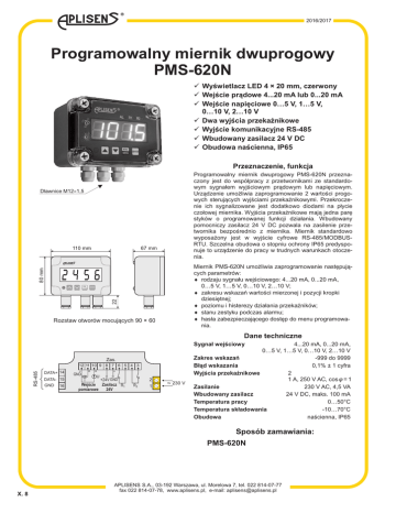 2016/2017 Programowalny miernik dwuprogowy PMS-620N ü Wyœwietlacz LED 4 × 20 mm, czerwony ü Wejœcie pr¹dowe 4...20 mA lub 0...20 mA ü Wejœcie napiêciowe 0…5 V, 1…5 V, 0…10 V, 2…10 V ü Dwa wyjœcia przekaŸnikowe ü Wyjœcie komunikacyjne RS-485 ü Wbudowany zasilacz 24 V DC ü Obudowa naœcienna, IP65 Przeznaczenie, funkcja Programowalny miernik dwuprogowy PMS-620N przeznaczony jest do wspó³pracy z przetwornikami ze standardowym sygna³em wyjœciowym pr¹dowym lub napiêciowym. Urz¹dzenie umo¿liwia zaprogramowanie 2 wartoœci progowych steruj¹cych wyjœciami przekaŸnikowymi. Przekroczenie ich sygnalizowane jest dodatkowo diodami na p³ycie czo³owej miernika. Wyjœcia przekaŸnikowe maj¹ jedna parê styków o programowanej funkcji dzia³ania. Wbudowany pomocniczy zasilacz 24 V DC pozwala na zasilenie przetwornika bezpoœrednio z miernika. Miernik standardowo wyposa¿ony jest w wyjœcie cyfrowe RS-485/MODBUSRTU. Szczelna obudowa o stopniu ochrony IP65 predysponuje to urz¹dzenie do pracy w trudnych warunkach otoczenia. D³awnice M12´ 1,5 110 mm 67 mm 80 mm Miernik PMS-620N umo¿liwia zaprogramowanie nastêpuj¹cych parametrów: ¨ rodzaju sygna³u wejœciowego: 4...20 mA, 0...20 mA, 0…5 V, 1…5 V, 0…10 V, 2…10 V; ¨ zakresu wskazañ wartoœci mierzonej i pozycji kropki dziesiêtnej; ¨ poziomu i histerezy dzia³ania przekaŸników; ¨ stanu zestyku podczas alarmu; ¨ has³a zabezpieczaj¹cego dostêp do menu programowania. ESC ENTER 22 MENU Rozstaw otworów mocuj¹cych 90 × 60 Dane techniczne Sygna³ wejœciowy + DATA+ 14 DATA- 15 GND 16 + RS-485 Zas. 12 11 10 9 8 7 6 5 4 3 GND U +24V GND I Wejœcie Zasilacz R1 R2 pomiarowe 24V 2 1 ~ 230 V 4...20 mA, 0...20 mA, 0…5 V, 1…5 V, 0…10 V, 2…10 V Zakres wskazañ -999 do 9999 B³¹d wskazania 0,1% ± 1 cyfra Wyjœcia przekaŸnikowe 2 1 A, 250 V AC, cos ö = 1 Zasilanie 230 V AC, 4,5 VA Wbudowany zasilacz 24 V DC, maks. 100 mA Temperatura pracy 0…50°C Temperatura sk³adowania -10…70°C Obudowa naœcienna, IP65 Sposób zamawiania: PMS-620N X. 8 APLISENS S.A., 03-192 Warszawa, ul. Morelowa 7, tel. 022 814-07-77 fax 022 814-07-78, www.aplisens.pl, e-mail: [email protected]