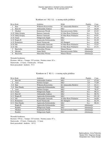 Zawody regionalne w skokach przez przeszkody Kielce - Stadion, 18-19 czerwiec 2011 Konkurs nr 1 Kl. LL - z oceną stylu jeźdźca M-ce Koń 1 Ikar 2 Ben 64 3 Muskat 4-10 Mały Książę 4-10 Mały Książę 4-10 Faust 4-10 Rupia R 4-10 Rotmistrz 4-10 Hit 4-10 Hit 2 Bacówka 4 Mozart 6 Bacówka Jeździec Wiktoria Krzywicka Aleksandra Jonkisz Katarzyna Wosik Bartosz Janiszek Bartosz Janiszek Małgorzata Sajda Agnieszka Kołomańska Karol Niemczuk Aleksandra Janiszek Aleksandra Janiszek Marcelina Wrona Anna Mich Marcelina Wrona Klub KJ Amazonka Borków KKJ Stowarzyszenie Delta SJ Mar-Rom Wałsnów SJ Mar-Rom Wałsnów KKJ KKJ KS Stangret SJ Mar-Rom Wałsnów SJ Mar-Rom Wałsnów Manor House Stowarzyszenie Delta Manor House Punkty 3,0 3,5 4,0 b.o. b.o. b.o. b.o. b.o. b.o. b.o. eliminacja eliminacja eliminacja Czas 59,34 66,69 63,83 70,26 65,01 87,19 82,20 65,66 57,67 67,51 Punkty 2,5 3,0 3,5 3,5 4,0 b.o. b.o. b.o. b.o. b.o. b.o. eliminacja eliminacja eliminacja eliminacja Czas 67,64 77,69 63,11 75,62 78,47 88,12 80,76 101,34 64,09 83,79 80,16 Warunki konkursu: Dystans: 440 m. ; Tempo: 325 m/min ; Norma czasu: 82 s. Startowało: 13 koni ; Ukończyło: 10 koni Ilość przeszkód / skoków: 9/11 Konkurs nr 2 Kl. L - z oceną stylu jeźdźca M-ce Koń 1 Ben 64 2 Aser 3-4 Ikar 3-4 Don Dandy 5 Aser 6-11 Faust 6-11 Ben 64 6-11 Rupia R 6-11 Hit 6-11 Rotmistrz 6-11 Don Dandy Rupia R Rambo Muskat Rambo Jeździec Aleksandra Jonkisz Herbert Szrajer Wiktoria Krzywicka Agnieszka Kołomańska Herbert Szrajer Małgorzata Sajda Aleksandra Jonkisz Agnieszka Kołomańska Aleksandra Janiszek Karol Niemczuk Agnieszka Kołomańska Agnieszka Kołomańska Małgorzata Sajda Katarzyna Wosik Małgorzata Sajda Klub KKJ KKJ KJ Amazonka Borków KKJ KKJ KKJ KKJ KKJ SJ Mar-Rom Wałsnów KS Stangret KKJ KKJ KKJ Stowarzyszenie Delta KKJ Warunki konkursu: Dystans: 470 m. ; Tempo: 325 m/min ; Norma czasu: 87 s. Startowało: 15 koni ; Ukończyło: 11 koni Ilość przeszkód / skoków: 10/12 Sędzia główny: Anna Poborska Sędzia WZJ: Dagmara Szrajer Gospodarz toru: Oskar Szrajer Zawody regionalne w skokach przez przeszkody Kielce - Stadion, 18-19 czerwiec 2011 Konkurs nr 3 Kl. P - zwykły M-ce Koń 1 Santa Monika 2 Sanna Jeździec Łukasz Kruk Rafał Płatek Klub KKJ KKJ Punkty 0 36 Czas 64,96 88,11 Punkty 4 4 28 Czas 68,74 71,11 71,28 Punkty 12 Czas 74,19 Warunki konkursu: Dystans: 460 m. ; Tempo: 350 m/min ; Norma czasu: 79 s. Startowały: 2 konie ; Ukończyły: 2 konie Ilość przeszkód / skoków: 10/12 Konkurs nr 4 Kl. N - zwykły M-ce Koń 1 Santa Monika 2 Nigata 3 Sanna Jeździec Łukasz Kruk Sylwester Januszewski Rafał Płatek Klub KKJ BKJ Bogusławice KKJ Warunki konkursu: Dystans: 460 m. ; Tempo: 350 m/min ; Norma czasu: 79 s. Startowały: 3 konie ; Ukończyły: 3 konie Ilość przeszkód / skoków: 10/12 Konkurs nr 5 Kl. N1 - zwykły M-ce Koń 1 Nigata Jeździec Sylwester Januszewski Klub BKJ Bogusławice Warunki konkursu: Dystans: 460 m. ; Tempo: 350 m/min ; Norma czasu: 79 s. Startował: 1 koń ; Ukończył: 1 koń Ilość przeszkód / skoków: 10/12 Sędzia główny: Anna Poborska Sędzia WZJ: Dagmara Szrajer Gospodarz toru: Oskar Szrajer Zawody regionalne w skokach przez przeszkody Kielce - Stadion, 18-19 czerwiec 2011 Konkurs nr 6 Kl. LL - z oceną stylu jeźdźca M-ce Koń 1 Mały Książę 2 Sedan E 3-9 Tornado 3-9 Maślak 3-9 Mały Książę 3-9 Sedan E 3-9 Rotmistrz 3-9 Tiffany 3-9 Tiffany Tornado Faust Jeździec Bartosz Janiszek Patrycja Widłak Małgorzata Jóźwicka Sylwia Saletra Bartosz Janiszek Patrycja Widłak Karol Niemczuk Małgorzata Jóźwicka Małgorzata Jóźwicka Małgorzata Jóźwicka Małgorzata Sajda Klub SJ Mar-Rom Wałsnów KJ Amazonka Borków bpk KJ Amazonka Borków SJ Mar-Rom Wałsnów KJ Amazonka Borków KS Stangret bpk bpk bpk KKJ Punkty Czas 4,0 69,86 5,0 67,65 b.o. 98,46 b.o. 86,54 b.o. 71,36 b.o. 80,95 b.o. 75,84 b.o. 91,06 b.o. 72,47 eliminacja eliminacja Warunki konkursu: Dystans: 480 m. ; Tempo: 325 m/min ; Norma czasu: 89 s. Startowało: 11 koni ; Ukończyło: 9 koni Ilość przeszkód / skoków: 10 / 12 Konkurs nr 7 Kl. L - z oceną stylu jeźdźca M-ce Koń 1 Ben 64 2 Ikar 3-4 Faust 3-4 Rotmistrz 5 Aser 6-11 Tiffany 6-11 Sedan E 6-11 Aser 6-11 Hit 6-11 Tornado 6-11 Ben 64 Faust Rambo Rambo Jeździec Aleksandra Jonkisz Wiktoria Krzywicka Małgorzata Sajda Karol Niemczuk Herbert Szrajer Małgorzata Jóźwicka Patrycja Widłąk Herbert Szrajer Aleksandra Janiszek Małgorzata Jóźwicka Aleksandra Jonkisz Małgorzata Sajda Małgorzata Sajda Małgorzata Sajda Klub KKJ KJ Amazonka Borków KKJ KS Stangret KKJ bpk KJ Amazonka Borków KKJ SJ Mar-Rom Wałsnów bpk KKJ KKJ KKJ KKJ Punkty Czas 2,0 76,55 2,5 73,54 3,5 76,48 3,5 76,28 4,0 82,81 b.o. 72,84 b.o. 80,87 b.o. 107,87 b.o. 89,13 b.o. 77,84 b.o. 92,15 eliminacja eliminacja eliminacja Warunki konkursu: Dystans: 480 m. ; Tempo: 325 m/min ; Norma czasu: 89 s. Startowało: 14 koni ; Ukończyło: 11 koni Ilość przeszkód / skoków: 10 / 12 Sędzia główny: Anna Poborska Sędzia WZJ: Dagmara Szrajer Gospodarz toru: Oskar Szrajer Zawody regionalne w skokach przez przeszkody Kielce - Stadion, 18-19 czerwiec 2011 Konkurs nr 8 Kl. L1 - z oceną stylu jeźdźca licencyjny M-ce Koń 1-2 Ben 64 1-2 Don Dandy 3 Rupia R 4-5 Hit 4-5 Hit Jeździec Aleksandra Jonkisz Agnieszka Kołomańska Sylwester Januszewski Aleksandra Janiszek Aleksandra Janiszek Klub KKJ KKJ BKJ Bogusłąwice SJ Mar-Rom Wałsnów SJ Mar-Rom Wałsnów Punkty 3,0 3,0 4,0 b.o. b.o. Czas 77,43 83,50 79,86 69,49 94,31 Warunki konkursu: Dystans: 480 m. ; Tempo: 325 m/min ; Norma czasu: 89 s. Startowało: 5 koni ; Ukończyło: 5 koni Ilość przeszkód / skoków: 10 / 12 Konkurs nr 9 Kl. P - dwufazowy M-ce Koń 1 Rupia R 2 Don Dandy 3 Ikar Jeździec Sylwester Januszewski Agnieszka Kołomańska Wiktoria Krzywicka Klub BKJ Bogusłąwice KKJ KJ Amazonka Borków I faza II faza Punkty Czas Punkty Czas 0 70,84 11 44,01 4 79,15 eliminacja Warunki konkursu: Dystans: 450/200 m. ; Tempo: 3
