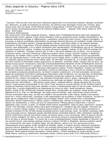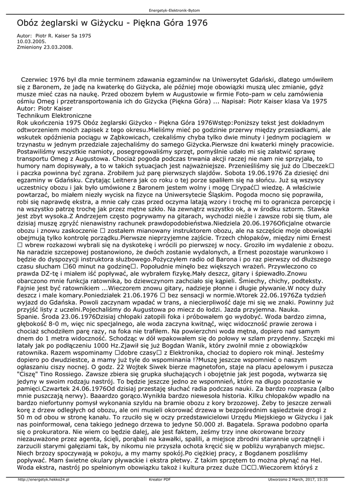 Energetyk-Elektronik-Bytom Obóz żeglarski w Giżycku - Piękna Góra 1976 Autor: Piotr R. Kaiser 5a 1975 10.03.2005. Zmieniony 23.03.2008. Czerwiec 1976 był dla mnie terminem zdawania egzaminów na Uniwersytet Gdański, dlatego umówiłem się z Baronem, że jadę na kwaterkę do Giżycka, ale później moje obowiązki muszą ulec zmianie, gdyż musze mieć czas na naukę. Przed obozem byłem w Augustowie w firmie Foto-pam w celu zamówienia ośmiu Omeg i przetransportowania ich do Giżycka (Piękna Góra) ... Napisał: Piotr Kaiser klasa Va 1975 Autor: Piotr Kaiser Technikum Elektroniczne Rok ukończenia 1975 Obóz żeglarski Giżycko - Piękna Góra 1976Wstęp:Poniższy tekst jest dokładnym odtworzeniem moich zapisek z tego okresu.Mieliśmy mieć po godzinie przerwy między przesiadkami, ale wskutek opóźnienia pociągu w Ząbkowicach, czekaliśmy chyba tylko dwie minuty i jednym pociągiem w trzynastu w jednym przedziale zajechaliśmy do samego Giżycka.Pierwsze dni kwaterki minęły pracowicie. Postawiliśmy wszystkie namioty, posegregowaliśmy sprzęt, pomyślnie udało mi się załatwić sprawę transportu Omeg z Augustowa. Chociaż pogoda podczas trwania akcji raczej nie nam nie sprzyjała, to humory nam dopisywały, a to w takich sytuacjach jest najważniejsze. Przenieśliśmy się już do beczek i paczka powinna być zgrana. Zrobiłem już parę pierwszych slajdów. Sobota 19.06.1976 Za dziesięć dni egzaminy w Gdańsku. Czytając Leitnera jak co roku o tej porze spaliłem się na słońcu. Już są wszyscy uczestnicy obozu i jak było umówione z Baronem jestem wolny i mogę rypać wiedzę. A właściwie powtarzać, bo miałem niezły wycisk na fizyce na Uniwersytecie Śląskim. Pogoda mocno się poprawiła, robi się naprawdę ekstra, a mnie cały czas przed oczyma latają wzory i trochę mi to ogranicza percepcję i na wszystko patrzę trochę jak przez mętne szkło. Na zewnątrz wszystko ok, a w środku sztorm. Stawka jest zbyt wysoka.Z Andrzejem często pogrywamy na gitarach, wychodzi nieźle i zawsze robi się tłum, ale dzisiaj muszę zgryźć nienawistny rachunek prawdopodobieństwa.Niedziela 20.06.1976Oficjalne otwarcie obozu i znowu zaskoczenie zostałem mianowany instruktorem obozu, ale na szczęście moje obowiązki obejmują tylko kontrolę porządku.Pierwsze nieprzyjemne zajście. Trzech chłopaków, między nimi Ernest wbrew rozkazowi wybrali się na dyskotekę i wrócili po pierwszej w nocy. Groziło im wydalenie z obozu. Na naradzie szczepowej postanowiono, że dwóch zostanie wydalonych, a Ernest pozostaje warunkowo i będzie do dyspozycji instruktora służbowego.Pożyczyłem radio od Barona i po raz pierwszy od dłuższego czasu słucham 60 minut na godzinę. Popołudnie minęło bez większych wrażeń. Przywleczono co prawda DZ-tę i miałem iść popływać, ale wybrałem fizykę.Mały deszcz, gitary i śpiewadło.Znowu obarczono mnie funkcja ratownika, bo dziewczynom zachciało się kąpieli. Śmiechy, chichy, podteksty. Fajnie jest być ratownikiem ...Wieczorem znowu gitary, nadzieje płonne i długie pływanie.W nocy duży deszcz i male komary.Poniedziałek 21.06.1976 bez sensacji w normie.Wtorek 22.06.1976Za tydzień wyjazd do Gdańska. Powoli zaczynam wpadać w trans, a niecierpliwość daje mi się we znaki. Powinny już przyjść listy z uczelni.Pojechaliśmy do Augustowa po miecz do łodzi. Jazda przyjemna. Nauka. Spanie. Środa 23.06.1976Dzisiaj chłopaki zatopili foka i próbowałem go wydobyć. Woda bardzo zimna, głębokość 8-0 m, więc nic specjalnego, ale woda zaczyna kwitnąć, więc widoczność prawie zerowa i chociaż schodziłem parę razy, na foka nie trafiłem. Na powierzchni woda mętna, dopiero nad samym dnem do 1 metra widoczność. Schodząc w dół wpakowałem się do połowy w szlam przydenny. Szczęki mi latały jak po podłączeniu 1000 Hz.Zjawił się już Bogdan Wanik, który zwolnił mnie z obowiązków ratownika. Razem wspominamy dobre czasy z Elektronika, chociaż to dopiero rok minął. Jesteśmy dopiero po dwudziestce, a mamy już tyle do wspominania !?Muszę jeszcze wspomnieć o naszym ogłaszaniu ciszy nocnej. O godz. 22 Wojtek Siwek bierze magnetofon, staje na placu apelowym i puszcza "Ciszę" Tino Rossiego. Zawsze zbiera się grupka słuchających i obojętnie jak jest pogoda, wytwarza się jedyny w swoim rodzaju nastrój. To będzie jeszcze jedno ze wspomnień, które na długo pozostanie w pamięci.Czwartek 24.06.1976Od dzisiaj przestaję słuchać radia podczas nauki. Za bardzo rozprasza (albo mnie puszczają nerwy). Baaardzo gorąco.Wynikła bardzo niewesoła historia. Kilku chłopaków wpadło na bardzo niefortunny pomysł wykonania szyldu na bramie obozu z kory brzozowej. Żeby to jeszcze zerwali korę z drzew odległych od obozu, ale oni musieli okorować drzewa w bezpośrednim sąsiedztwie drogi z 50 m od obou w stronę kanału. To rzuciło się w oczy przedstawicielowi Urzędu Miejskiego w Giżycku i jak nas poinformował, cena takiego jednego drzewa to jedyne 50.000 zł. Bagatela. Sprawa podobno oparła się o prokuratora. Nie wiem co będzie dalej, ale jest faktem, żeśmy trzy inne okorowane brzozy niezauważone przez agenta, ścięli, porąbali na kawałki, spalili, a miejsce zbrodni starannie uprzątnęli i zarzucili starymi gałęziami tak, by nikomu nie przyszła ochota kręcić się w pobliżu wyrąbanych miejsc. Niech brzozy spoczywają w pokoju, a my mamy spokój.Po ciężkiej pracy, z Bogdanem poszliśmy popływać. Mam świetne okulary pływackie i ekstra płetwy. Z takim sprzętem to można płynąć na Hel. Woda ekstra, nastrój po spełnionym obowiązku takoż i kultura przez duże C.Wieczorem któryś z http://energetyk.hekko24.pl Kreator PDF Utworzono 2 March, 2017, 15:35 Energetyk-Elektronik-Bytom zastępów zorganizował Noc Kupały. Było puszczanie wianków, co poniektórzy mocno się angażowali w wyławianiu co poniektórych, z czego wynikło udzielanie pseudo-ślubów przez z
