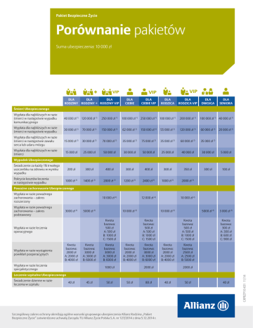 Pakiet Bezpieczne Życie Porównanie pakietów Suma ubezpieczenia: 10 000 zł DLA DLA DLA RODZINY RODZINY + RODZINY VIP DLA CIEBIE DLA CIEBIE VIP DLA RODZICA DLA RODZICA VIP DLA DWOJGA DLA SENIORA Śmierć Ubezpieczonego Wypłata dla najbliższych w razie śmierci w następstwie wypadku komunikacyjnego 40 000 zł 1) 120 000 zł 1) 250 000 zł 1) 100 000 zł 1) 250 000 zł 1) 100 000 zł 1) 200 000 zł 1) 100 000 zł 1) 40 000 zł 1) Wypłata dla najbliższych w razie śmierci w następstwie wypadku 30 000 zł 2) 70 000 zł 2) 150 000 zł 2) 62 000 zł 2) 150 000 zł 2) 55 000 zł 2) 120 000 zł 2) 60 000 zł 2) Wypłata dla najbliższych w razie śmierci w następstwie zawału serca lub udaru mózgu 15 000 zł 2) 30 000 zł 2) 70 000 zł 2) 35 000 zł 2) 75 000 zł 2) 35 000 zł 2) 60 000 zł 2) 35 000 zł 2) Wypłata dla najbliższych w razie śmierci 15 000 zł 25 000 zł 50 000 zł 30 000 zł 50 000 zł 25 000 zł 40 000 zł 30 000 zł 5 000 zł 200 zł 300 zł 400 zł 300 zł 400 zł 300 zł 350 zł 300 zł 100 zł 1000 zł 3) 1400 zł 3) 2000 zł 3) 1200 zł 3) 2400 zł 3) 1000 zł 3) 2000 zł 3) 5000 zł 4) 3 000 zł 4) 20 000 zł 2) Wypadek Ubezpieczonego Świadczenie za każdy 1% trwałego uszczerbku na zdrowiu w wyniku wypadku Pokrycie kosztów leczenia w następstwie wypadku Poważne zachorowanie Ubezpieczonego Wypłata w razie poważnego zachorowania – zakres podstawowy 3000 zł 4) 5000 zł 4) 10 000 zł 4) Kwota bazowa: 500 zł A: 500 zł B: 1000 zł C: 1500 zł Wypłata w razie leczenia operacyjnego Wypłata w razie wystąpienia powikłań pooperacyjnych 12 000 zł 4) 10 000 zł 4) Kwota bazowa: 2000 zł A: 2000 zł B: 4000 zł Kwota bazowa: 3000 zł A: 3000 zł B: 6000 zł Wypłata w razie leczenia specjalistycznego Kwota bazowa: 3000 zł A: 3000 zł B: 6000 zł 10 000 zł 4) 10 000 zł 4) Kwota bazowa: 500 zł A: 500 zł B: 1000 zł C: 1500 zł Kwota bazowa: 2000 zł A: 2000 zł B: 4000 zł 1000 zł Kwota bazowa: 3000 zł A: 3000 zł B: 6000 zł Kwota bazowa: 500 zł A: 500 zł B: 1000 zł C: 1500 zł Kwota bazowa: 2000 zł A: 2000 zł B: 4000 zł 2000 zł Kwota bazowa: 300 zł A: 300 zł B: 600 zł C: 900 zł Kwota bazowa: 2500 zł A: 2500 zł B: 5000 zł 2000 zł Leczenie szpitalne Ubezpieczonego Świadczenie dzienne w razie leczenia w szpitalu 40 zł 45 zł 50 zł 50 zł 80 zł Szczegółowy zakres ochrony określają ogólne warunki grupowego ubezpieczenia Allianz Rodzina „Pakiet Bezpieczne Życie” zatwierdzone uchwałą Zarządu TU Allianz Życie Polska S.A. nr 127/2014 z dnia 5.12.2014 r. 40 zł 50 zł 40 zł GRPBZP10-K01 11/14 Wypłata w razie poważnego zachorowania – zakres rozszerzony DLA DLA DLA RODZINY RODZINY + RODZINY VIP DLA CIEBIE DLA CIEBIE VIP DLA RODZICA DLA RODZICA VIP DLA DWOJGA DLA SENIORA Świadczenie dzienne w razie leczenia w szpitalu w następstwie wypadku 80 zł 5) 90 zł 5) 100 zł 5) 100 zł 5) 160 zł 5) 80 zł 5) 100 zł 5) 90 zł 5) Świadczenie dzienne w razie leczenia w szpitalu – OIOM 100 zł 6) 100 zł 6) 100 zł 6) 150 zł 6) 150 zł 6) 100 zł 6) 100 zł 6) 50 zł 6) Świadczenie dzienne w razie leczenia w następstwie wypadku komunikacyjnego 130 zł 7) 140 zł 7) 150 zł 7) 180 zł 7) 240 zł 7) 130 zł 7) 150 zł 7) 140 zł 7) tak tak tak tak tak tak tak Całodobowa pomoc Świadczenia opiekuńcze dla Ubezpieczonego i jego rodziny tak tak Zdarzenia dotyczące współmałżonka/partnera Wypłata w razie śmierci współmałżonka/partnera 4500 zł 4700 zł 5000 zł 10 000 zł 2000 zł Wypłata w razie śmierci współmałżonka/partnera w następstwie wypadku 10 000 zł 8) 12 000 zł 8) 15 000 zł 8) 20 000 zł 8) 10 000 zł 8) 3000 zł 3200 zł 3500 zł 5000 zł Wypłata z tytułu urodzenia się dziecka 500 zł 700 zł 1 000 zł Wypłata w razie osierocenia dziecka przez Ubezpieczonego 2000 zł 2200 zł 2500 zł Wypłata w razie wystąpienia u współmałżonka/partnera poważnego zachorowania Zdarzenia dotyczące dzieci 2000 zł Renta w razie osierocenia dziecka przez Ubezpieczonego Wypłata w razie śmierci dziecka lub urodzenia się martwego dziecka Wypłata w razie wystąpienia u dziecka poważnego zachorowania 2500 zł 500 zł 9) 2 500 2 700 3 000 zł 8000 zł 9000 zł 10 000 zł Pokrycie kosztów leczenia dziecka w następstwie wypadku Świadczenie za każdy 1% uszczerbku na zdrowiu dziecka 10 000 zł 12 000 zł 1000 zł 3) 2000 zł 3) 70 zł 100 zł 49,00 zł 69,00 zł Zdarzenia dotyczące rodziców Wypłata w razie śmierci rodzica Ubezpieczonego lub rodzica współmałżonka/partnera 1000 zł 1100 zł 1200 zł SKŁADKA MIESIĘCZNA 46,00 zł 58,00 zł 86,00 zł 49,00 zł 78,00 zł 41,00 zł 67,00 zł 1)W ysokość świadczenia podano łącznie z wysokością świadczenia z zakresu podstawowego (zgon Ubezpieczonego) oraz świadczenia z tytułu zgonu Ubezpieczonego w następstwie wypadku, o ile umowa została rozszerzona o wskazaną umowę dodatkową 2)Wysokość świadczenia podano łącznie z wysokością świadczenia z zakresu podstawowego (zgon Ubezpieczonego) 3)Refundowane są wyłącznie faktycznie poniesione koszty – podana wysokość stanowi górną granicę odpowiedzialności Allianz Życie 4)Zakres rozszerzony, tj. 36 jednostek chorobowych obejmuje: - z akres podstawowy (20 jednostek): zawał serca, zabiegi kardiochirurgiczne w celu leczenia przewlekłej choroby niedokrwiennej serca, zabiegi kardiochirurgiczne wymiany zastawki, operacja aorty, udar mózgu, stwardnienie rozsiane, choroba Parkinsona, choroba Creutzfelda-Jakoba, , łagodny guz mózgu, zakażenie wirusem HIV, oparzenia skóry,całkowita utrata wzroku, całkowita utrata słuchu, całkowita utrata mowy, anemia plastyczna wymagająca leczenia, nowotwór, niewydolność nerek, przeszczep, schyłkowa niewydolność wątroby, śpiączka; -d odatkowe jednostki chorobowe: przeszczep tętnicy płucnej, kardiomiopatia, paraliż, postępujące porażenie nadjądrowe, zapalenie mózgu, bakteryjne zapalenie opon mózgowo-rdzeniowych, łagodny guz rdzenia, c