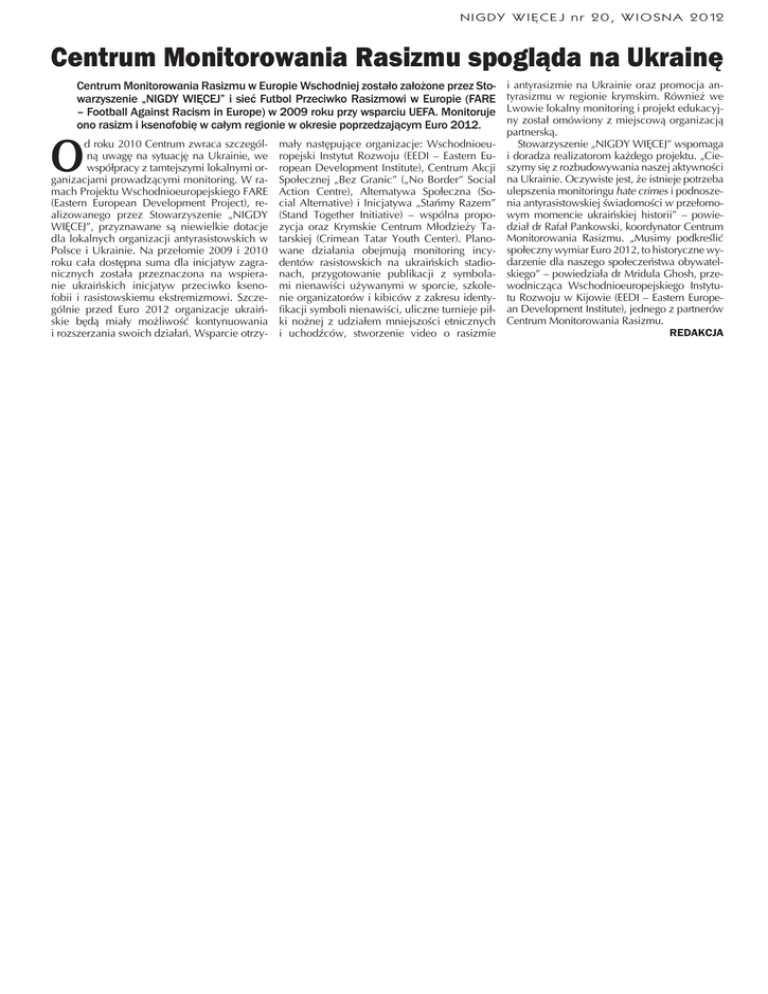 NIGDY WIĘCEJ nr 20, WIOSNA 2012 Centrum Monitorowania Rasizmu spogląda na Ukrainę Centrum Monitorowania Rasizmu w Europie Wschodniej zostało założone przez Stowarzyszenie „NIGDY WIĘCEJ” i sieć Futbol Przeciwko Rasizmowi w Europie (FARE – Football Against Racism in Europe) w 2009 roku przy wsparciu UEFA. Monitoruje ono rasizm i ksenofobię w całym regionie w okresie poprzedzającym Euro 2012. O d roku 2010 Centrum zwraca szczególną uwagę na sytuację na Ukrainie, we współpracy z tamtejszymi lokalnymi organizacjami prowadzącymi monitoring. W ramach Projektu Wschodnioeuropejskiego FARE (Eastern European Development Project), realizowanego przez Stowarzyszenie „NIGDY WIĘCEJ”, przyznawane są niewielkie dotacje dla lokalnych organizacji antyrasistowskich w Polsce i Ukrainie. Na przełomie 2009 i 2010 roku cała dostępna suma dla inicjatyw zagranicznych została przeznaczona na wspieranie ukraińskich inicjatyw przeciwko ksenofobii i rasistowskiemu ekstremizmowi. Szczególnie przed Euro 2012 organizacje ukraińskie będą miały możliwość kontynuowania i rozszerzania swoich działań. Wsparcie otrzy- mały następujące organizacje: Wschodnioeuropejski Instytut Rozwoju (EEDI – Eastern European Development Institute), Centrum Akcji Społecznej „Bez Granic” („No Border” Social Action Centre), Alternatywa Społeczna (Social Alternative) i Inicjatywa „Stańmy Razem” (Stand Together Initiative) – wspólna propozycja oraz Krymskie Centrum Młodzieży Tatarskiej (Crimean Tatar Youth Center). Planowane działania obejmują monitoring incydentów rasistowskich na ukraińskich stadionach, przygotowanie publikacji z symbolami nienawiści używanymi w sporcie, szkolenie organizatorów i kibiców z zakresu identyfikacji symboli nienawiści, uliczne turnieje piłki nożnej z udziałem mniejszości etnicznych i uchodźców, stworzenie video o rasizmie i antyrasizmie na Ukrainie oraz promocja antyrasizmu w regionie krymskim. Również we Lwowie lokalny monitoring i projekt edukacyjny został omówiony z miejscową organizacją partnerską. Stowarzyszenie „NIGDY WIĘCEJ” wspomaga i doradza realizatorom każdego projektu. „Cieszymy się z rozbudowywania naszej aktywności na Ukrainie. Oczywiste jest, że istnieje potrzeba ulepszenia monitoringu hate crimes i podnoszenia antyrasistowskiej świadomości w przełomowym momencie ukraińskiej historii” – powiedział dr Rafał Pankowski, koordynator Centrum Monitorowania Rasizmu. „Musimy podkreślić społeczny wymiar Euro 2012, to historyczne wydarzenie dla naszego społeczeństwa obywatelskiego” – powiedziała dr Mridula Ghosh, przewodnicząca Wschodnioeuropejskiego Instytutu Rozwoju w Kijowie (EEDI – Eastern European Development Institute), jednego z partnerów Centrum Monitorowania Rasizmu. REDAKCJA