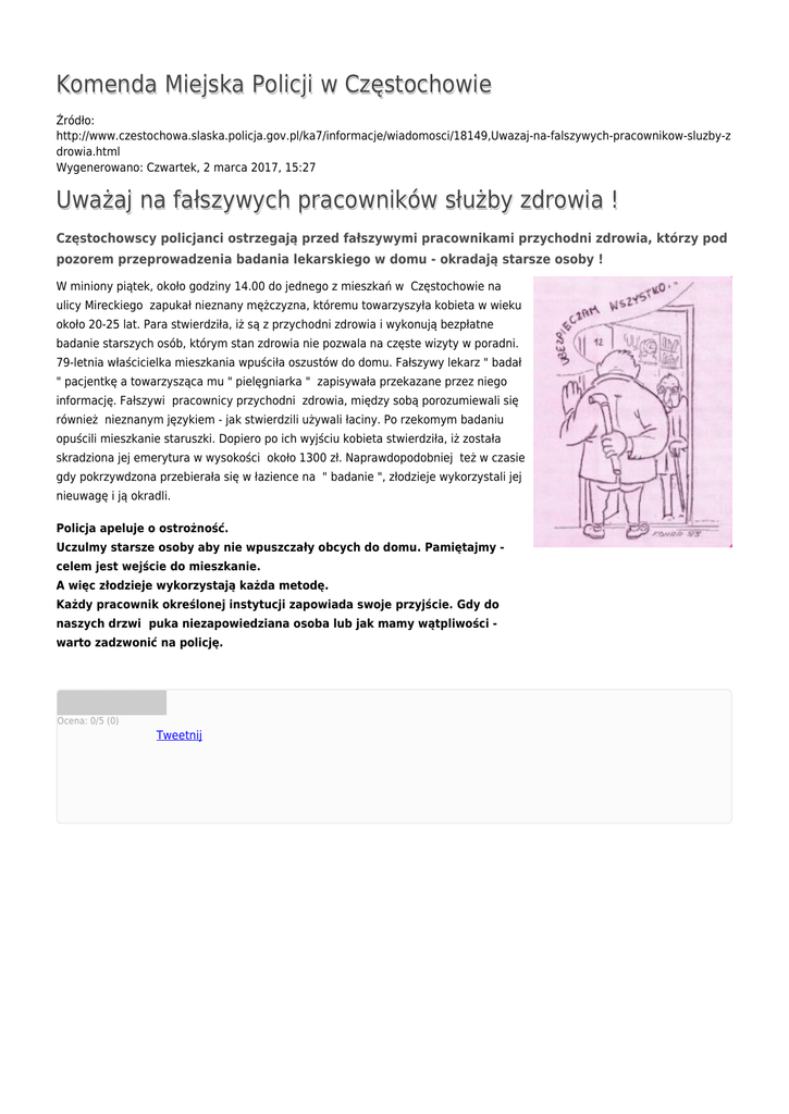 Komenda Miejska Policji w Częstochowie Źródło: http://www.czestochowa.slaska.policja.gov.pl/ka7/informacje/wiadomosci/18149,Uwazaj-na-falszywych-pracownikow-sluzby-z drowia.html Wygenerowano: Czwartek, 2 marca 2017, 15:27 Uważaj na fałszywych pracowników służby zdrowia ! Częstochowscy policjanci ostrzegają przed fałszywymi pracownikami przychodni zdrowia, którzy pod pozorem przeprowadzenia badania lekarskiego w domu - okradają starsze osoby ! W miniony piątek, około godziny 14.00 do jednego z mieszkań w Częstochowie na ulicy Mireckiego zapukał nieznany mężczyzna, któremu towarzyszyła kobieta w wieku około 20-25 lat. Para stwierdziła, iż są z przychodni zdrowia i wykonują bezpłatne badanie starszych osób, którym stan zdrowia nie pozwala na częste wizyty w poradni. 79-letnia właścicielka mieszkania wpuściła oszustów do domu. Fałszywy lekarz " badał " pacjentkę a towarzysząca mu " pielęgniarka " zapisywała przekazane przez niego informację. Fałszywi pracownicy przychodni zdrowia, między sobą porozumiewali się również nieznanym językiem - jak stwierdzili używali łaciny. Po rzekomym badaniu opuścili mieszkanie staruszki. Dopiero po ich wyjściu kobieta stwierdziła, iż została skradziona jej emerytura w wysokości około 1300 zł. Naprawdopodobniej też w czasie gdy pokrzywdzona przebierała się w łazience na " badanie ", złodzieje wykorzystali jej nieuwagę i ją okradli. Policja apeluje o ostrożność. Uczulmy starsze osoby aby nie wpuszczały obcych do domu. Pamiętajmy celem jest wejście do mieszkanie. A więc złodzieje wykorzystają każda metodę. Każdy pracownik określonej instytucji zapowiada swoje przyjście. Gdy do naszych drzwi puka niezapowiedziana osoba lub jak mamy wątpliwości warto zadzwonić na policję. Ocena: 0/5 (0) Tweetnij