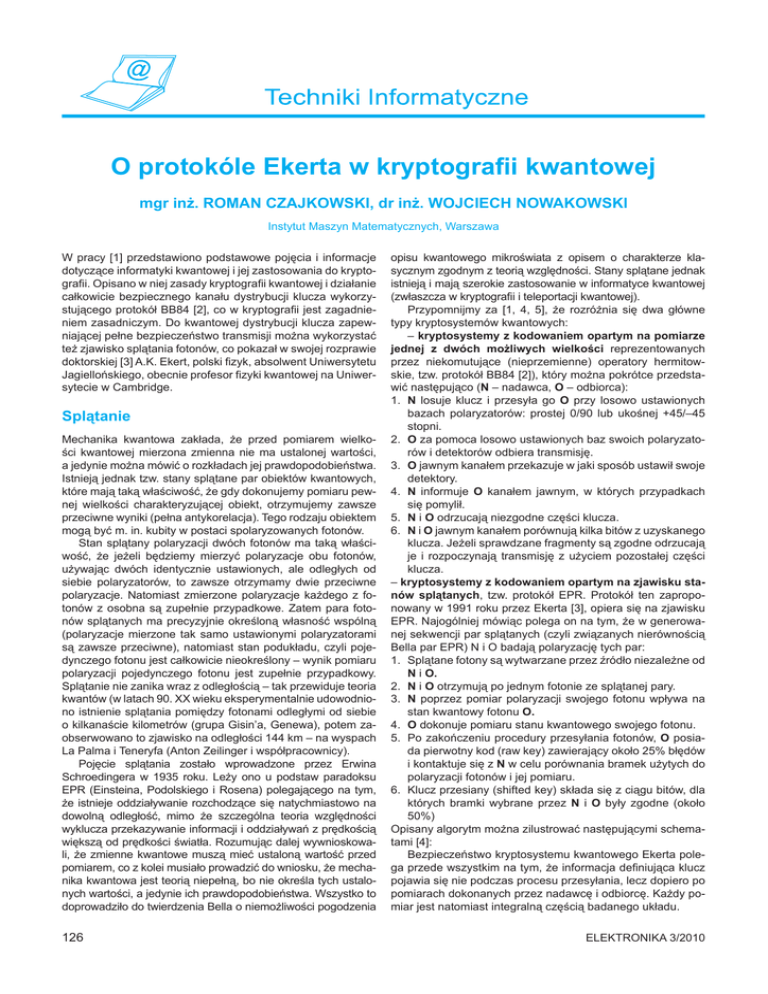O protokóle Ekerta w kryptografii kwantowej mgr inż. ROMAN CZAJKOWSKI, dr inż. WOJCIECH NOWAKOWSKI Instytut Maszyn Matematycznych, Warszawa W pracy [1] przedstawiono podstawowe pojęcia i informacje dotyczące informatyki kwantowej i jej zastosowania do kryptografii. Opisano w niej zasady kryptografii kwantowej i działanie całkowicie bezpiecznego kanału dystrybucji klucza wykorzystującego protokół BB84 [2], co w kryptografii jest zagadnieniem zasadniczym. Do kwantowej dystrybucji klucza zapewniającej pełne bezpieczeństwo transmisji można wykorzystać też zjawisko splątania fotonów, co pokazał w swojej rozprawie doktorskiej [3] A.K. Ekert, polski fizyk, absolwent Uniwersytetu Jagiellońskiego, obecnie profesor fizyki kwantowej na Uniwersytecie w Cambridge. Splątanie Mechanika kwantowa zakłada, że przed pomiarem wielkości kwantowej mierzona zmienna nie ma ustalonej wartości, a jedynie można mówić o rozkładach jej prawdopodobieństwa. Istnieją jednak tzw. stany splątane par obiektów kwantowych, które mają taką właściwość, że gdy dokonujemy pomiaru pewnej wielkości charakteryzującej obiekt, otrzymujemy zawsze przeciwne wyniki (pełna antykorelacja). Tego rodzaju obiektem mogą być m. in. kubity w postaci spolaryzowanych fotonów. Stan splątany polaryzacji dwóch fotonów ma taką właściwość, że jeżeli będziemy mierzyć polaryzacje obu fotonów, używając dwóch identycznie ustawionych, ale odległych od siebie polaryzatorów, to zawsze otrzymamy dwie przeciwne polaryzacje. Natomiast zmierzone polaryzacje każdego z fotonów z osobna są zupełnie przypadkowe. Zatem para fotonów splątanych ma precyzyjnie określoną własność wspólną (polaryzacje mierzone tak samo ustawionymi polaryzatorami są zawsze przeciwne), natomiast stan podukładu, czyli pojedynczego fotonu jest całkowicie nieokreślony – wynik pomiaru polaryzacji pojedynczego fotonu jest zupełnie przypadkowy. Splątanie nie zanika wraz z odległością – tak przewiduje teoria kwantów (w latach 90. XX wieku eksperymentalnie udowodniono istnienie splątania pomiędzy fotonami odległymi od siebie o kilkanaście kilometrów (grupa Gisin’a, Genewa), potem zaobserwowano to zjawisko na odległości 144 km – na wyspach La Palma i Teneryfa (Anton Zeilinger i współpracownicy). Pojęcie splątania zostało wprowadzone przez Erwina Schroedingera w 1935 roku. Leży ono u podstaw paradoksu EPR (Einsteina, Podolskiego i Rosena) polegającego na tym, że istnieje oddziaływanie rozchodzące się natychmiastowo na dowolną odległość, mimo że szczególna teoria względności wyklucza przekazywanie informacji i oddziaływań z prędkością większą od prędkości światła. Rozumując dalej wywnioskowali, że zmienne kwantowe muszą mieć ustaloną wartość przed pomiarem, co z kolei musiało prowadzić do wniosku, że mechanika kwantowa jest teorią niepełną, bo nie określa tych ustalonych wartości, a jedynie ich prawdopodobieństwa. Wszystko to doprowadziło do twierdzenia Bella o niemożliwości pogodzenia 126 opisu kwantowego mikroświata z opisem o charakterze klasycznym zgodnym z teorią względności. Stany splątane jednak istnieją i mają szerokie zastosowanie w informatyce kwantowej (zwłaszcza w kryptografii i teleportacji kwantowej). Przypomnijmy za [1, 4, 5], że rozróżnia się dwa główne typy kryptosystemów kwantowych: – kryptosystemy z kodowaniem opartym na pomiarze jednej z dwóch możliwych wielkości reprezentowanych przez niekomutujące (nieprzemienne) operatory hermitowskie, tzw. protokół BB84 [2]), który można pokrótce przedstawić następująco (N – nadawca, O – odbiorca): 1. N losuje klucz i przesyła go O przy losowo ustawionych bazach polaryzatorów: prostej 0/90 lub ukośnej +45/–45 stopni. 2. O za pomoca losowo ustawionych baz swoich polaryzatorów i detektorów odbiera transmisję. 3. O jawnym kanałem przekazuje w jaki sposób ustawił swoje detektory. 4. N informuje O kanałem jawnym, w których przypadkach się pomylił. 5. N i O odrzucają niezgodne części klucza. 6. N i O jawnym kanałem porównują kilka bitów z uzyskanego klucza. Jeżeli sprawdzane fragmenty są zgodne odrzucają je i rozpoczynają transmisję z użyciem pozostałej części klucza. – kryptosystemy z kodowaniem opartym na zjawisku stanów splątanych, tzw. protokół EPR. Protokół ten zaproponowany w 1991 roku przez Ekerta [3], opiera się na zjawisku EPR. Najogólniej mówiąc polega on na tym, że w generowanej sekwencji par splątanych (czyli związanych nierównością Bella par EPR) N i O badają polaryzację tych par: 1. Splątane fotony są wytwarzane przez źródło niezależne od N i O. 2. N i O otrzymują po jednym fotonie ze splątanej pary. 3. N poprzez pomiar polaryzacji swojego fotonu wpływa na stan kwantowy fotonu O. 4. O dokonuje pomiaru stanu kwantowego swojego fotonu. 5. Po zakończeniu procedury przesyłania fotonów, O posiada pierwotny kod (raw key) zawierający około 25% błędów i kontaktuje się z N w celu porównania bramek użytych do polaryzacji fotonów i jej pomiaru. 6. Klucz przesiany (shifted key) składa się z ciągu bitów, dla których bramki wybrane przez N i O były zgodne (około 50%) Opisany algorytm można zilustrować następującymi schematami [4]: Bezpieczeństwo kryptosystemu kwantowego Ekerta polega przede wszystkim na tym, że informacja definiująca klucz pojawia się nie podczas procesu przesyłania, lecz dopiero po pomiarach dokonanych przez nadawcę i odbiorcę. Każdy pomiar jest natomiast integralną częścią badanego układu. ELEKTRONIKA 3/2010 Rys 1. Zasada transmisji według protokołu Ekerta. Fig. 1. Example of the Ekert protocol Rys. 2. Uzyskany kod. Fig. 2. Received code Literatura [1] [2] Nowakowski W.: O kryptografii kwantowej. Elektronika, nr 2, Warszawa 2010. Bennett C. H., Brassard G.: Quantum Cryptography: Public key distribution and coin tossing. Proceedings of the IEEE Internat