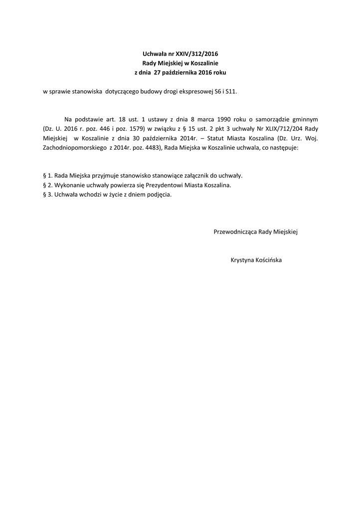 Uchwała nr XXIV/312/2016 Rady Miejskiej w Koszalinie z dnia 27 października 2016 roku w sprawie stanowiska dotyczącego budowy drogi ekspresowej S6 i S11. Na podstawie art. 18 ust. 1 ustawy z dnia 8 marca 1990 roku o samorządzie gminnym (Dz. U. 2016 r. poz. 446 i poz. 1579) w związku z § 15 ust. 2 pkt 3 uchwały Nr XLIX/712/204 Rady Miejskiej w Koszalinie z dnia 30 października 2014r. – Statut Miasta Koszalina (Dz. Urz. Woj. Zachodniopomorskiego z 2014r. poz. 4483), Rada Miejska w Koszalinie uchwala, co następuje: § 1. Rada Miejska przyjmuje stanowisko stanowiące załącznik do uchwały. § 2. Wykonanie uchwały powierza się Prezydentowi Miasta Koszalina. § 3. Uchwała wchodzi w życie z dniem podjęcia. Przewodnicząca Rady Miejskiej Krystyna Kościńska Stanowisko Rady Miejskiej w Koszalinie z dnia 27 października 2016 roku Rada Miejska w Koszalinie wyraża głębokie zaniepokojenie negatywnymi sygnałami dotyczącymi budowy drogi ekspresowej S6 i S11. Apelujemy o nie wycofywanie się i nie odkładanie w czasie realizacji pomorskich odcinków trasy ekspresowej S6, na projektowanie i wykonawstwo których Generalna Dyrekcja Dróg Krajowych i Autostrad ogłosiła przetargi jesienią 2015 r oraz realizację wpisanej w 2015 roku do Krajowego Programu Budowy Dróg, drogi ekspresowej S11. W ogłoszonych w ubiegłym roku we wrześniu i październiku przetargach na realizację odcinków trasy ekspresowej S6 z Koszalina do Słupska, drugiej nitki obwodnicy Słupska, odcinka Słupsk – Lębork, Trasy Kaszubskiej i Obwodnicy Metropolii Trójmiejskiej do dzisiaj procedura nie wykroczyła poza wstępny etap postępowania polegający na weryfikacji potencjału zainteresowanych wykonawców. Interweniujące w maju 2016 r. o przyspieszenie opóźniającej się realizacji inwestycji w województwie pomorskim Walne Zebranie Stowarzyszenia Samorządowego S6, z upoważnienia Ministra Infrastruktury i Budownictwa od Podsekretarza Stanu Pana Jerzego Szmita otrzymało zapewnienie (pismo nr DDP.2.453.3.2016.mz.1 z dn. 30 czerwca 2016 r.), że prace związane z budową ww. odcinków planowanej trasy ekspresowej S6 odbywają się zgodnie z założonymi harmonogramami oraz z poszanowaniem zasad prowadzonego procesu inwestycyjnego. Tymczasem Pan Minister Jerzy Szmit w wywiadzie dla „Głosu Koszalińskiego Dziennika Pomorza” z dnia 18.10.2016 r. stwierdził publicznie, że w sprawie budowy pomorskich odcinków trasy ekspresowej S6 decyzja jeszcze nie zapadła i nie wiadomo kiedy ta kluczowa dla północnej Polski inwestycja miałaby być zrealizowana. Rada Miejska w Koszalinie zwraca się z gorącym apelem do Prezes Rady Ministrów Pani Beaty Szydło o przyjrzenie się powodom opóźniających się rozstrzygnięć przetargów i niezwłoczną realizację zachodniopomorskich i pomorskich odcinków trasy ekspresowej S6, na które od lat czekają mieszkańcy i samorządy Pomorza. Odłożenie w bliżej nieokreśloną przyszłość realizacji trasy ekspresowej S6 w województwie pomorskim będzie oznaczało dalsze pogłębianie różnic w rozwoju kraju i wewnątrz regionu. To zmniejszenie atrakcyjności inwestycyjnej i turystycznej Pomorza, oraz wysokie koszty społeczne związane z częstymi śmiertelnymi wypadkami na drodze krajowej nr 6 i 11, liczne problemy komunikacyjne i środowiskowe. Rezygnacja z pierwotnie planowanych terminów zakończenia przedmiotowej inwestycji byłaby także ogromnym marnotrawstwem środków publicznych, gdyż z czasem wygasną wydane decyzje środowiskowe i zdezaktualizują się posiadane przez GDDKiA koncepcje programowe trasy ekspresowej, na pozyskanie których wydatkowano znaczące środki z budżetu Państwa. Zwracamy się z apelem do Pani Prezes Rady Ministrów, by Rząd Rzeczypospolitej Polskiej nie rezygnował z planowanych pierwotnie terminów oddania do użytku trasy ekspresowej S6 oraz planów budowy drogi S11. Postęp w budowie trasy ekspresowej S6 powinien w równym stopniu dotyczyć województwa pomorskiego jak województwa zachodniopomorskiego, tak aby droga została zrealizowana w możliwie najkrótszym czasie przynosząc korzyści regionowi i krajowi.
