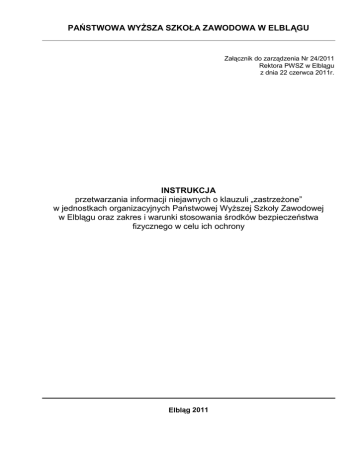 PAŃSTWOWA WYśSZA SZKOŁA ZAWODOWA W ELBLĄGU Załącznik do zarządzenia Nr 24/2011 Rektora PWSZ w Elblągu z dnia 22 czerwca 2011r. INSTRUKCJA przetwarzania informacji niejawnych o klauzuli „zastrzeŜone” w jednostkach organizacyjnych Państwowej WyŜszej Szkoły Zawodowej w Elblągu oraz zakres i warunki stosowania środków bezpieczeństwa fizycznego w celu ich ochrony Elbląg 2011 I. POSTANOWIENIA OGÓLNE 1. Niniejsza instrukcja dotyczy sposobu i trybu przetwarzania informacji niejawnych o klauzuli „zastrzeŜone” w jednostkach organizacyjnych Uczelni. Określa zasady ochrony informacji niejawnych, które wymagają ochrony przed nieuprawnionym ujawnieniem oraz zakres stosowania środków ochrony fizycznej informacji niejawnych. Ujednolica czynności oraz metody pracy administracyjnej związane z organizowaniem ochrony informacji niejawnych, ewidencją i obiegiem dokumentów niejawnych. 2. Zasady i organizację ochrony informacji niejawnych regulują1: 1) ustawa z dnia 5 sierpnia 2010 r. o ochronie informacji niejawnych (Dz. U. z 2010 r. Nr 182, poz. 1228); 2) ustawa z dnia 14 czerwca 1960 r. Kodeks postępowania administracyjnego (Dz. U. z 2000 r. Nr 98, poz. 1071 z późn. zm.); 3) rozporządzenie Rady Ministrów z dnia 1 czerwca 2010 r. w sprawie organizacji i funkcjonowania kancelarii tajnych (Dz. U. z 2010 r. Nr 114, poz. 765); 4) rozporządzenie Prezesa Rady Ministrów z 13 sierpnia 2010 r. w sprawie oznaczania materiałów, umieszczania na nich klauzul tajności, a takŜe zmiany nadanej klauzuli tajności (Dz. U. z 2010 r. Nr 159, poz. 1069); 5) rozporządzenie Prezesa Rady Ministrów z dn. 25 sierpnia 2005 r. w sprawie podstawowych wymagań bezpieczeństwa teleinformatycznego (Dz. U. z 2005 r. Nr 171, poz. 1433); 6) rozporządzenie Prezesa Rady Ministrów z dnia 29 września 2005 r. w sprawie trybu i sposobu przyjmowania, przewoŜenia, wydawania i ochrony materiałów zawierających informacje niejawne (Dz. U. z 2005 r. Nr 200, poz. 1650 z późn. zm.); 7) rozporządzenie Prezesa Rady Ministrów z dnia 25 sierpnia 2005 r. w sprawie szczegółowego trybu przygotowania i prowadzenia przez słuŜby ochrony państwa kontroli w zakresie ochrony informacji niejawnych (Dz. U. z 2005 r. Nr 171, poz. 1430); 8) rozporządzenie Prezesa Rady Ministrów z dnia 28 grudnia 2010 r. w sprawie wzorów zaświadczeń stwierdzających odbycie szkolenia w zakresie ochrony informacji niejawnych oraz sposobu rozliczania kosztów przeprowadzenia szkolenia przez Agencję Bezpieczeństwa Wewnętrznego lub SłuŜbę Kontrwywiadu Wojskowego (Dz. U. z 2010 r. Nr 258, poz. 1751); 9) rozporządzenie Prezesa Rady Ministrów z dnia 28 grudnia 2010 r. w sprawie wzorów poświadczeń bezpieczeństwa (Dz. U. z 2010 r. Nr 258, poz. 1752); 10) rozporządzenie Prezesa Rady Ministrów z dnia 28 grudnia 2010 r. w sprawie przekazywania informacji, udostępniania dokumentów oraz udzielania pomocy słuŜbom i instytucjom uprawnionym do prowadzenia poszerzonych postępowań sprawdzających, kontrolnych postępowań sprawdzających oraz postępowań bezpieczeństwa przemysłowego (Dz. U. z 2010 r. Nr 258, poz. 1750). 1 Zgodnie z art. 189 ustawy z dnia 5 sierpnia 2010 r. o ochronie informacji niejawnych (Dz. U. Nr 182, poz. 1228) dotychczasowe akty wykonawcze wydane na podstawie ustawy z dnia 22 stycznia 1999 r. o ochronie informacji niejawnych (Dz. U. z 2005 r. Nr 196, poz. 1631 z późn. zm.) zachowują moc do dnia wejścia w Ŝycie nowych przepisów wykonawczych, nie dłuŜej jednak niŜ przez okres 12 miesięcy od dnia wejścia w Ŝycie niniejszej ustawy. 3. UŜyte w instrukcji określenia oznaczają: 1) państwowa jednostka organizacyjna – PWSZ w Elblągu (zwaną dalej Uczelnią); 2) jednostka organizacyjna – wyodrębnioną jednostkę organizacyjną określoną w Statucie i Regulaminie organizacyjnym Uczelni (instytut, dział, sekretariat, biuro, kancelaria, samodzielne stanowisko pracy); 3) słuŜba ochrony państwa – Agencję Bezpieczeństwa Wewnętrznego (ABW); 4) rękojmia zachowania tajemnicy – zdolność osoby do spełnienia ustawowych wymogów dla zapewnienia ochrony informacji niejawnych przed ich nieuprawnionym ujawnieniem; 5) informacje niejawne – informacje, stanowiące tajemnice prawnie chronione odpowiednio do nadanej klauzuli tajności, których nieuprawnione ujawnienie spowodowałoby lub mogłoby spowodować szkody dla Rzeczypospolitej Polskiej albo byłoby z punktu widzenia jej interesów niekorzystne; 6) dokument (dokumentacja) – kaŜdą utrwaloną informację niejawną; 7) materiał – dokument lub przedmiot albo dowolną ich część, chronioną jako informację niejawną; 8) przetwarzanie informacji niejawnych – wszelkie operacje wykonywane w odniesieniu do informacji niejawnych i na tych informacjach, w szczególności ich wytwarzanie, modyfikowanie, kopiowanie, klasyfikowanie, gromadzenie, przechowywanie, przekazywanie lub udostępnianie; 9) klasyfikowanie informacji niejawnych – przyznanie danej informacji w sposób wyraźny, jednej z klauzul tajności; 10) klauzula tajności – oznaczenie dokumentów następującymi wyrazami ich niejawności: „zastrzeŜone”, „poufne”, „tajne”, „ściśle tajne”; 11) klauzula „zastrzeŜone” – informację niejawną, której nieuprawnione ujawnienie moŜe mieć szkodliwy wpływ na wykonywanie przez organ władzy publicznej lub inne jednostki organizacyjne zadań w zakresie obrony narodowej, polityki zagranicznej, bezpieczeństwa publicznego, przestrzegania praw i wolności obywateli, wymiaru sprawiedliwości albo interesów ekonomicznych RP; 12) system teleinformatyczny – system, który tworzą urządzenia, narzędzia, metody postępowania i procedury stosowane przez wyspecjalizowanych pracowników, w sposób zapewniający przetwarzanie informacji niejawnych; 13) akredytacja bezpieczeństwa teleinformatycznego – dopuszczenie systemu teleinformatycznego do przetwarzania informacji niejawnych; 14) dokumentacja bezp