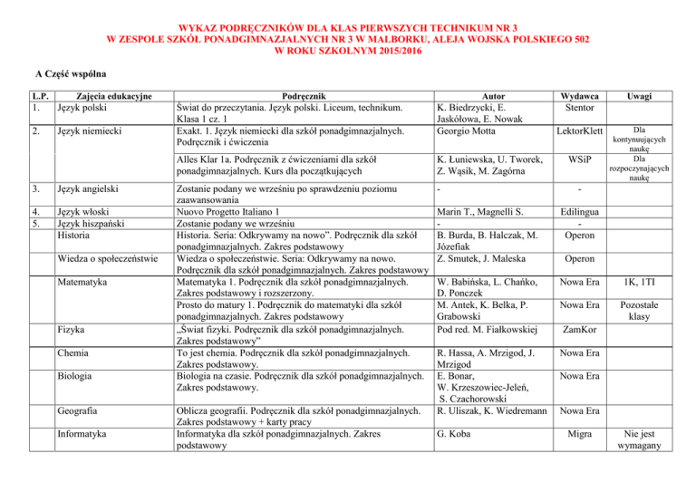 WYKAZ PODRĘCZNIKÓW DLA KLAS PIERWSZYCH TECHNIKUM NR 3 W ZESPOLE SZKÓŁ PONADGIMNAZJALNYCH NR 3 W MALBORKU, ALEJA WOJSKA POLSKIEGO 502 W ROKU SZKOLNYM 2015/2016 A Część wspólna L.P. Zajęcia edukacyjne 1. Język polski 2. Język niemiecki 3. Język angielski 4. 5. Język włoski Język hiszpański Historia Wiedza o społeczeństwie Matematyka Fizyka Chemia Biologia Geografia Informatyka Podręcznik Autor Świat do przeczytania. Język polski. Liceum, technikum. Klasa 1 cz. 1 Exakt. 1. Język niemiecki dla szkół ponadgimnazjalnych. Podręcznik i ćwiczenia K. Biedrzycki, E. Jaskółowa, E. Nowak Georgio Motta Alles Klar 1a. Podręcznik z ćwiczeniami dla szkół ponadgimnazjalnych. Kurs dla początkujących K. Łuniewska, U. Tworek, Z. Wąsik, M. Zagórna Zostanie podany we wrześniu po sprawdzeniu poziomu zaawansowania Nuovo Progetto Italiano 1 Zostanie podany we wrześniu Historia. Seria: Odkrywamy na nowo”. Podręcznik dla szkół ponadgimnazjalnych. Zakres podstawowy Wiedza o społeczeństwie. Seria: Odkrywamy na nowo. Podręcznik dla szkół ponadgimnazjalnych. Zakres podstawowy Matematyka 1. Podręcznik dla szkół ponadgimnazjalnych. Zakres podstawowy i rozszerzony. Prosto do matury 1. Podręcznik do matematyki dla szkół ponadgimnazjalnych. Zakres podstawowy „Świat fizyki. Podręcznik dla szkół ponadgimnazjalnych. Zakres podstawowy” To jest chemia. Podręcznik dla szkół ponadgimnazjalnych. Zakres podstawowy. Biologia na czasie. Podręcznik dla szkół ponadgimnazjalnych. Zakres podstawowy. - Oblicza geografii. Podręcznik dla szkół ponadgimnazjalnych. Zakres podstawowy + karty pracy Informatyka dla szkół ponadgimnazjalnych. Zakres podstawowy Wydawca Uwagi Stentor LektorKlett WSiP Dla kontynuujących naukę Dla rozpoczynających naukę - Marin T., Magnelli S. B. Burda, B. Halczak, M. Józefiak Z. Smutek, J. Maleska Edilingua Operon W. Babińska, L. Chańko, D. Ponczek M. Antek, K. Belka, P. Grabowski Pod red. M. Fiałkowskiej Nowa Era 1K, 1TI Nowa Era Pozostałe klasy R. Hassa, A. Mrzigod, J. Mrzigod E. Bonar, W. Krzeszowiec-Jeleń, S. Czachorowski R. Uliszak, K. Wiedremann Nowa Era G. Koba Operon ZamKor Nowa Era Nowa Era Migra Nie jest wymagany Edukacja dla bezpieczeństwa Edukacja dla bezpieczeństwa. Seria: Odkrywamy na nowo. M. Noniewicz, Z. Smutek, Podręcznik dla szkół ponadgimnazjalnych. Zakres podstawowy A.W. Nowk-Kowal Operon Podstawy przedsiębiorczości Podstawy przedsiębiorczości. Seria: Odkrywamy na nowo. Podręcznik dla szkół ponadgimnazjalnych Moje miejsce w kościele. Podręcznik do nauki religii dla pierwszej klasy szkół ponadgimnazjalnych Operon Religia Praca zbiorowa Red. Ks. J. Szpet i D. Jackowiak Św. Wojciech Nie jest wymagany Nie jest wymagany B. Część zawodowa - technik ekonomista L.P. Zajęcia edukacyjne 1. Podstawy ekonomii Brak podręcznika Podręcznik Autor - 2. Prawo Funkcjonowanie przedsiębiorstw. Cz. 1 Podstawy prawa J. Ablewicz 3. Ekonomika Brak podręcznika - 4. Marketing Podstawy marketingu. A. R. Nowaccy 5. Obsługa ekonomiczna przedsiębiorstwa B. Padurek 6. Technika biurowa Pracownia ekonomiczna. Cz. 1. Gospodarowanie zasobami majątkowymi. Obsługa programu magazynowosprzedażowego Brak podręcznika - Uwagi WSiP Nie jest wymagany Difin B. Padurek Nie jest wymagany Nie jest wymagany - technik hotelarstwa L.P. Zajęcia edukacyjne 1. Podstawy hotelarstwa 2. - Wydawca - Organizacja pracy w hotelarstwie Podręcznik Podstawy hotelarstwa i usługi dodatkowe Rezerwacja usług hotelarskich Obsługa gości w recepcji Autor W. Drogoń, B. Granecka Wrzosek Wydawca WSiP W. Drogoń WSiP W. Drogoń WSiP Uwagi Nie jest wymagany Nie jest wymagany Nie jest wymagany 3. 4. 5. 6. Marketing usług hotelarskich Obsługa konsumenta Działalność gospodarcza w hotelarstwie Język angielski zawodowy Organizacja pracy służby pięter W. Drogoń, B. GraneckaWrzosek WSiP Marketing w hotelarstwie J. Center WSiP Usługi żywieniowe w hotelarstwie Brak podręcznika B. Granecka-Wrzosek - WSiP - Highly recommended: English for the hotel and catering industry. New edition Język niemiecki zawodowy Zimmer frei: Deutsch im Hotel. Lehrbuch i Arbeitsbuch. Stott T., Revell R. 7. Obsługa hotelarska Brak podręcznika - 8. Obsługa informatyczna w hotelarstwie Obsługa informatyczna w hotelarstwie M. Milewska, A. Stasiak U.Cohen, N.Grandi, C. Lemcke Nie jest wymagany Nie jest wymagany Oxford Langenscheidt WSiP Nie jest wymagany Wydawca WSiP/REA Uwagi Polskie Wyd. Ekonomiczne - Nie jest wymagany - technik żywienia i usług gastronomicznych L.P. Zajęcia edukacyjne 1. Wyposażenie i zasady bhp w gastronomii Podręcznik Gastronomia T. 1. Wyposażenie i zasady bezpieczeństwa w gastronomii 2. Marketing w gastronomii Marketing w gastronomii Autor M. Zienkiewicz, A. Kasperek, M. Kondratowicz J. Sala 3. Ekonomika i organizacja w gastronomii Zasady żywienia Technologia gastronomiczna z towaroznawstwem Usługi gastronomiczne Brak podręcznika - Zasady żywienia. Cz. 1 i 2 Sporządzanie napojów i potraw. Towaroznawstwo i przechowywanie żywności D. Czerwińska A. Kmiołek Sporządzanie i ekspedycja potraw i napojów. Cz. 1 Technologia gastronomiczna Sporządzanie i ekspedycja potraw i napojów. Cz. 2 Technologia gastronomiczna Brak podręcznika A. Kmiołek WSiP A. Kmiołek WSiP - - Brak podręcznika - - 4. 5. 6. 7. 8. Obsługa informatyczna w gastronomii Organizacja i technika obsługi konsumenta WSiP/REA WSiP - technik obsługi turystycznej L.P. Zajęcia edukacyjne 1. Podstawy turystyki 2. 3. 4. 5. 6. 7. 8. Podstawy działalności gospodarczej w turystyce Marketing usług turystycznych Geografia turystyczna Podręcznik Wydawca REA Brak podręcznika Autor B. Steblik-Wlaźlak B. Cymańska-Garbowska - Marketing usług turystycznych R. Tylińska WSiP/REA Geografia turystyczna. Cz. 1 Stebnik-Wlaźlak B., Rzepka L. - Podstawy turystyki Organizacja imprez i usług Brak podręcznika turystycznych Język angielski zawodowy English for International Tourism Jęz