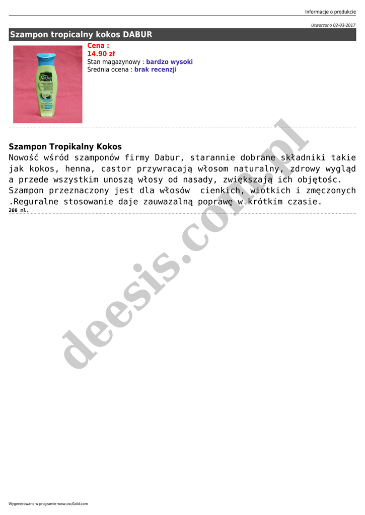 Informacje o produkcie Utworzono 02-03-2017 Szampon tropicalny kokos DABUR Cena : 14.90 zł m .p l Stan magazynowy : bardzo wysoki Średnia ocena : brak recenzji Szampon Tropikalny Kokos Nowość wśród szamponów firmy Dabur, starannie dobrane składniki takie jak kokos, henna, castor przywracają włosom naturalny, zdrowy wygląd a przede wszystkim unoszą włosy od nasady, zwiększają ich objętośc. Szampon przeznaczony jest dla włosów cienkich, wiotkich i zmęczonych .Reguralne stosowanie daje zauwazalną poprawę w krótkim czasie. de es is .c o 200 ml. Wygenerowano w programie www.oscGold.com