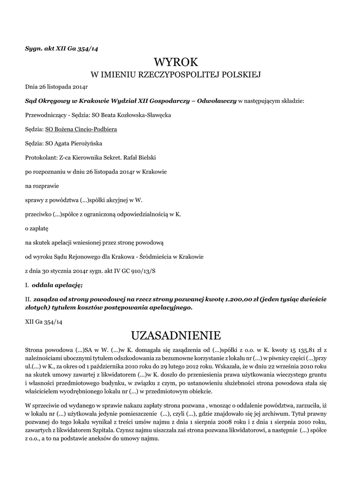 Sygn. akt XII Ga 354/14 WYROK W IMIENIU RZECZYPOSPOLITEJ POLSKIEJ Dnia 26 listopada 2014r Sąd Okręgowy w Krakowie Wydział XII Gospodarczy – Odwoławczy w następującym składzie: Przewodniczący - Sędzia: SO Beata Kozłowska-Sławęcka Sędzia: SO Bożena Cincio-Podbiera Sędzia: SO Agata Pierożyńska Protokolant: Z-ca Kierownika Sekret. Rafał Bielski po rozpoznaniu w dniu 26 listopada 2014r w Krakowie na rozprawie sprawy z powództwa (...)spółki akcyjnej w W. przeciwko (...)spółce z ograniczoną odpowiedzialnością w K. o zapłatę na skutek apelacji wniesionej przez stronę powodową od wyroku Sądu Rejonowego dla Krakowa - Śródmieścia w Krakowie z dnia 30 stycznia 2014r sygn. akt IV GC 910/13/S I. oddala apelację; II. zasądza od strony powodowej na rzecz strony pozwanej kwotę 1.200,00 zł (jeden tysiąc dwieście złotych) tytułem kosztów postępowania apelacyjnego. XII Ga 354/14 UZASADNIENIE Strona powodowa (...)SA w W. (...)w K. domagała się zasądzenia od (...)spółki z o.o. w K. kwoty 15 135,81 zł z należnościami ubocznymi tytułem odszkodowania za bezumowne korzystanie z lokalu nr (...) w piwnicy części (...)przy ul.(...) w K., za okres od 1 października 2010 roku do 29 lutego 2012 roku. Wskazała, że w dniu 22 września 2010 roku na skutek umowy zawartej z likwidatorem (...)w K. doszło do przeniesienia prawa użytkowania wieczystego gruntu i własności przedmiotowego budynku, w związku z czym, po ustanowieniu służebności strona powodowa stała się właścicielem wyodrębnionego lokalu nr (...) w przedmiotowym obiekcie. W sprzeciwie od wydanego w sprawie nakazu zapłaty strona pozwana , wnosząc o oddalenie powództwa, zarzuciła, iż w lokalu nr (...) użytkowała jedynie pomieszczenie (...), czyli (...), gdzie znajdowało się jej archiwum. Tytuł prawny pozwanej do tego lokalu wynikał z treści umów najmu z dnia 1 sierpnia 2008 roku i z dnia 1 sierpnia 2010 roku, zawartych z likwidatorem Szpitala. Czynsz najmu uiszczała zaś strona pozwana likwidatorowi, a następnie (...) spółce z o.o., a to na podstawie aneksów do umowy najmu. Sąd Rejonowy wskazał jako niesporne okoliczności: korzystania przez stronę pozwaną z pomieszczenia nr (...) (...)położonego w piwnicy budynku przy ul.(...) oraz przejścia własności budynku na stronę powodową , co dokumentuje wpis w księdze wieczystej z dnia 28 kwietnia 2011 roku. Ponadto Sąd Rejonowy w oparciu o treść dokumentów, zeznań świadków i strony pozwanej ustalił, iż w dniu 1 sierpnia 2008 roku strona pozwana wynajęła od likwidatora Szpitala jedno pomieszczenie w piwnicy, nr (...), zaś innych pomieszczeń jej nie udostępniono, ani też nie objęła ich w posiadanie/ nr (...)i nr (...). Nowa umowa najmu na czas nieokreślony została zawarta pomiędzy tymi stronami w dniu 1 sierpnia 2010 roku. Ponieważ wynajmującym w miejsce likwidatora zostało (...)doszło do zmian umowy aneksami z października 2010 roku, stycznia i kwietnia 2011 roku oraz z kwietnia 2012 roku.Do dnia 29 lutego 2012 roku czynsz najmu uiszczała strona pozwana (...), zgodnie z treścią aneksów. Podczas spotkania stron w dniu 10 lutego 2012 roku pozwana spółka nie wyraziła woli zawarcia umowy z (...) ze względu na wygórowaną stawkę czynszu, po czym w dniu 23 maja 2012 roku zdała powódce lokal, zgodnie z wyznaczonym przez właściciela terminem. Do dnia 10 lutego 2012 roku strona pozwana nie dysponowała wiedzą o zmianie po stronie właściciela budynku. Następnie, pismem z dnia 21 sierpnia 2012 roku (...) spółka z o.o. w K. poinformowała pozwaną spółkę, w powołaniu na uchwałę (...)z dnia 31 lipca 2012 roku/ nr (...)/ o wstąpieniu w miejsce dotychczasowego wynajmującego. Protokół zdawczy lokalu z dnia 23 maja 2012 roku , z którego wynika, iż wynajmowane były pomieszczenia nr (...) i nr (...), podpisała za stronę pozwana przełożona pielęgniarek, a za powódkę Ł. C.. Świadkowi temu Sąd nie dal wiary odnośnie zakresu w jakim pozwana zajmowała pomieszczenia piwniczne albowiem zeznania te nie znalazły potwierdzenia w innych dowodach, przełożona kategorycznie zeznała, iż zdała jedno, zajmowane pomieszczenie, zaś nawet faktury strony powodowej nie zawierały oznaczenia pomieszczeń. Sąd Rejonowy wyrokiem z dnia 30 stycznia 2014 roku oddalił powództwo w całości. Sąd ten zważył, iż żądanie strony powodowej oparte o treść art. 224 par. 2 kc i art. 225 kc w związku z art. 230 kc nie znajduje uzasadnienia w zebranym materiale dowodowym. W szczególności Sąd wskazał, na tle art. 678 par. 1 kc, że skoro strona pozwana zawarła umowę najmu z likwidatorem Szpitala w 2008 roku, a następnie w 2010 roku, to strona powodowa, nabywając własność obiektu z dniem 22 września 2010 roku, wstąpiła w stosunek najmu w miejsce zbywcy czyli likwidatora, z mocy prawa. Wstąpienie bowiem nabywcy w miejsce zbywcy rzeczy najętej nie jest uzależnione od jakichkolwiek okoliczności, któryby ujawniały istnienie stosunku najmu wobec osób trzecich. Wraz z przekształceniem podmiotowym doszło do przejścia na nabywcę wszelkich praw i obowiązków. O ile więc najemca winien uiszczać czynsz do rąk nabywcy nieruchomości, o tyle obowiązek taki pozostawał zależny od wiedzy najemcy o powstałym przekształceniu. Wiedzą tą jednakże strona pozwana nie dysponowała skoro nie została zawiadomiona o zmianie po stronie właściciela ani przez (...), ani przez zbywcę. Uiszczanie umówionego czynszu do rąk zbywcy, w tej sytuacji, nie może więc rodzić po stronie najemcy obowiązku powtórnej zapłaty. Pomocniczo Sąd powołał się na treść art. 512 kc. Dowód na okoliczność, że nastąpiła zmiana po stronie właściciela obiektu spoczywał natomiast na stronie powodowej, która stosownego dowodu nie zaoferowała. Materiał dowodowy nie wykazał aby pozwana spółka dysponowała informacją o wstąpieniu w miejsce likwidatora (...), począwszy od 1 październik
