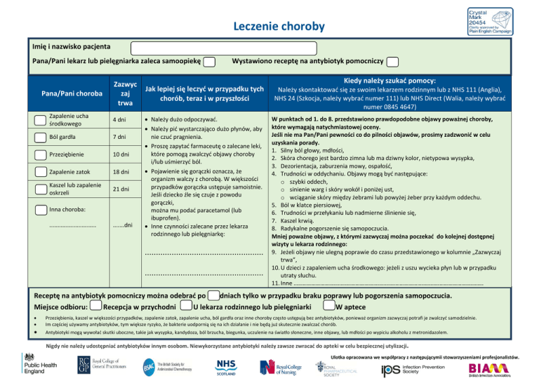 Leczenie choroby Imię i nazwisko pacjenta Pana/Pani lekarz lub pielęgniarka zaleca samoopiekę Wystawiono receptę na antybiotyk pomocniczy Pana/Pani choroba Zazwyc zaj trwa Zapalenie ucha środkowego 4 dni Ból gardła 7 dni Przeziębienie 10 dni Zapalenie zatok 18 dni Kaszel lub zapalenie oskrzeli Inna choroba: ............................. 21 dni .......dni Kiedy należy szukać pomocy: Jak lepiej się leczyć w przypadku tych chorób, teraz i w przyszłości Należy dużo odpoczywać. Należy pić wystarczająco dużo płynów, aby nie czuć pragnienia. Proszę zapytać farmaceutę o zalecane leki, które pomogą zwalczyć objawy choroby i/lub uśmierzyć ból. Pojawienie się gorączki oznacza, że organizm walczy z chorobą. W większości przypadków gorączka ustępuje samoistnie. Jeśli dziecko źle się czuje z powodu gorączki, można mu podać paracetamol (lub ibuprofen). Inne czynności zalecane przez lekarza rodzinnego lub pielęgniarkę: ..................................................... ..................................................... Należy skontaktować się ze swoim lekarzem rodzinnym lub z NHS 111 (Anglia), NHS 24 (Szkocja, należy wybrać numer 111) lub NHS Direct (Walia, należy wybrać numer 0845 4647) W punktach od 1. do 8. przedstawiono prawdopodobne objawy poważnej choroby, które wymagają natychmiastowej oceny. Jeśli nie ma Pan/Pani pewności co do pilności objawów, prosimy zadzwonić w celu uzyskania porady. 1. Silny ból głowy, mdłości, 2. Skóra chorego jest bardzo zimna lub ma dziwny kolor, nietypowa wysypka, 3. Dezorientacja, zaburzenia mowy, ospałość, 4. Trudności w oddychaniu. Objawy mogą być następujące: o szybki oddech, o sinienie warg i skóry wokół i poniżej ust, o wciąganie skóry między żebrami lub powyżej żeber przy każdym oddechu. 5. Ból w klatce piersiowej, 6. Trudności w przełykaniu lub nadmierne ślinienie się, 7. Kaszel krwią. 8. Radykalne pogorszenie się samopoczucia. Mniej poważne objawy, z którymi zazwyczaj można poczekać do kolejnej dostępnej wizyty u lekarza rodzinnego: 9. Jeżeli objawy nie ulegną poprawie do czasu przedstawionego w kolumnie „Zazwyczaj trwa”, 10. U dzieci z zapaleniem ucha środkowego: jeżeli z uszu wycieka płyn lub w przypadku utraty słuchu. 11. Inne ………………………………………………………………………………………………………………… Receptę na antybiotyk pomocniczy można odebrać po dniach tylko w przypadku braku poprawy lub pogorszenia samopoczucia. Miejsce odbioru: Recepcja w przychodni U lekarza rodzinnego lub pielęgniarki W aptece Przeziębienia, kaszel w większości przypadków, zapalenie zatok, zapalenie ucha, ból gardła oraz inne choroby często ustępują bez antybiotyków, ponieważ organizm zazwyczaj potrafi je zwalczyć samodzielnie. Im częściej używamy antybiotyków, tym większe ryzyko, że bakterie uodpornią się na ich działanie i nie będą już skutecznie zwalczać chorób. Antybiotyki mogą wywołać skutki uboczne, takie jak wysypka, kandydoza, ból brzucha, biegunka, uczulenie na światło słoneczne, inne objawy, lub mdłości po wypiciu alkoholu z metronidazolem. Nigdy nie należy udostępniać antybiotyków innym osobom. Niewykorzystane antybiotyki należy zawsze zwracać do apteki w celu bezpiecznej utylizacji. Ulotka opracowana we współpracy z następującymii stowarzyszeniami profesjonalistów.